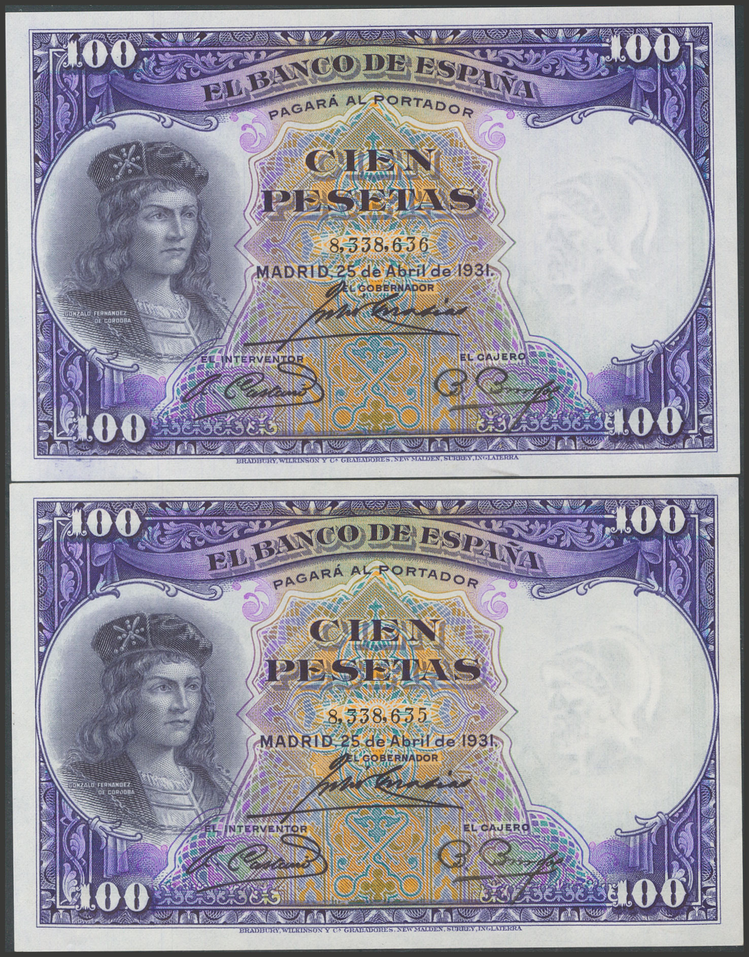 100 Pesetas. 25 de Abril de 1931. Pareja correlativa. Sin serie. (Edifil 2017: 360). Conserva todo su apresto original. SC-.
