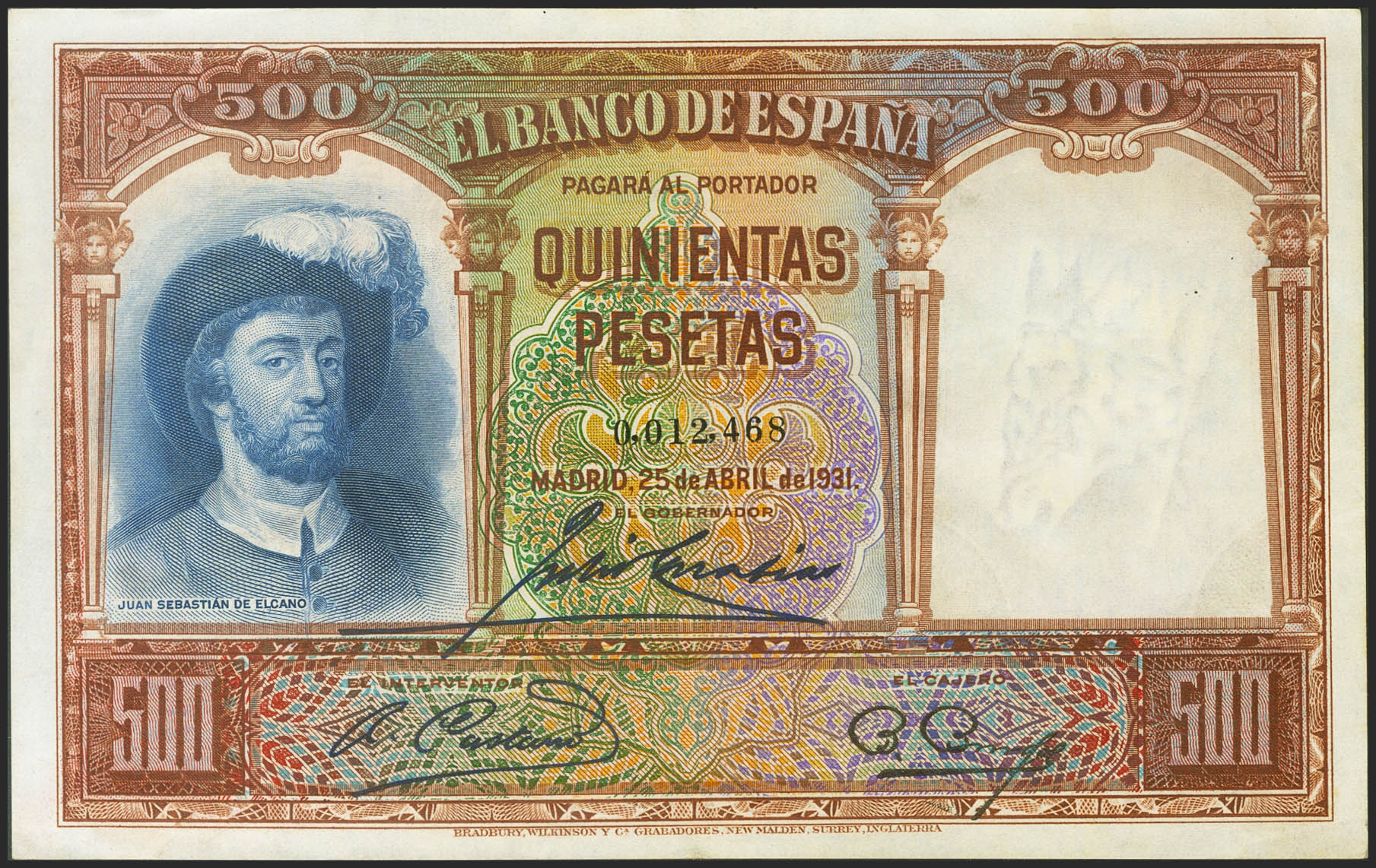 500 Pesetas. 25 de Abril de 1931. Sin serie. (Edifil 2021: 361). Presenta gran parte del apresto original. SC-.