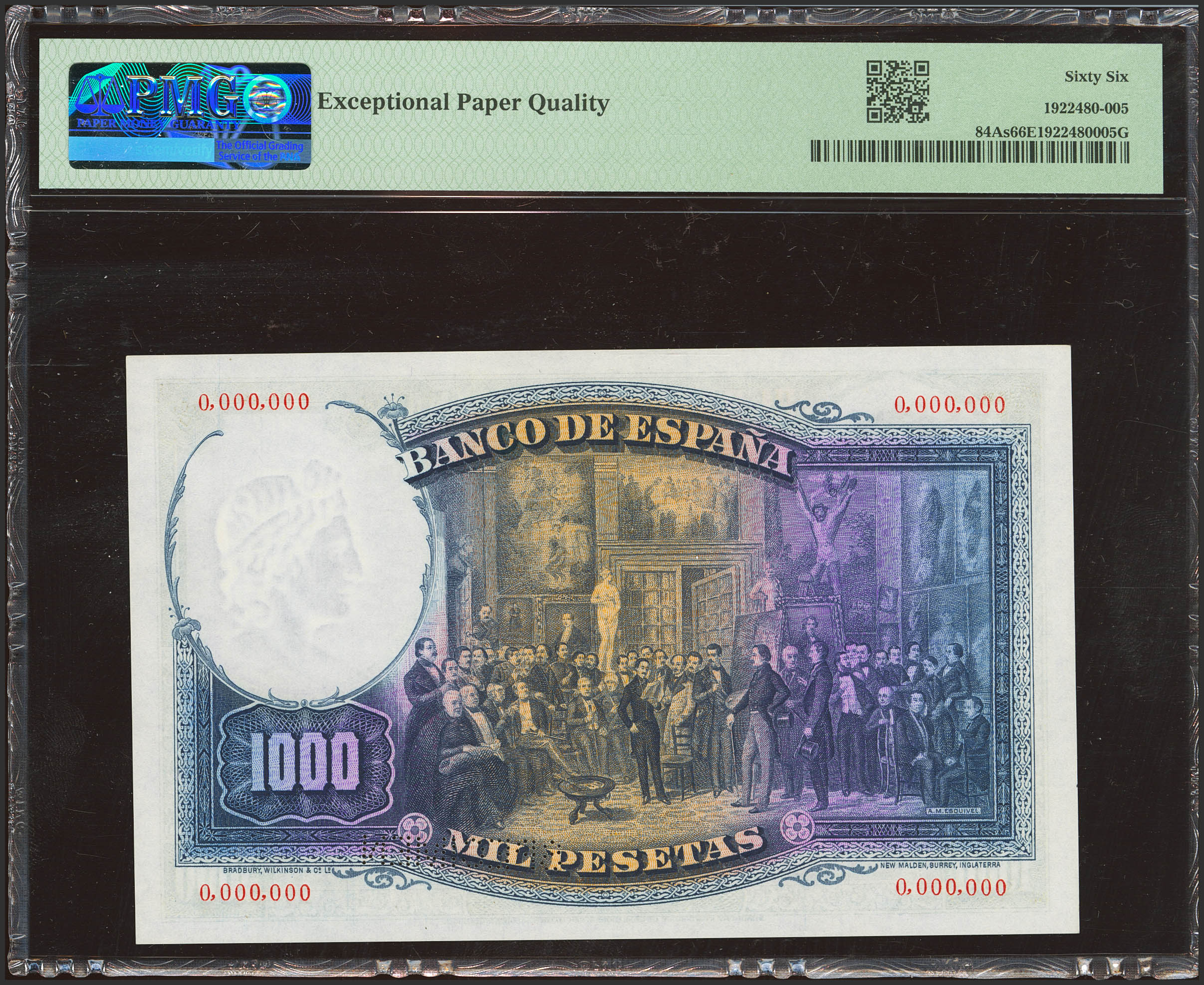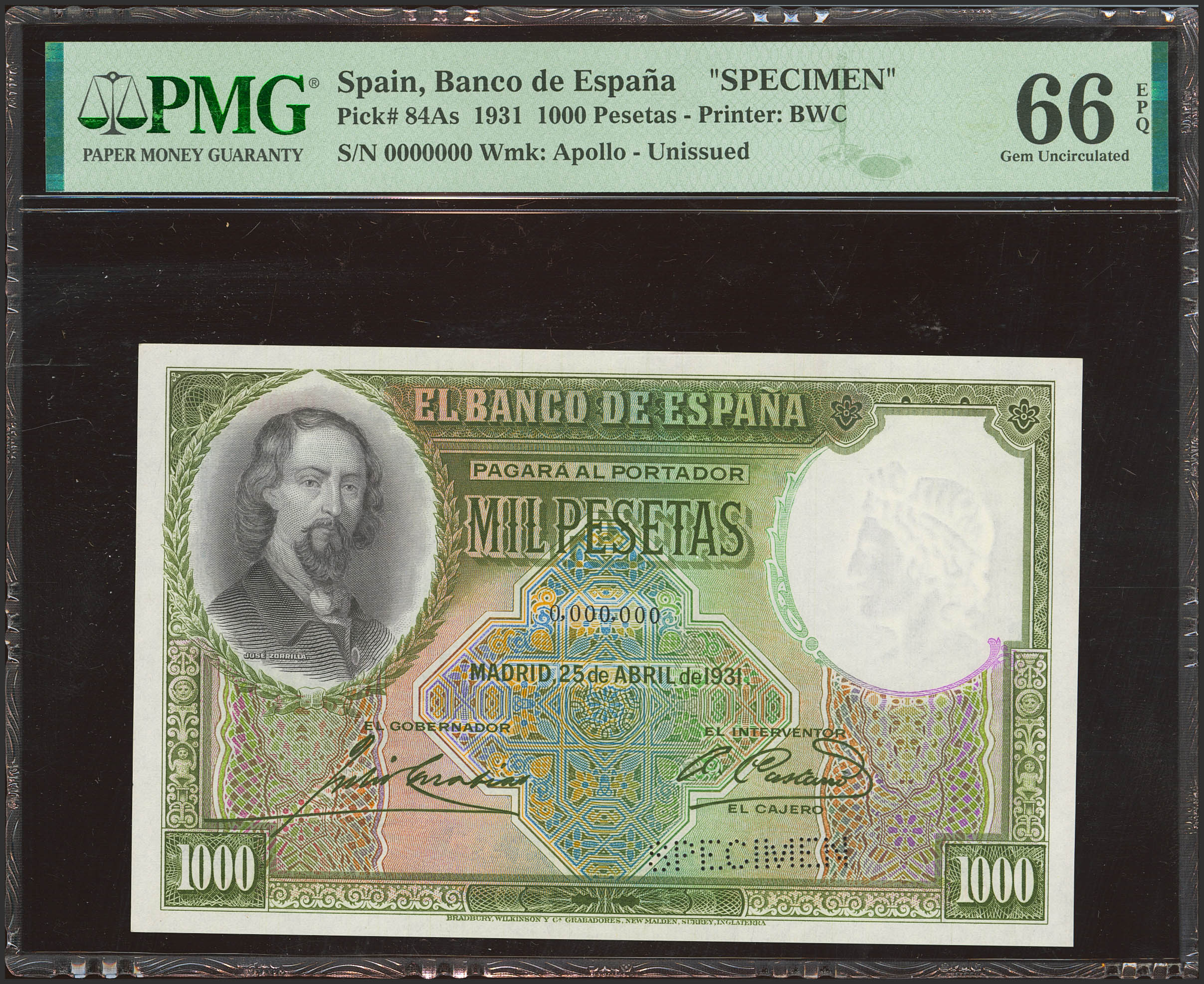 1000 Pesetas. 25 de Abril de 1931. Numeración 0000000, taladrado SPECIMEN en el lugar destinado a la firma del cajero. (Edifil 2023: 362M, Pick: 84As). Rarísimo, especialmente en esta excepcional calidad, apresto original. SC. Encapsulado PMG66EPQ.