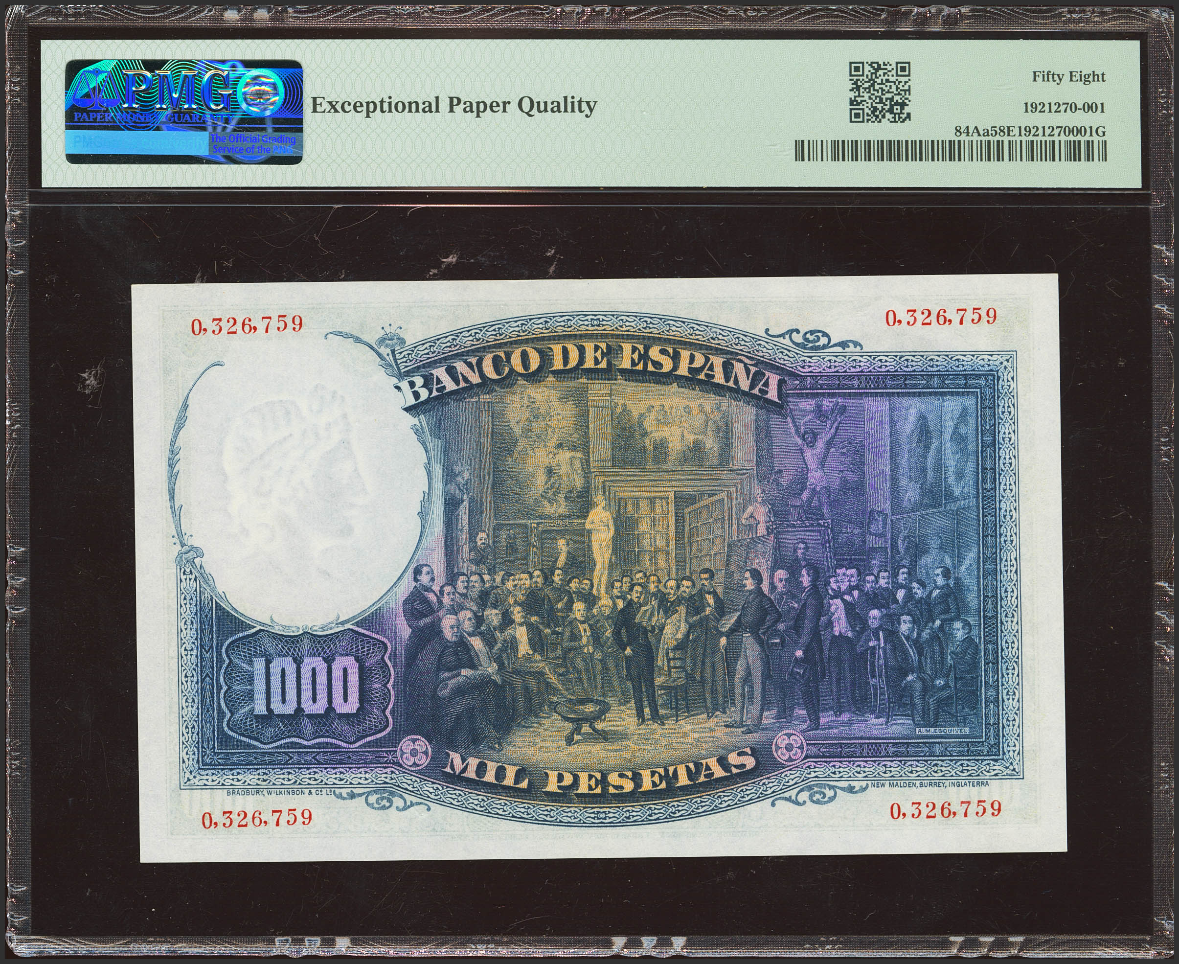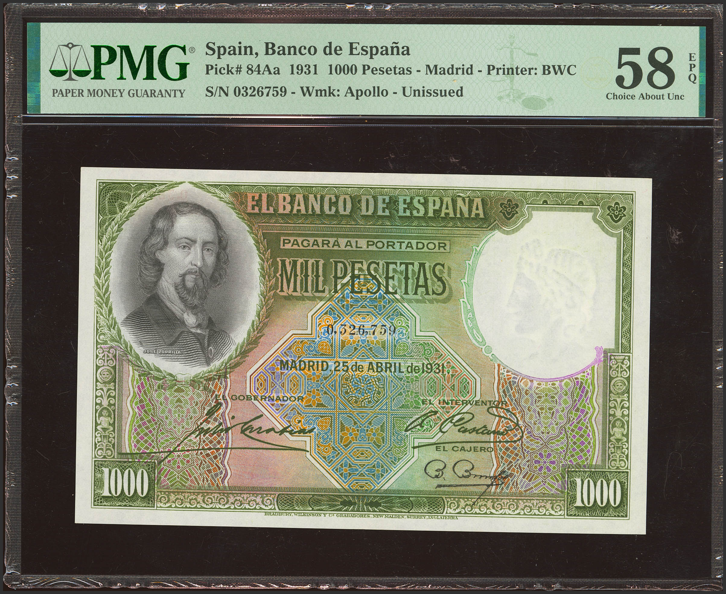 1000 Pesetas. 25 de Abril de 1931. Sin serie. (Edifil 2021: 362, Pick: 84Aa). Raro, apresto original. EBC+++. Encapsulado PMG58EPQ.