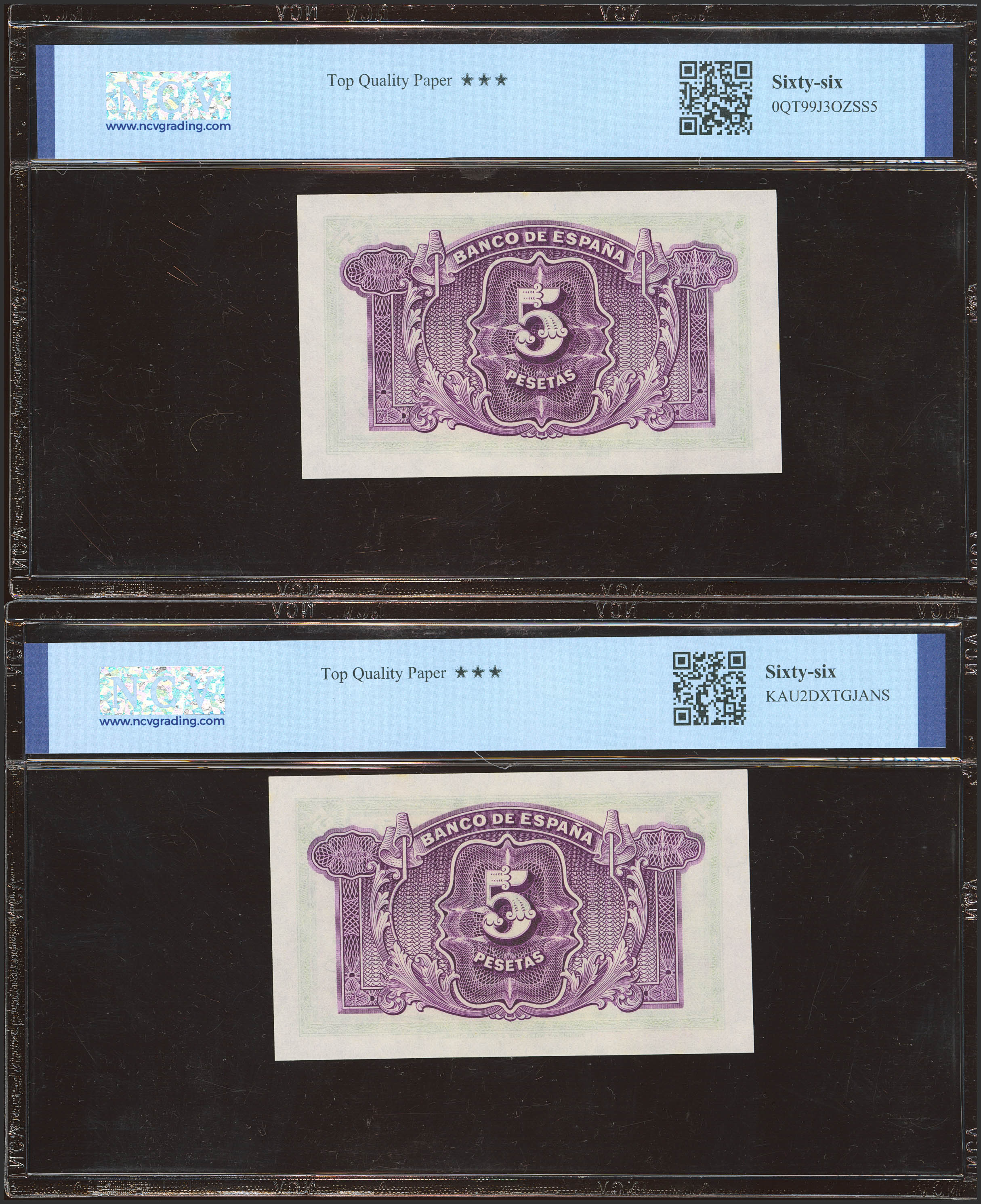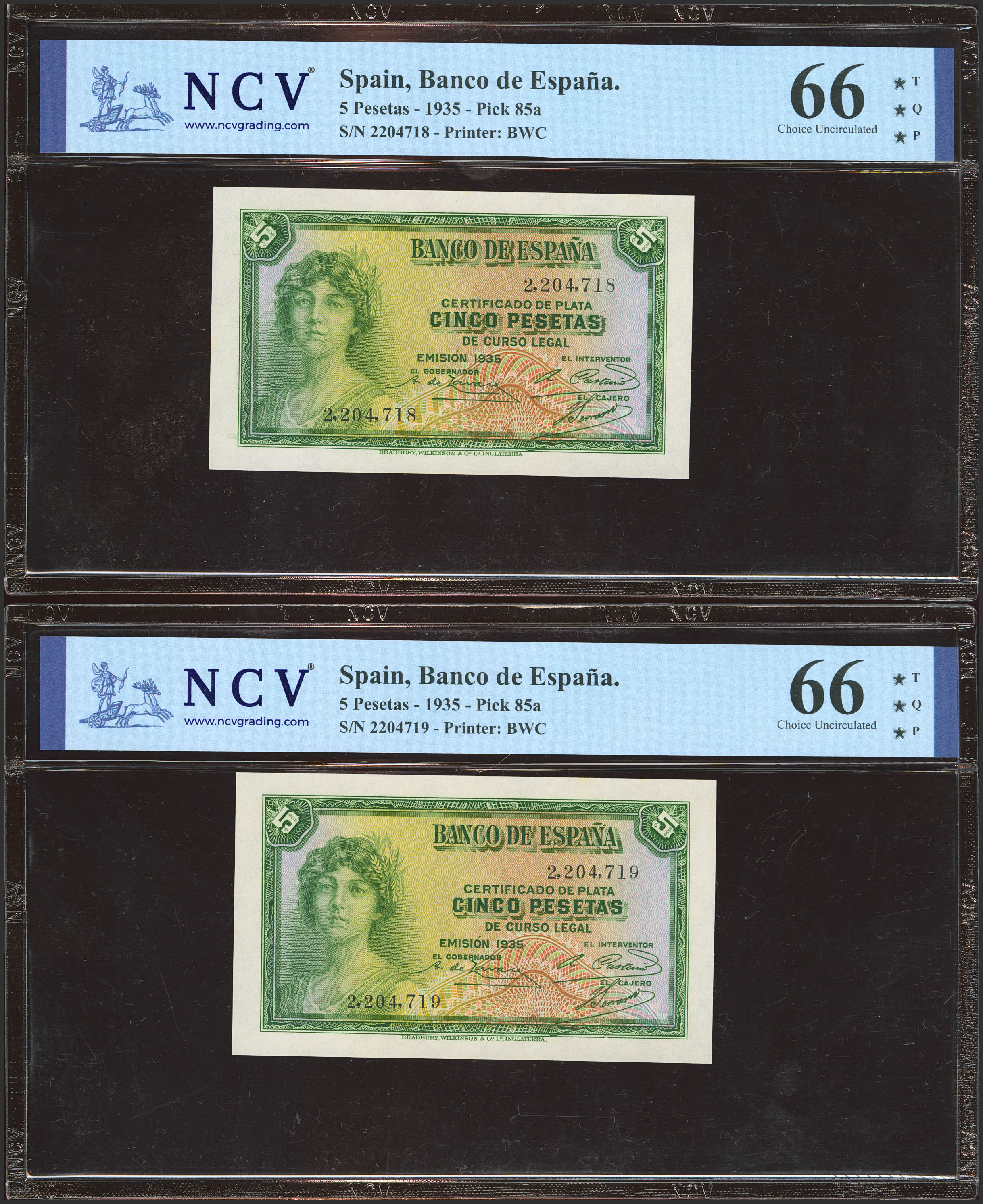 5 Pesetas. 1935. Certificado de Plata. Pareja correlativa. Sin serie. (Edifil 2023: 363, Pick: 85a). Apresto original. SC. Encapsulados NCV66TQP, ambos.