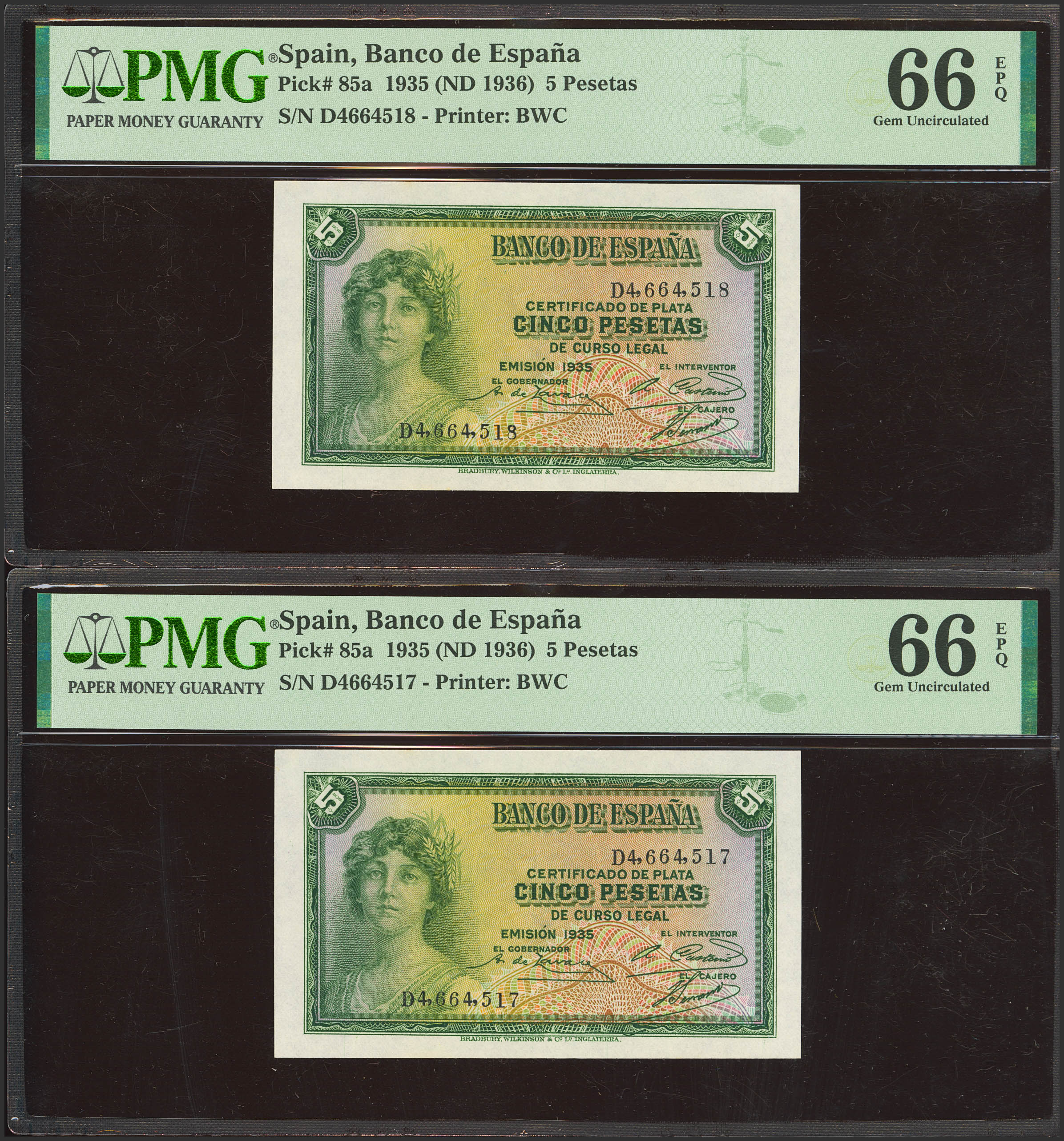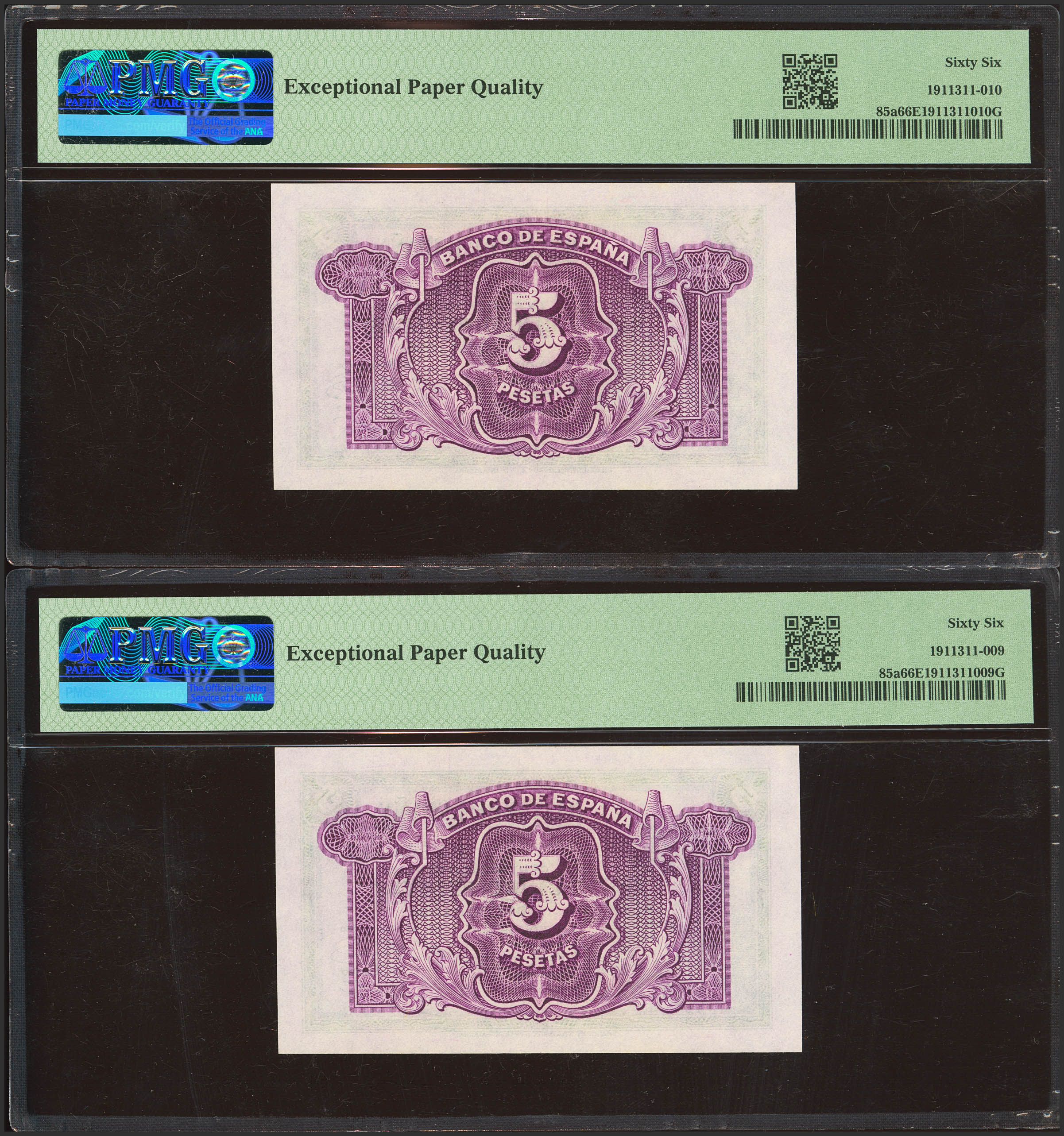 5 Pesetas. 1935. Pareja correlativa. Certificado de Plata. Serie D. (Edifil 2023: 363a, Pick: 85a). Apresto original. SC. Encapsulados PMG66EPQ, ambos.