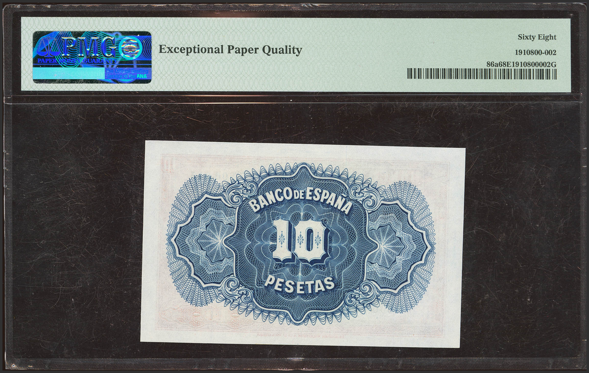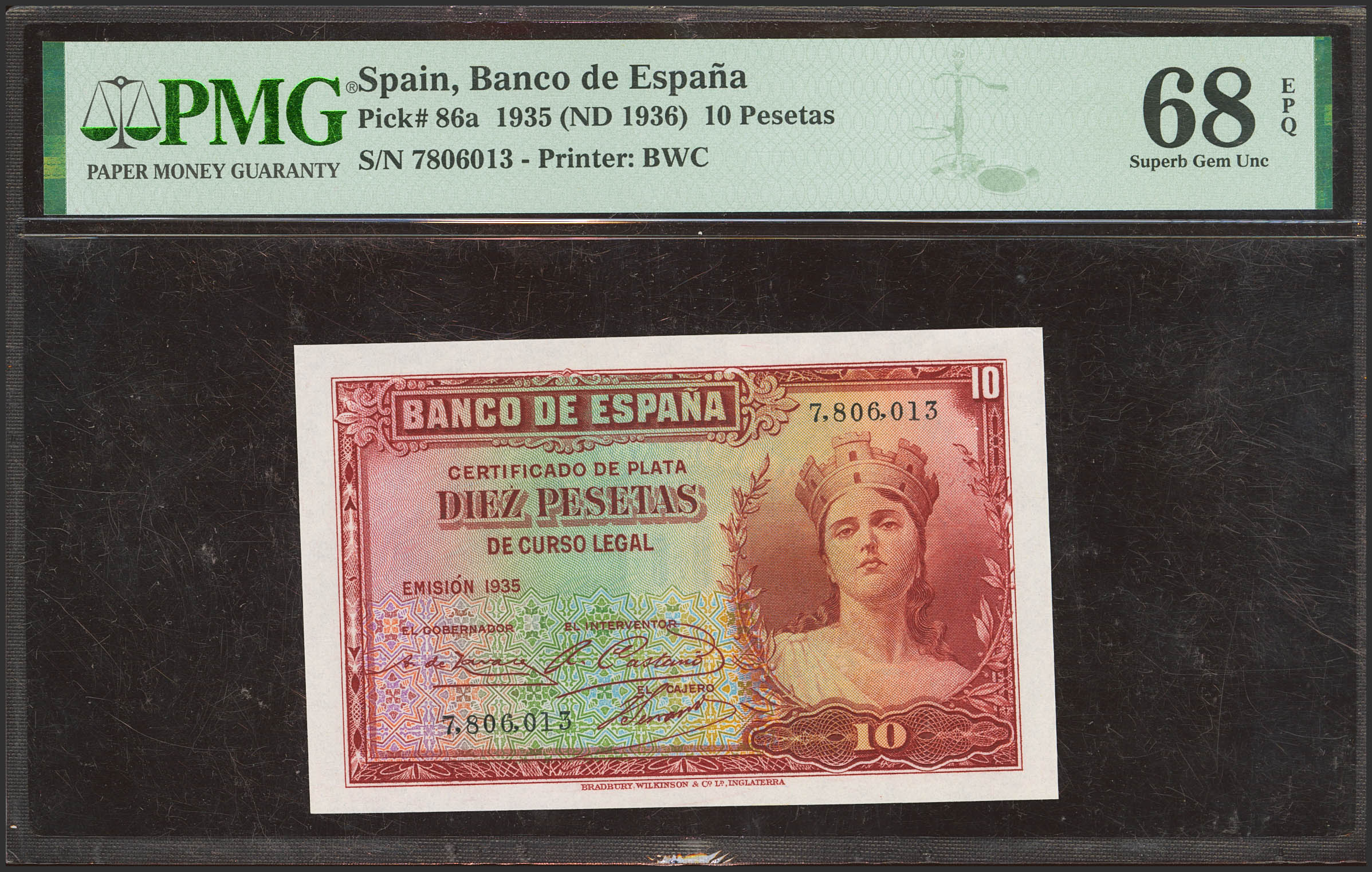 10 Pesetas. 1935. Certificado de Plata. Sin serie. (Edifil 2023: 364, 86a). Raro en esta excepcional calidad, apresto original. SC. Encapsulado PMG68EPQ.