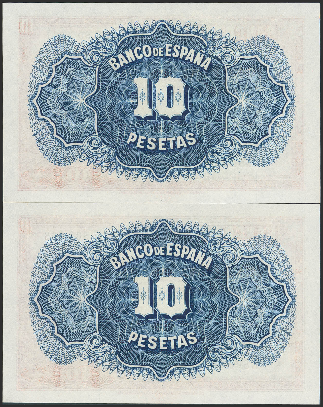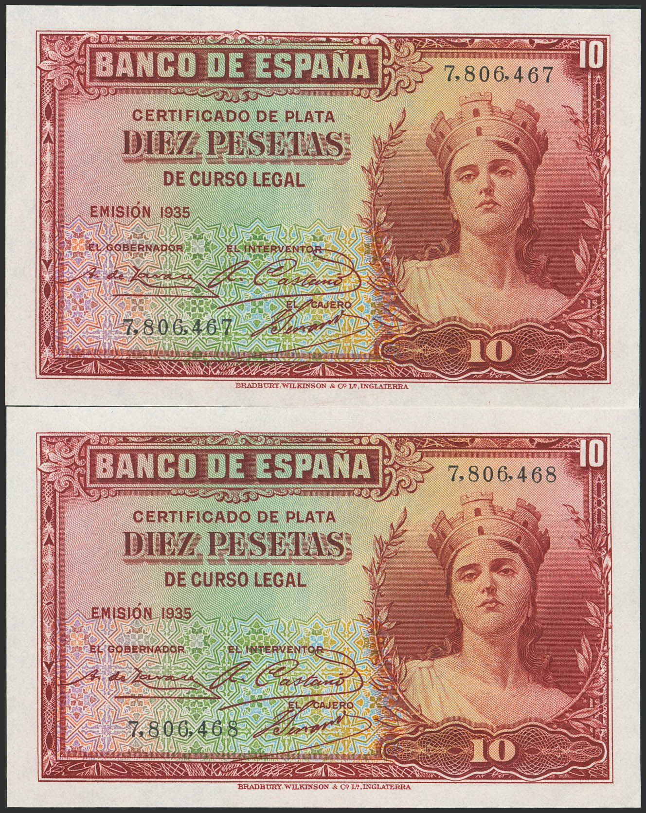 10 Pesetas. 1935. Certificado de Plata. Pareja correlativa. Sin serie. (Edifil 2023: 364). Conserva todo su apresto original. SC.