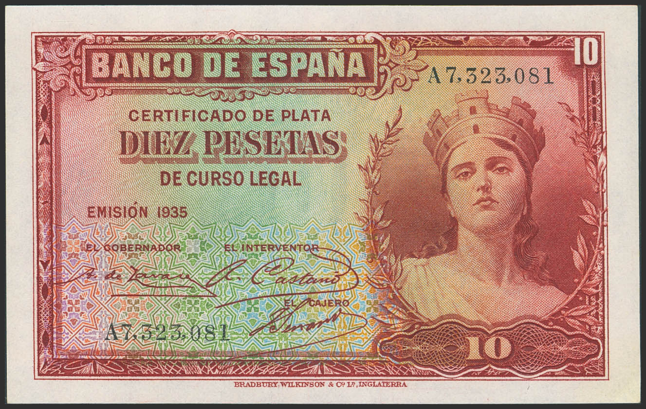 10 Pesetas. 1935. Certificado de Plata. Serie A. (Edifil 2023: 364a). Conserva todo su apresto original. SC.