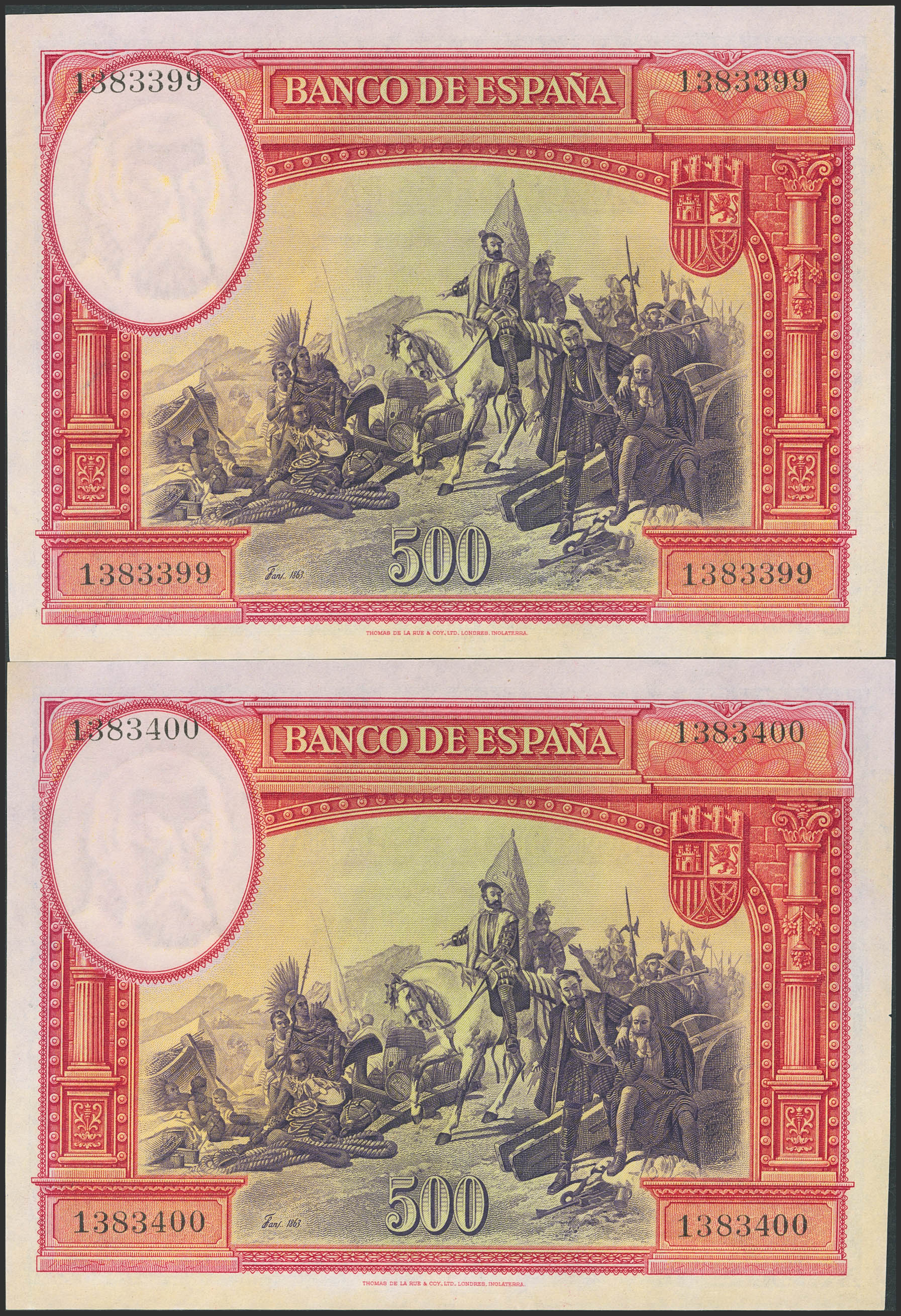 500 Pesetas. 7 de Enero de 1935. Pareja correlativa. Sin serie. (Edifil 2023: 365, Pick: 89). Sombritas del tiempo. SC.