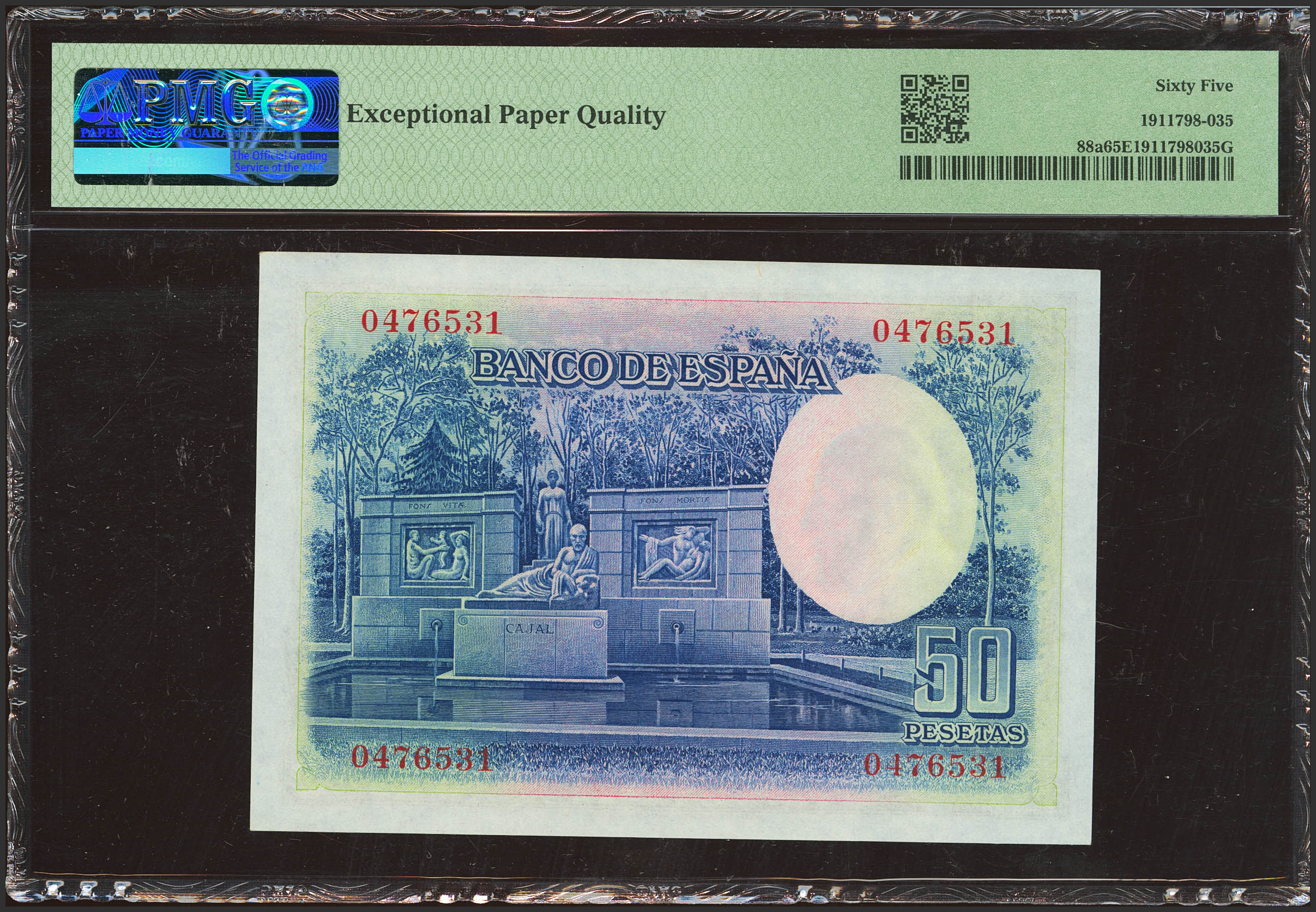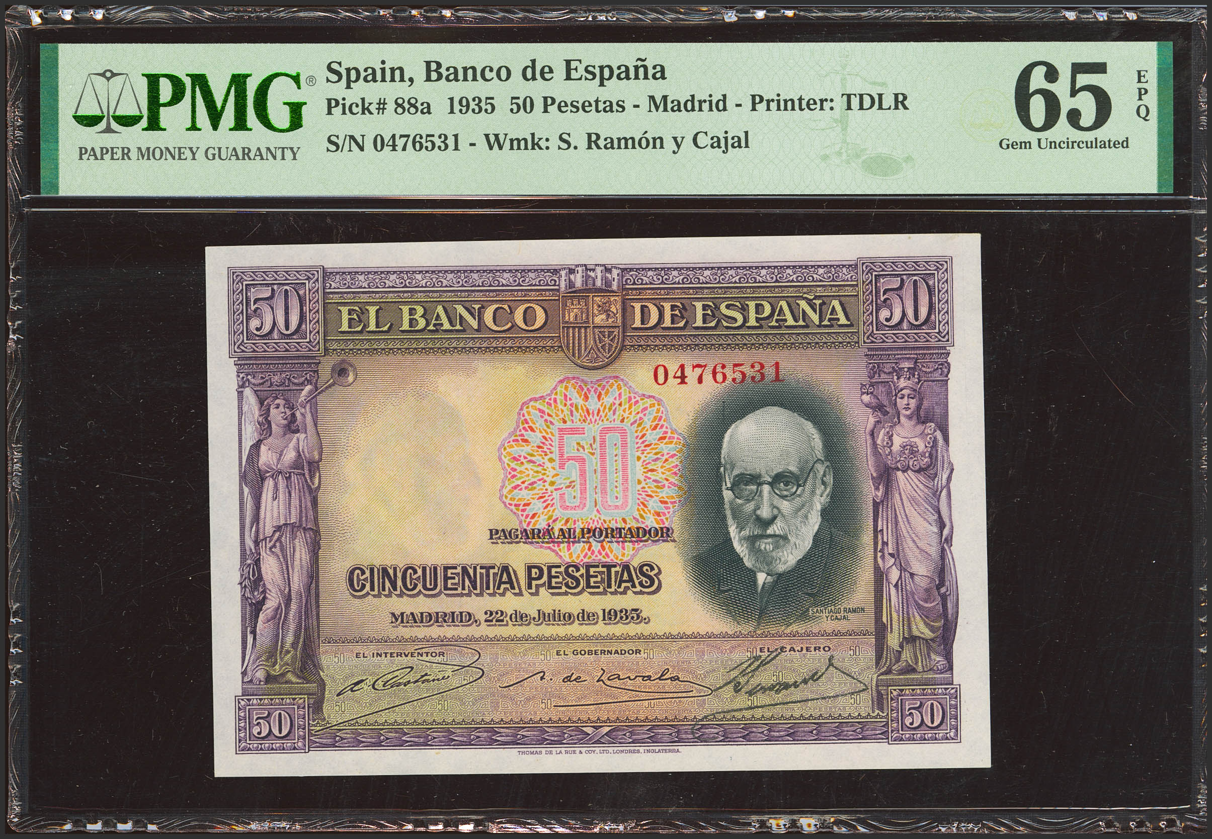 50 Pesetas. 22 de Julio de 1935. Sin serie. (Edifil 2023: 366, Pick: 88a). Inusual en esta calidad, apresto original. SC. Encapsulado PMG65EPQ.
