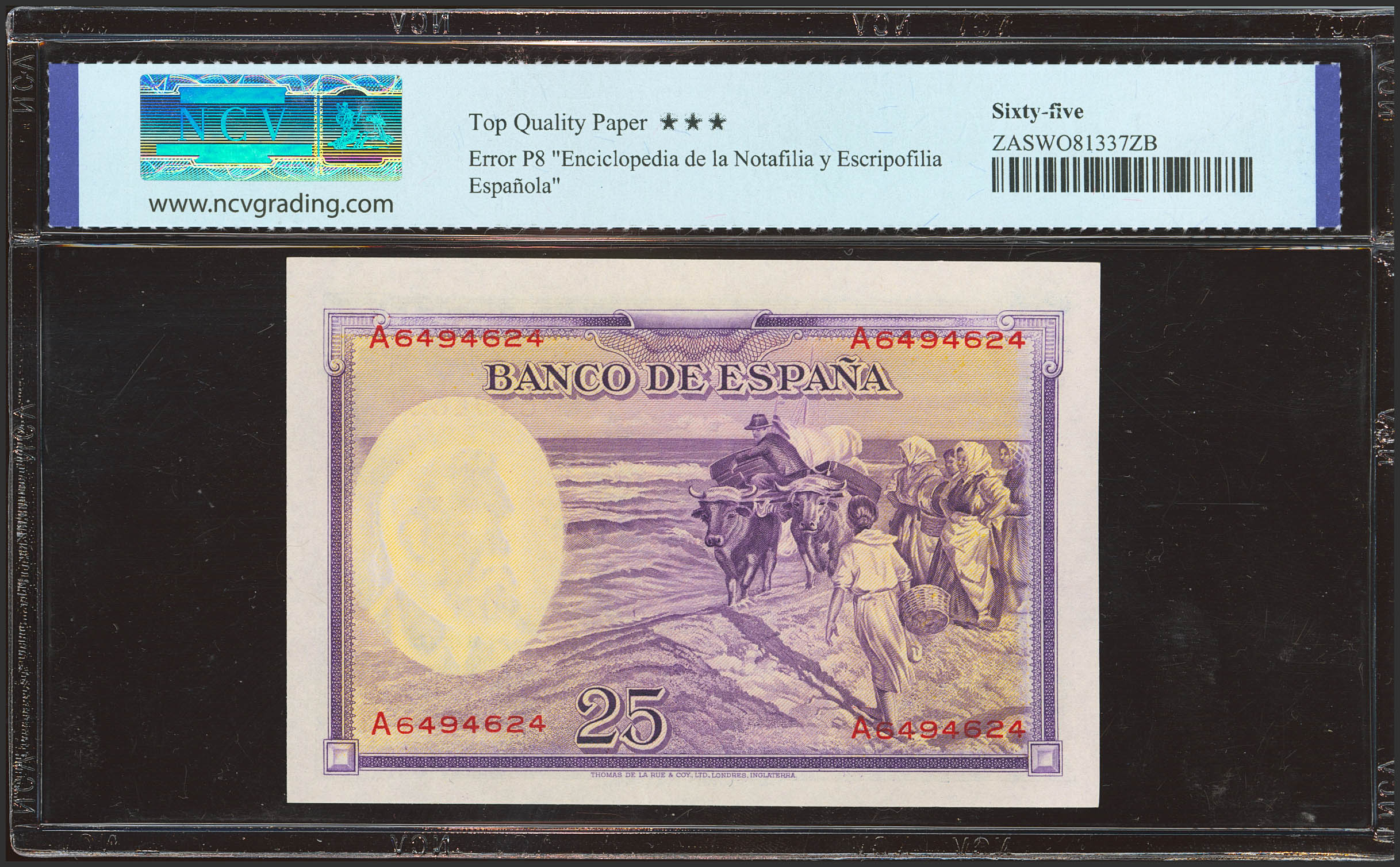25 Pesetas. 31 de Agosto de 1936. Serie A. (Edifil 2023: 367a, Pick: 87b). Apresto original. Encapsulado NCV65TQP.