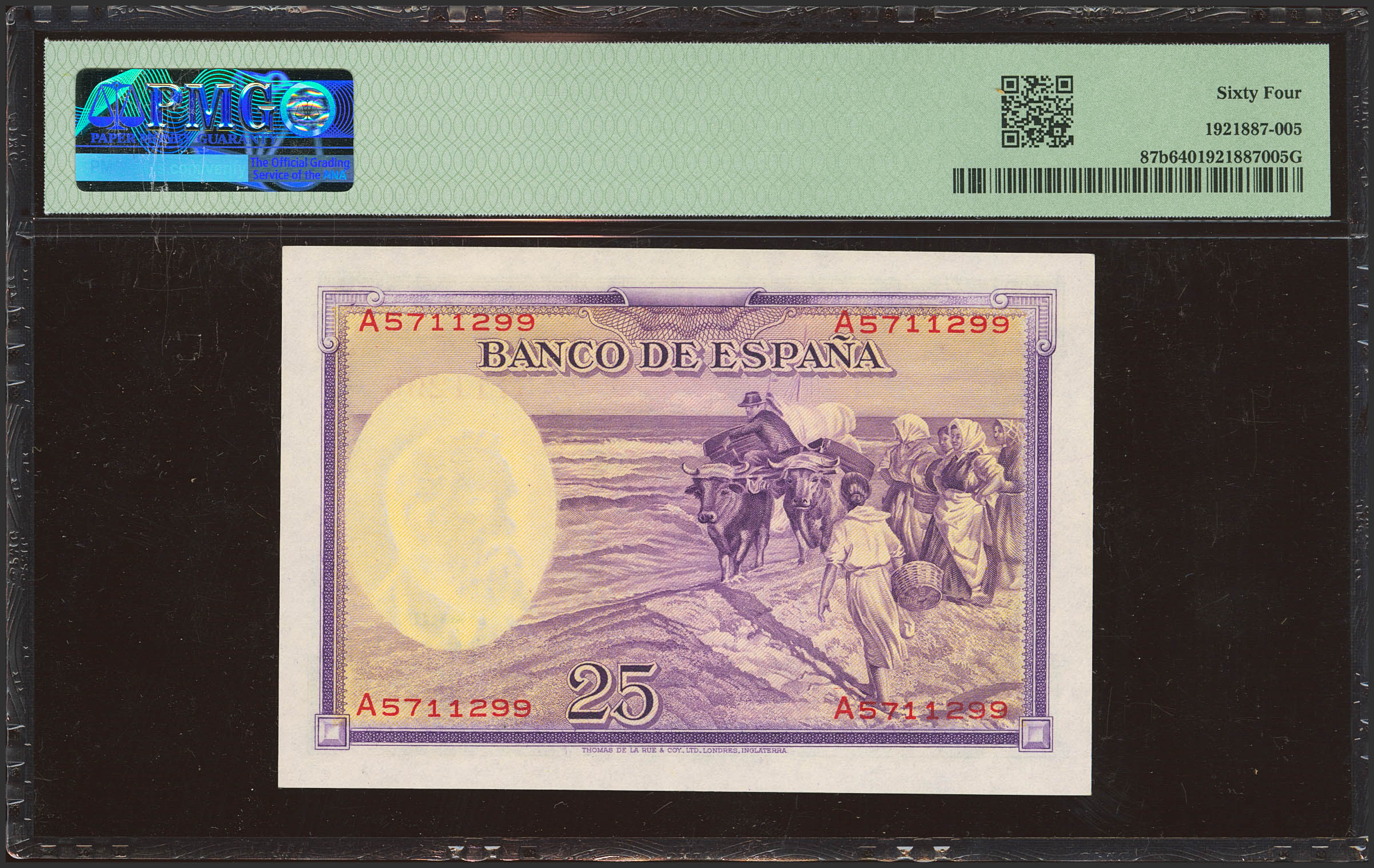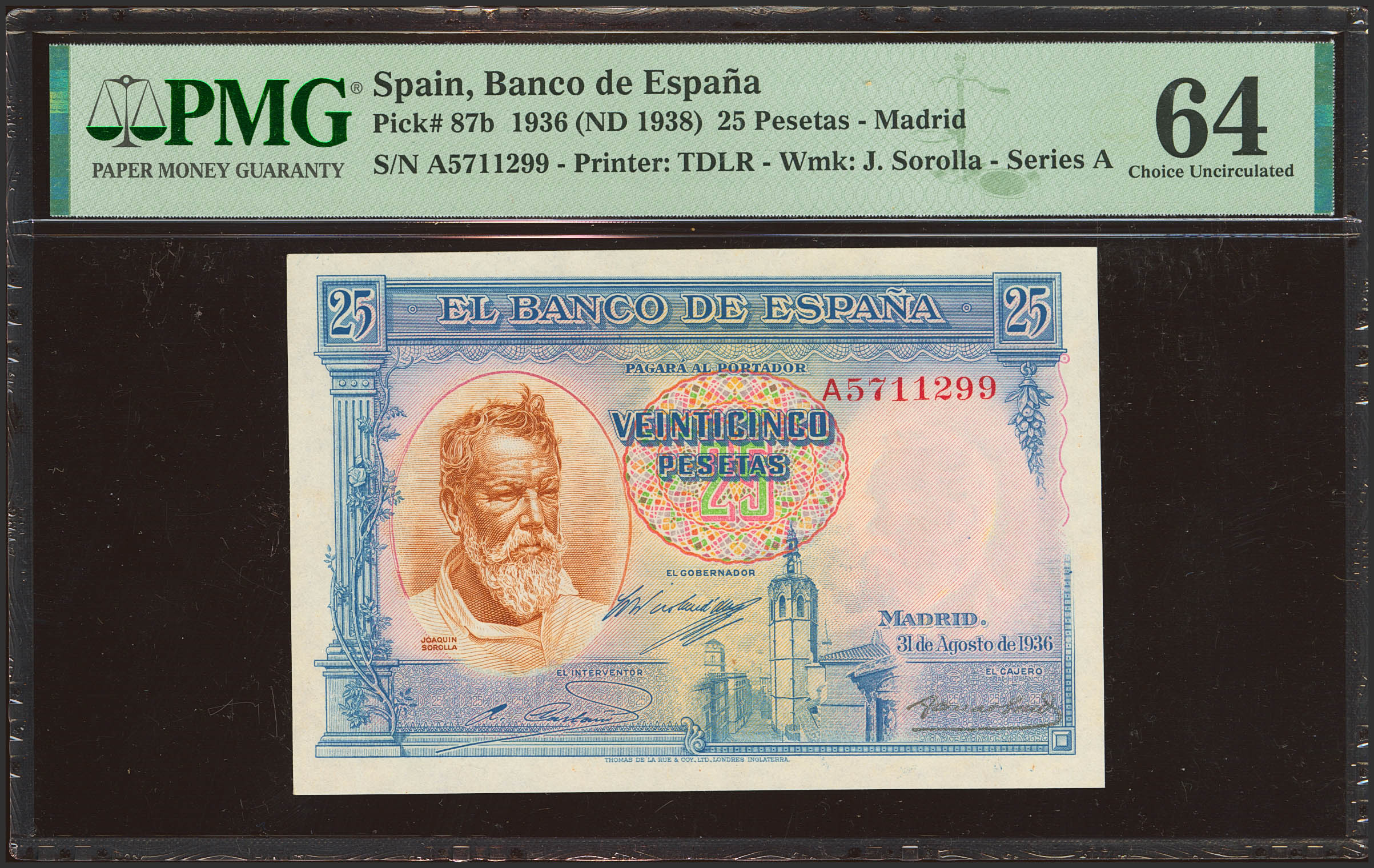25 Pesetas. 31 de Agosto de 1936. Serie A. (Edifil 2023: 367a, Pick: 87b). Inusual en esta calidad. Encapsulado PMG64.