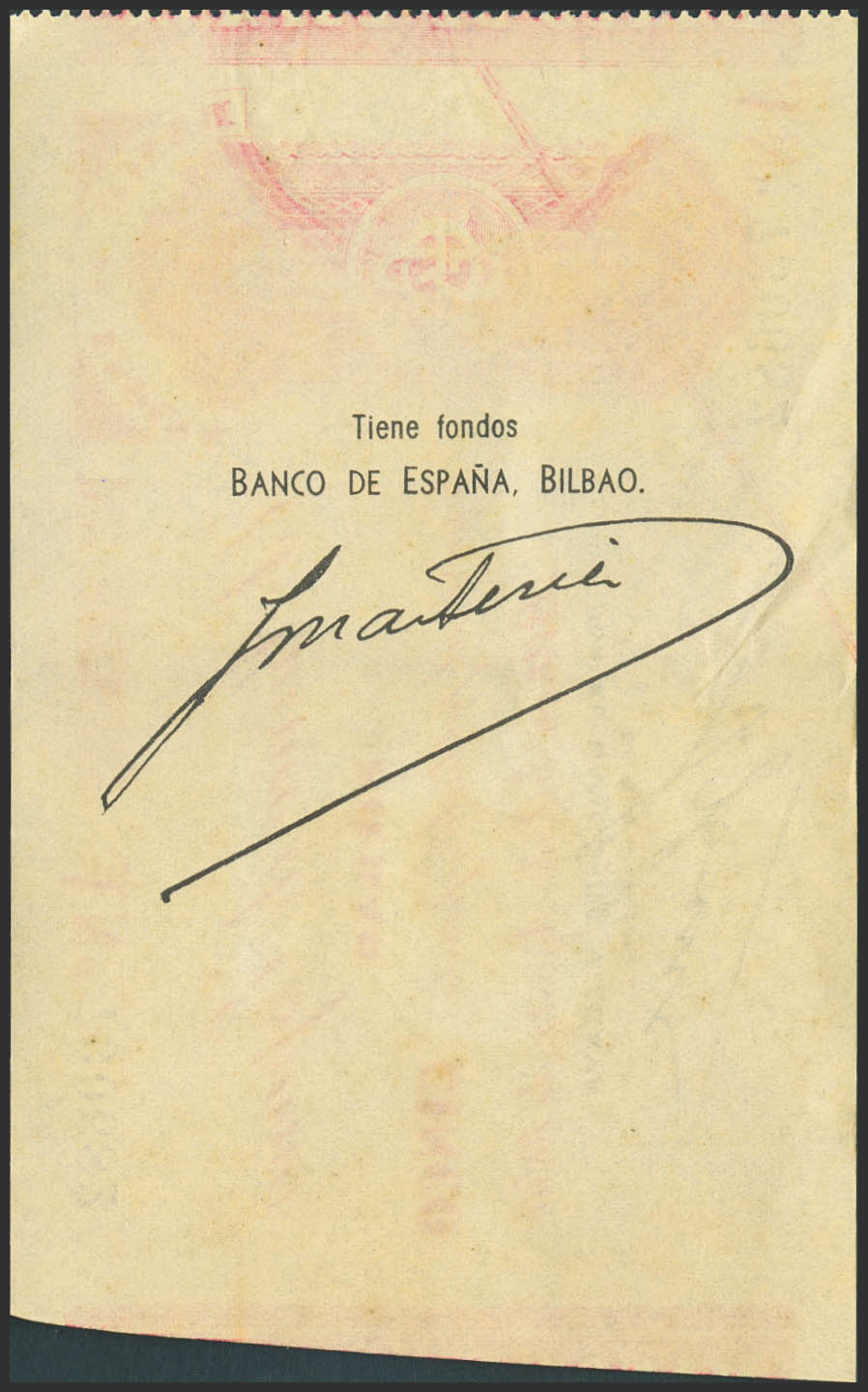 5 Pesetas. 30 de Agosto de 1936. Sucursal de Bilbao, antefirma del Banco de Vizcaya. Serie A. (Edifil 2023: 368Aa). Inusual en esta excepcional calidad, especialmente con apresto original, ondulación que no llega a romper fibra. EBC+++.