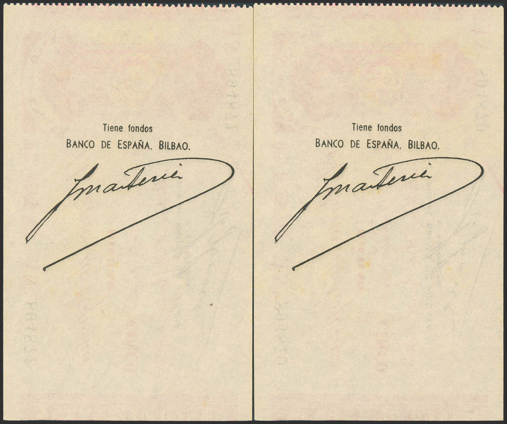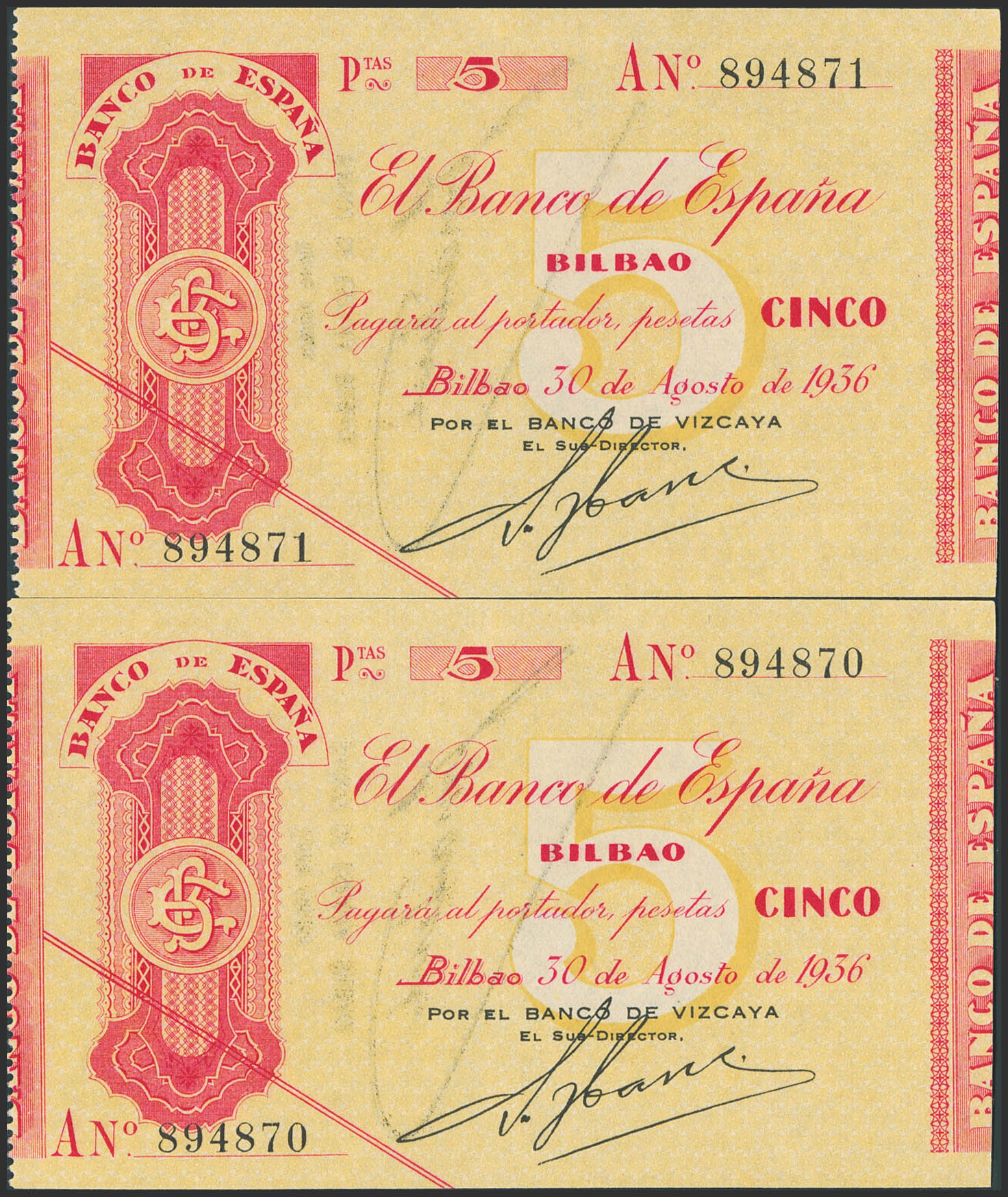5 Pesetas. 30 de Agosto de 1936. Pareja correlativa. Sucursal de Bilbao y antefirma del Banco de Vizcaya. Serie A. (Edifil 2021: 368Aa). Ondulación vertical sin romper fibra. EBC+.