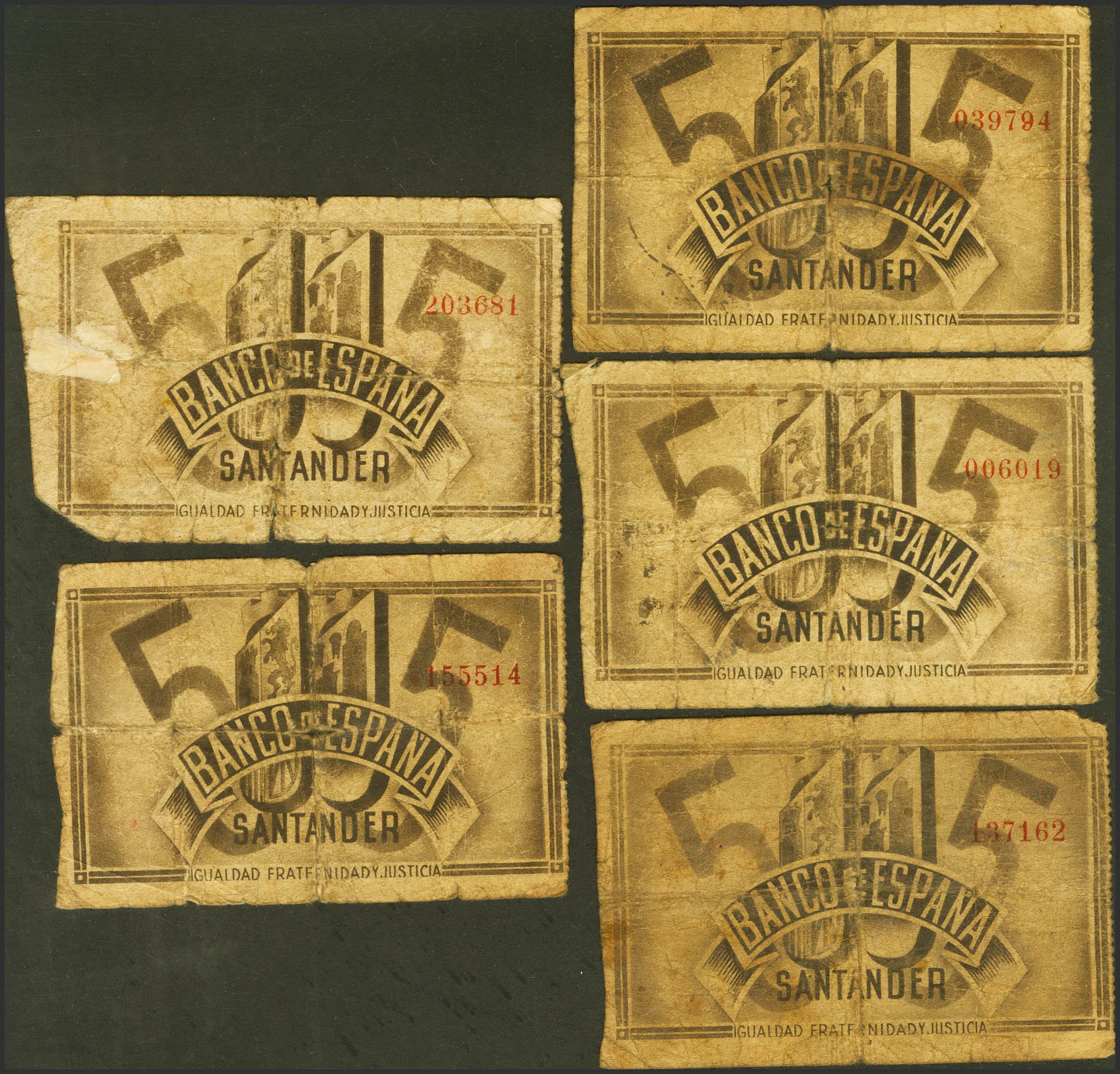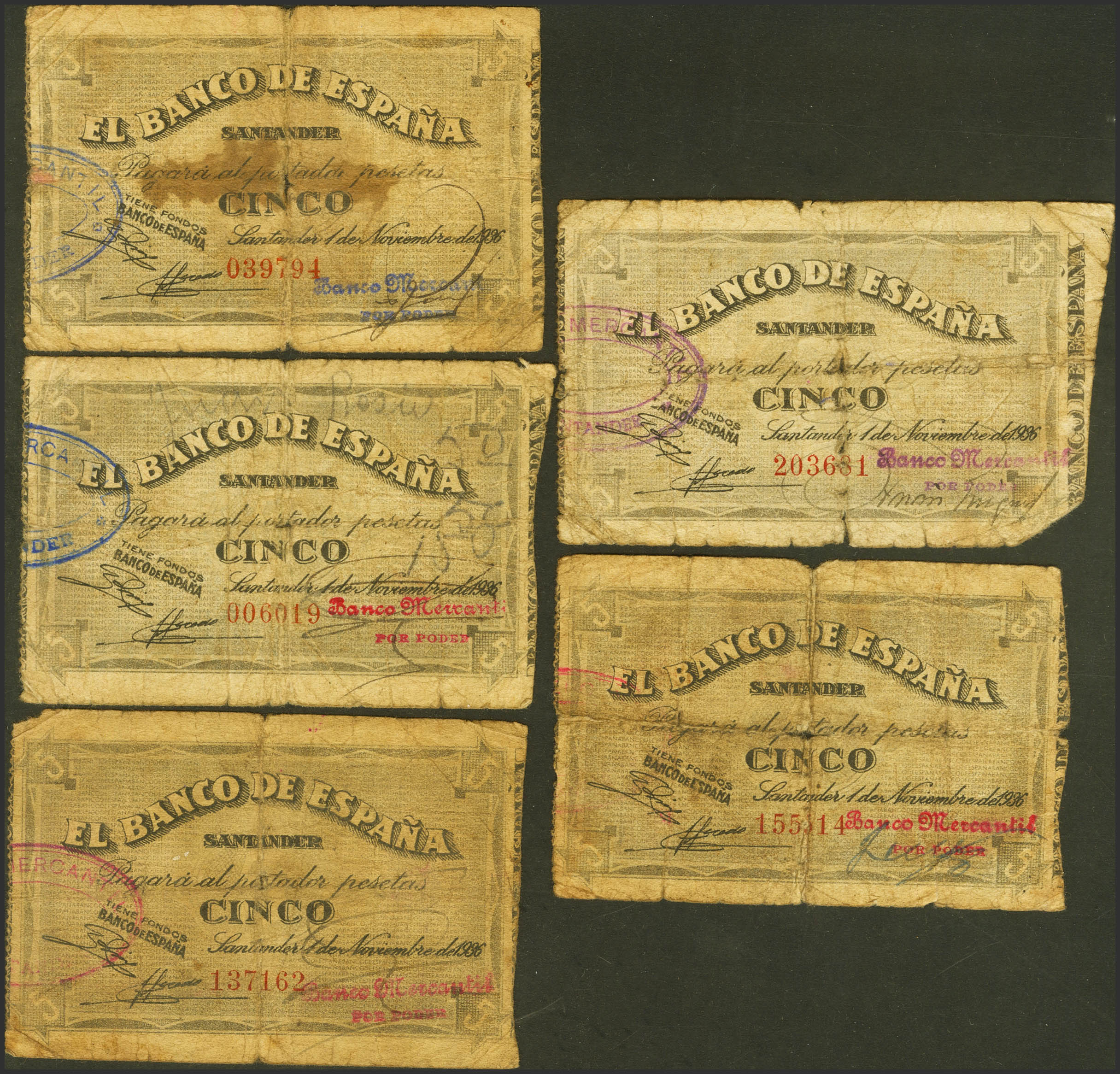 Conjunto de 5 billetes de 5 Pesetas del Banco de Santander, emitidos el 1 de Noviembre de 1936, todos ellos sin serie y con diversas antefirmas. (Edifil 2023: 375). MBC-/BC+.