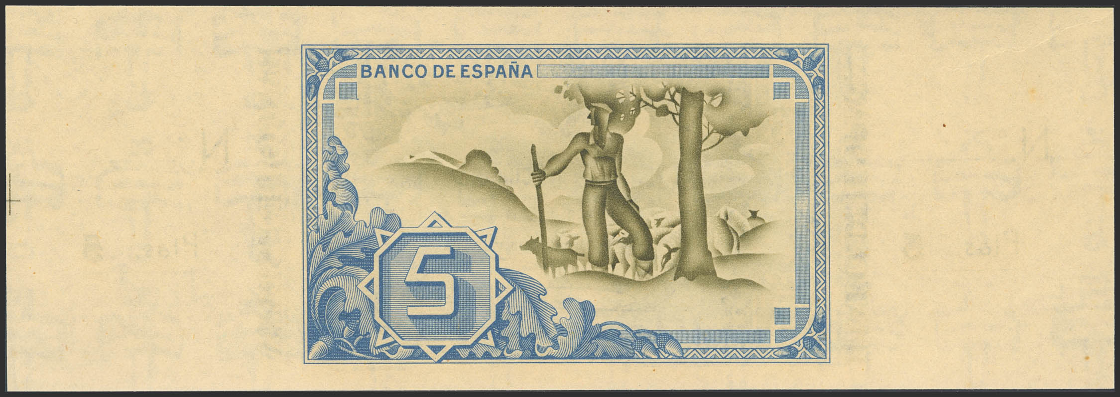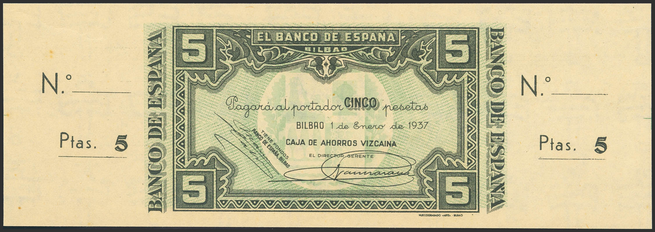 5 Pesetas. 1 de Enero de 1937. Sucursal de Bilbao, antefirma Caja de Ahorros Vizcaína. Sin serie y sin numeración, con ambas matrices. (Edifil 2023: 385b). Apresto original, arruguitas naturales del papel y habituales puntitos del tiempo. SC-.