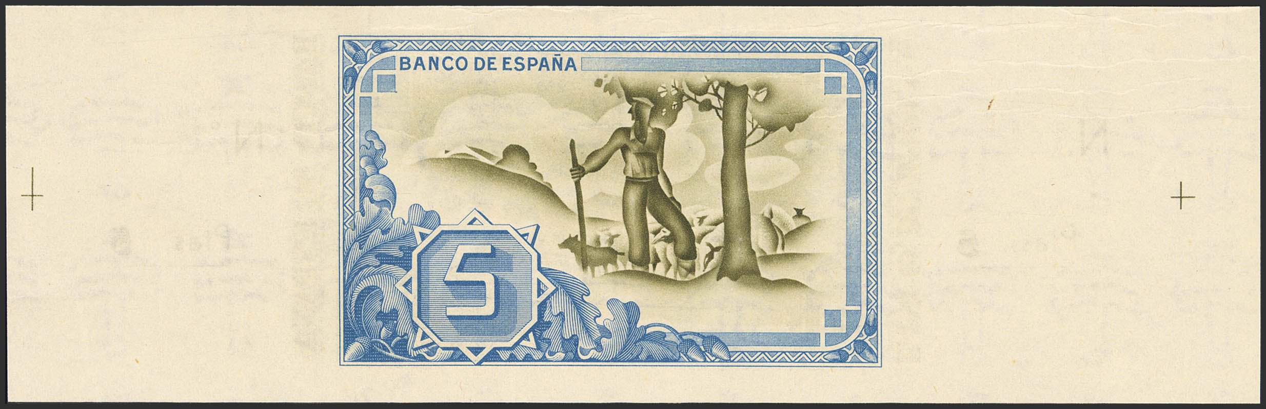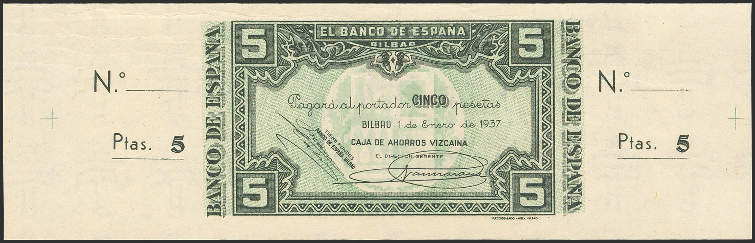5 Pesetas. 1 de Enero de 1937. Sucursal de Bilbao, antefirma Caja de Ahorros Vizcaína. Sin serie y sin numeración, con ambas matrices. (Edifil 2023: 385b). Apresto original, arruguitas naturales del papel. SC-.