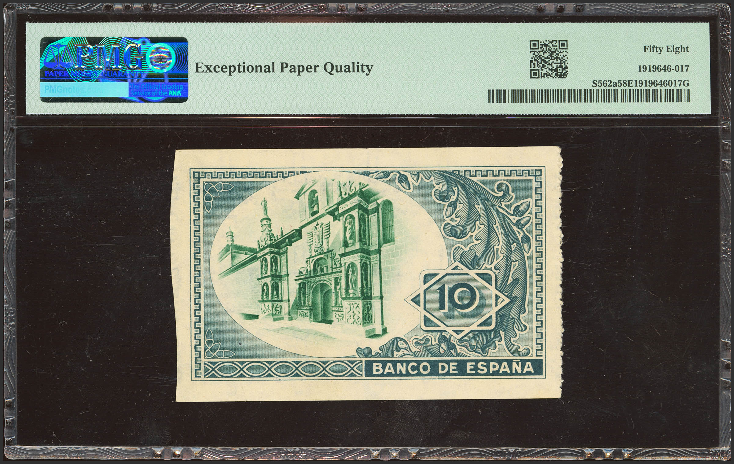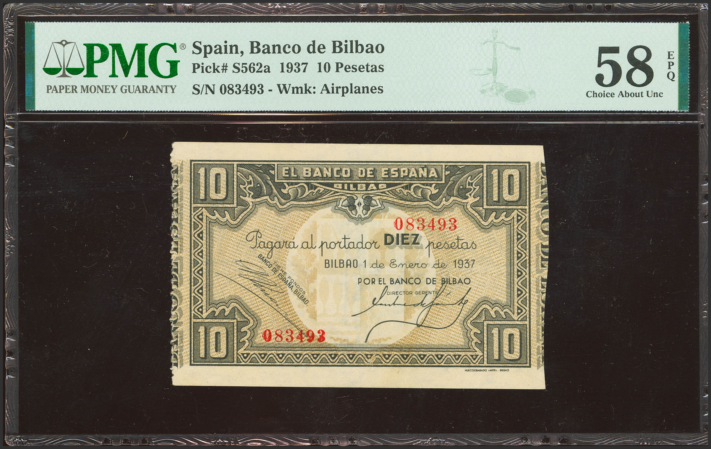 10 Pesetas. 1 de Enero de 1937. Sucursal de Bilbao, antefirma Banco de Bilbao. Sin serie, con numeración y sin matrices. (Edifil 2023: 387a, Pick: S562a). Apresto original. EBC+++. Encapsulado PMG58EPQ.
