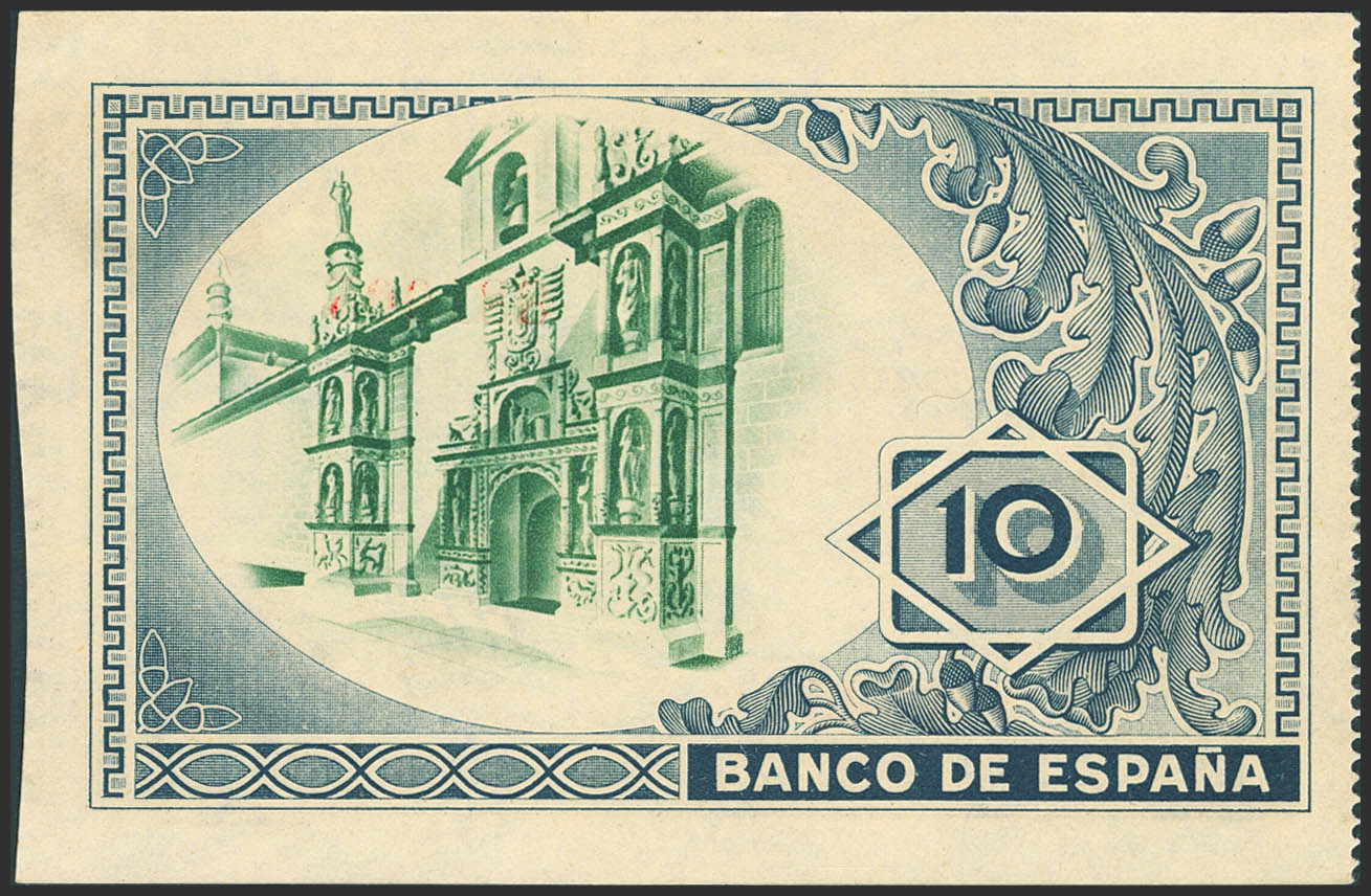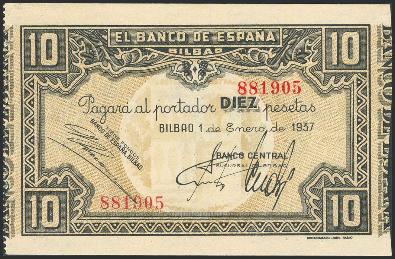10 Pesetas. 1 de Enero de 1937. Sucursal de Bilbao, antefirma Banco Central. Sin serie, con numeración y sin matrices. (Edifil 2023: 387c). Apresto original. SC