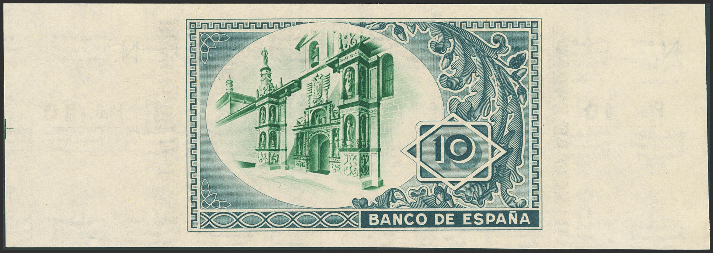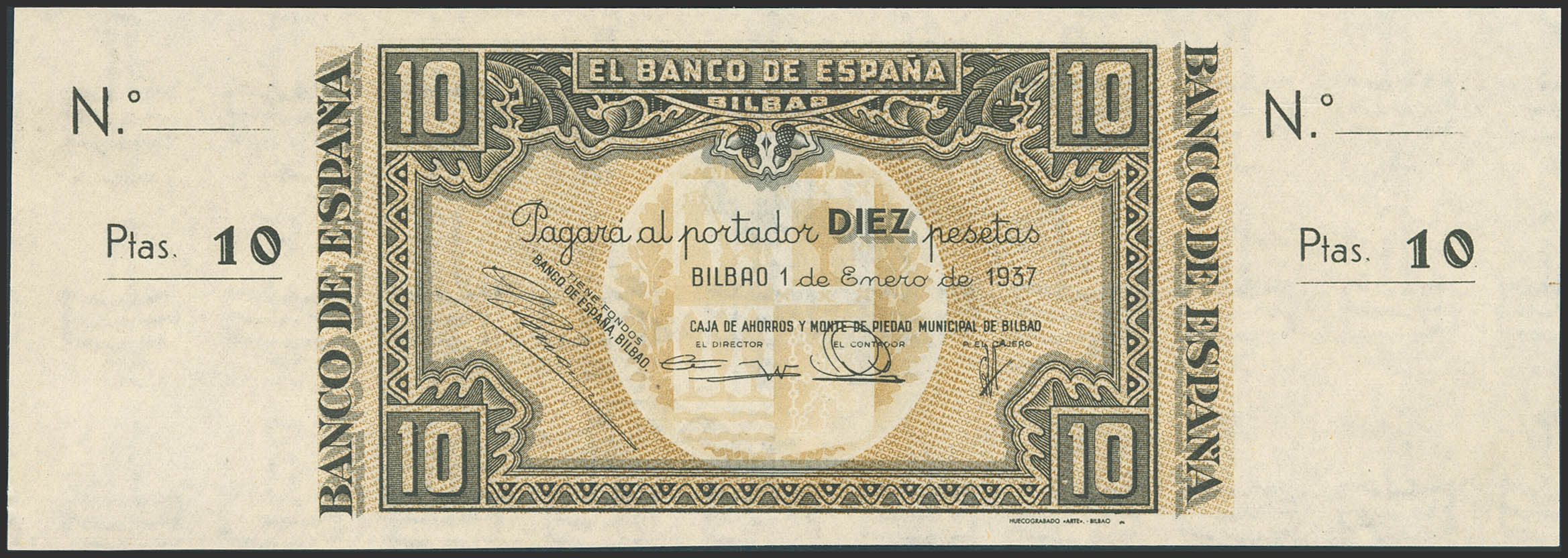 10 Pesetas. 1 de Enero de 1937. Sucursal de Bilbao, antefirma Caja de Ahorros y de Monte de Piedad Municipal de Bilbao. Sin serie y sin numeración, con ambas matrices. (Edifil 2023: 387g). Apresto original. SC.