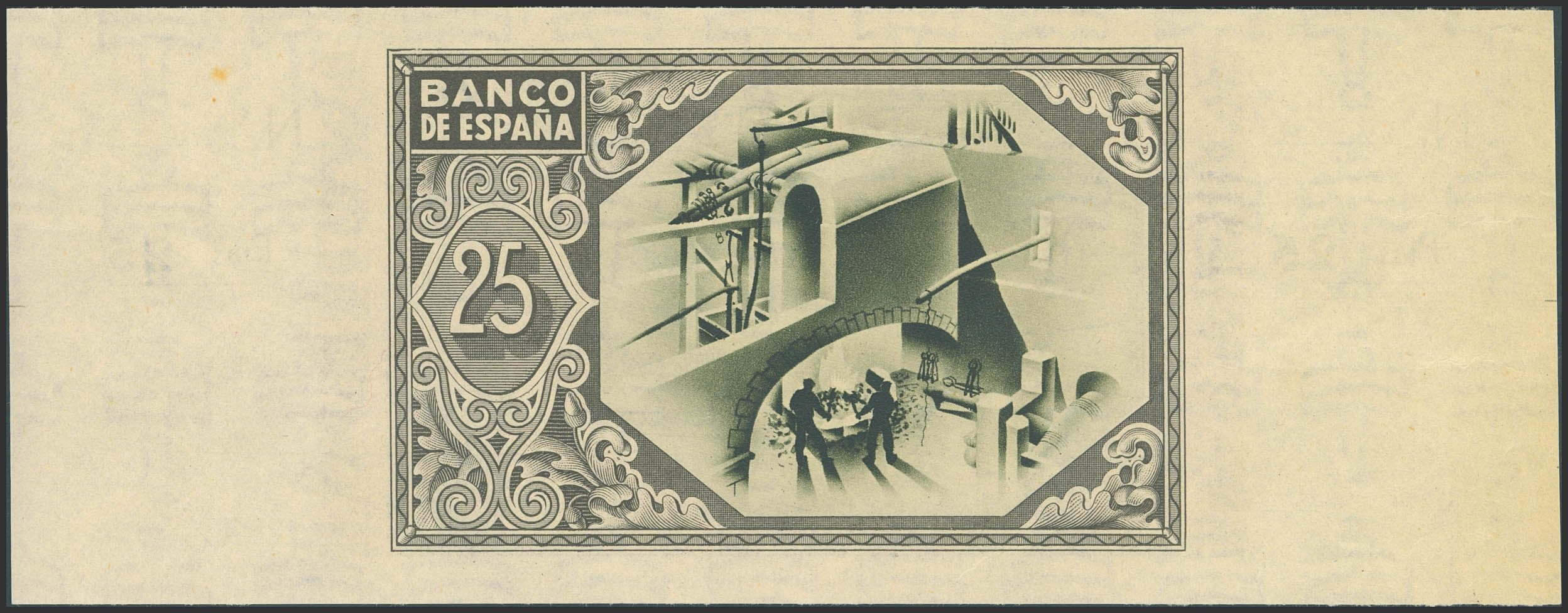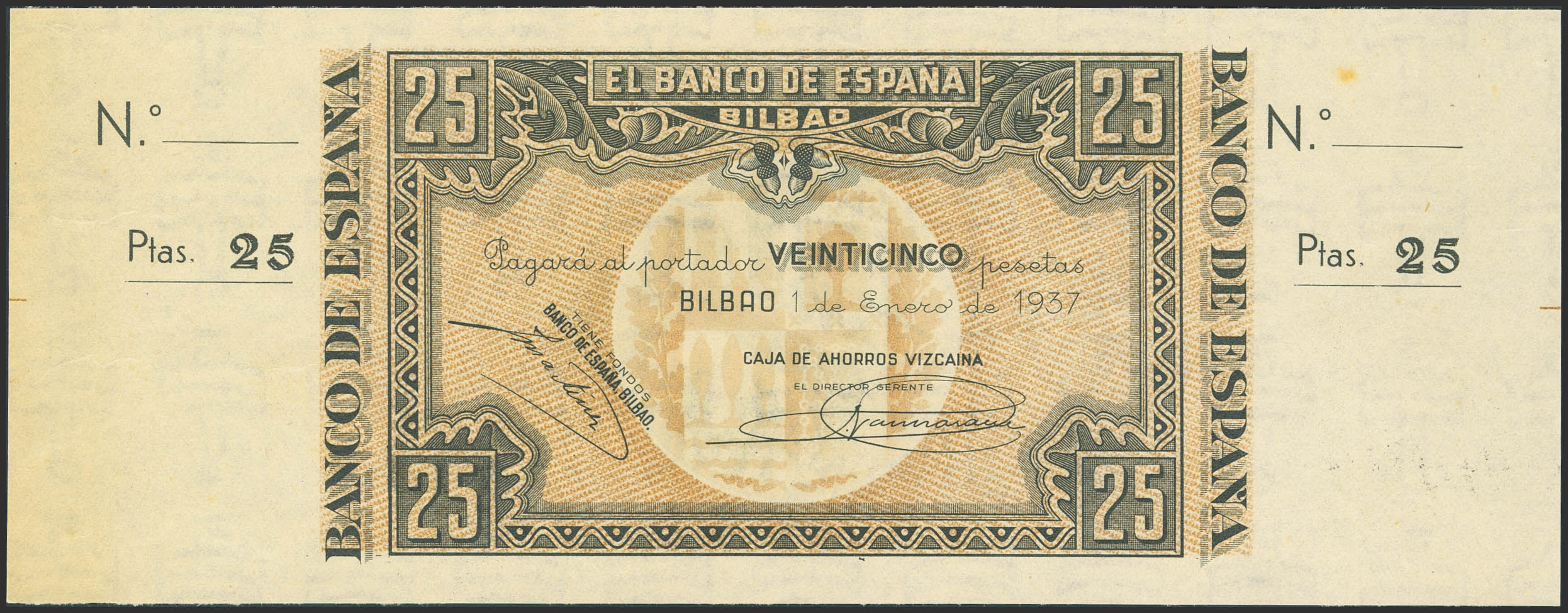 25 Pesetas. 1 de Enero de 1937. Sucursal de Bilbao, antefirma Caja de Ahorros Vizcaína. Sin serie y sin numeración, con ambas matrices. (Edifil 2023: 388a). Apresto original, habituales puntitos del tiempo. SC-.