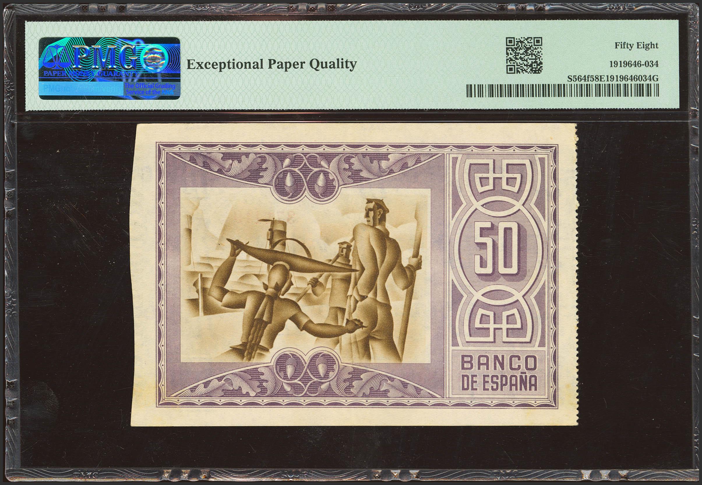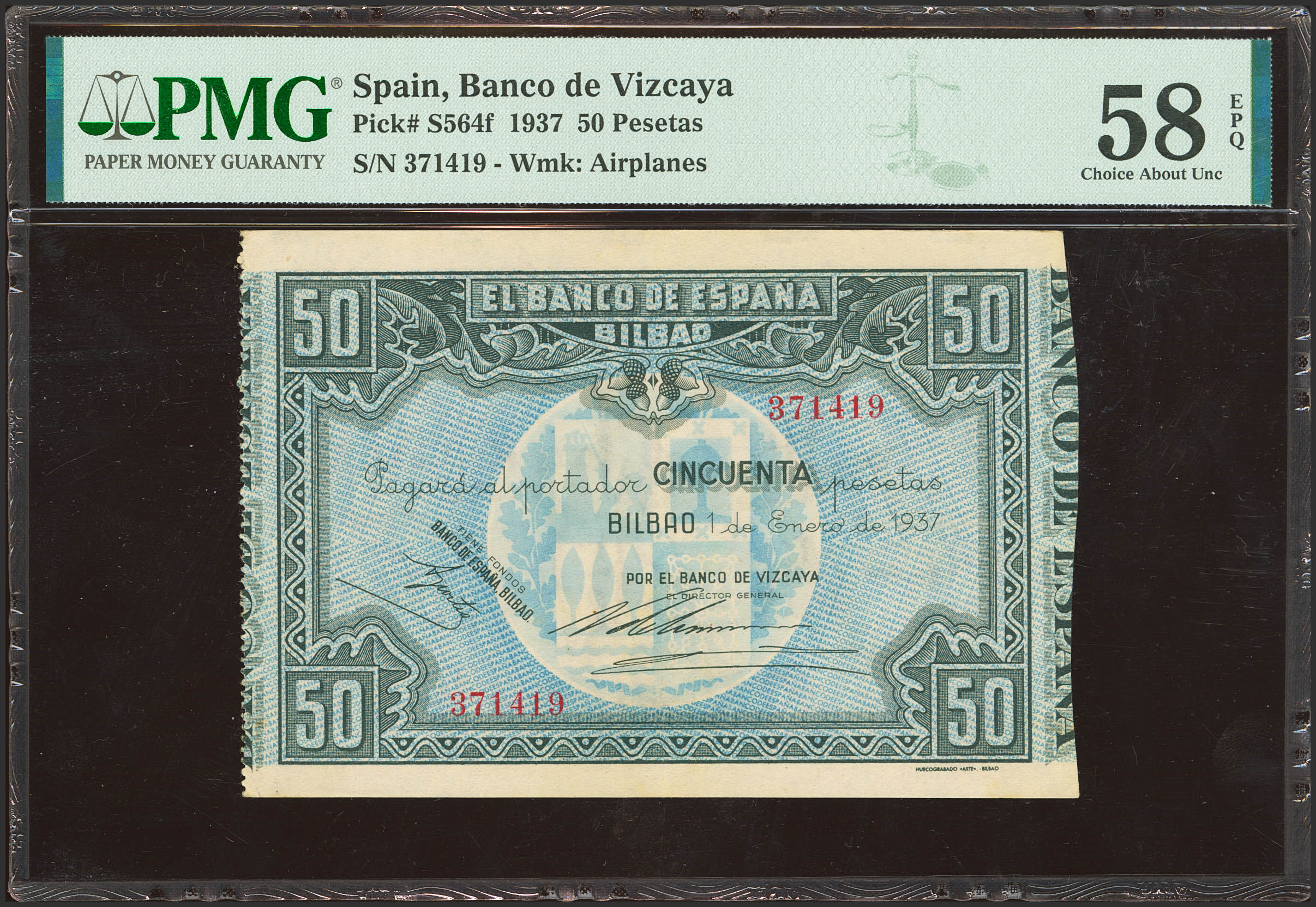 50 Pesetas. 1 de Enero de 1937. Sucursal de Bilbao, antefirma Banco de Vizcaya. Sin serie, con numeración y sin matrices. (Edifil 2023: 389b, Pick: S564f). Apresto original EBC+++. Encapsulado PMG58EPQ.