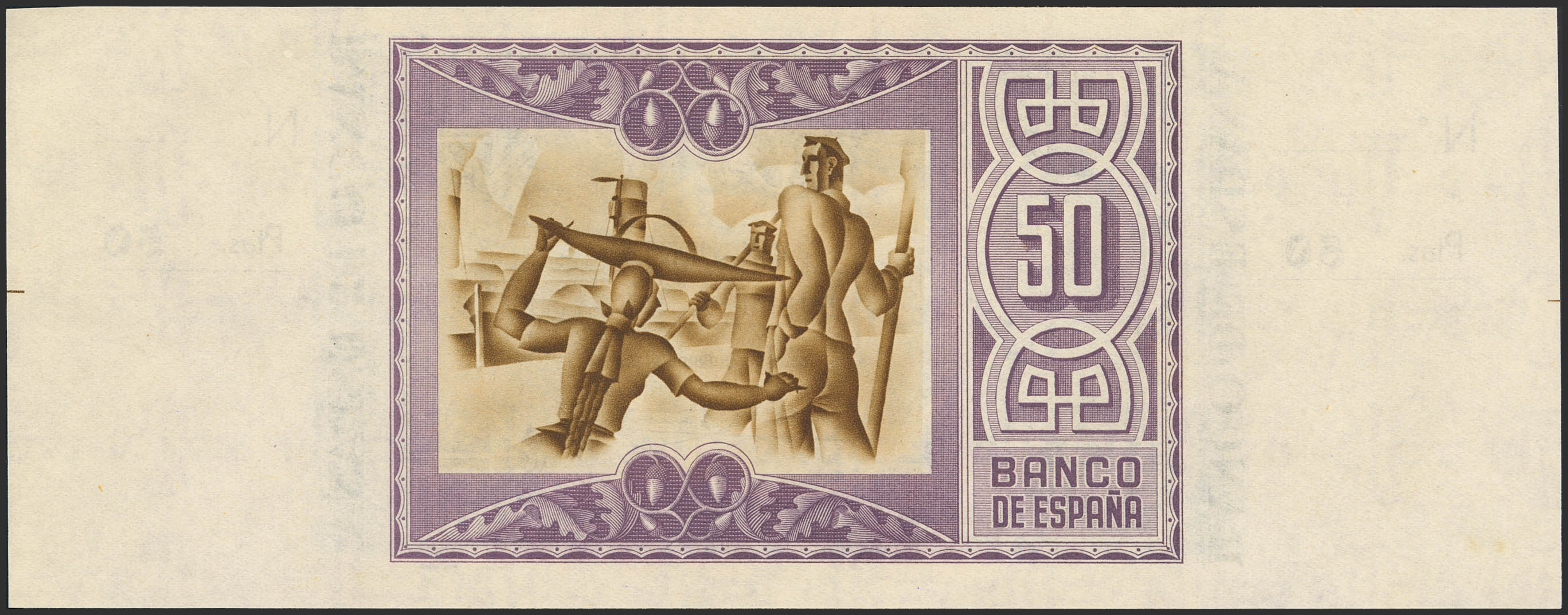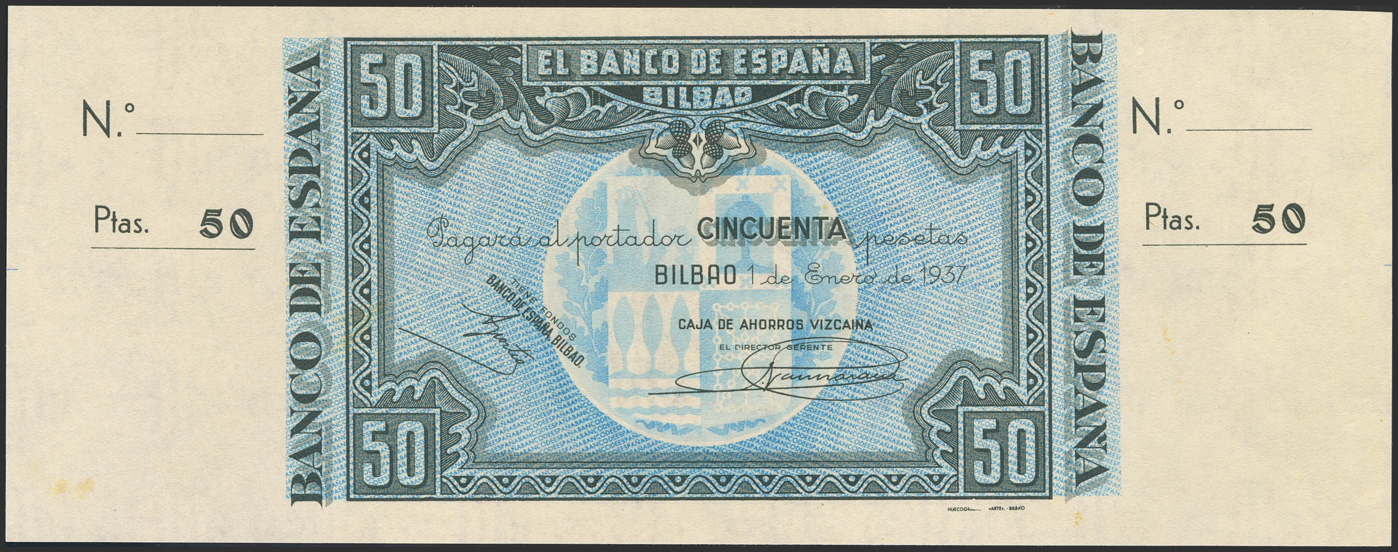 50 Pesetas. 1 de Enero de 1937. Sucursal de Bilbao, antefirma Banco Ahorros Vizcaína. Sin serie y sin numeración, con ambas matrices. (Edifil 2021: 389f). Apresto original. SC-.
