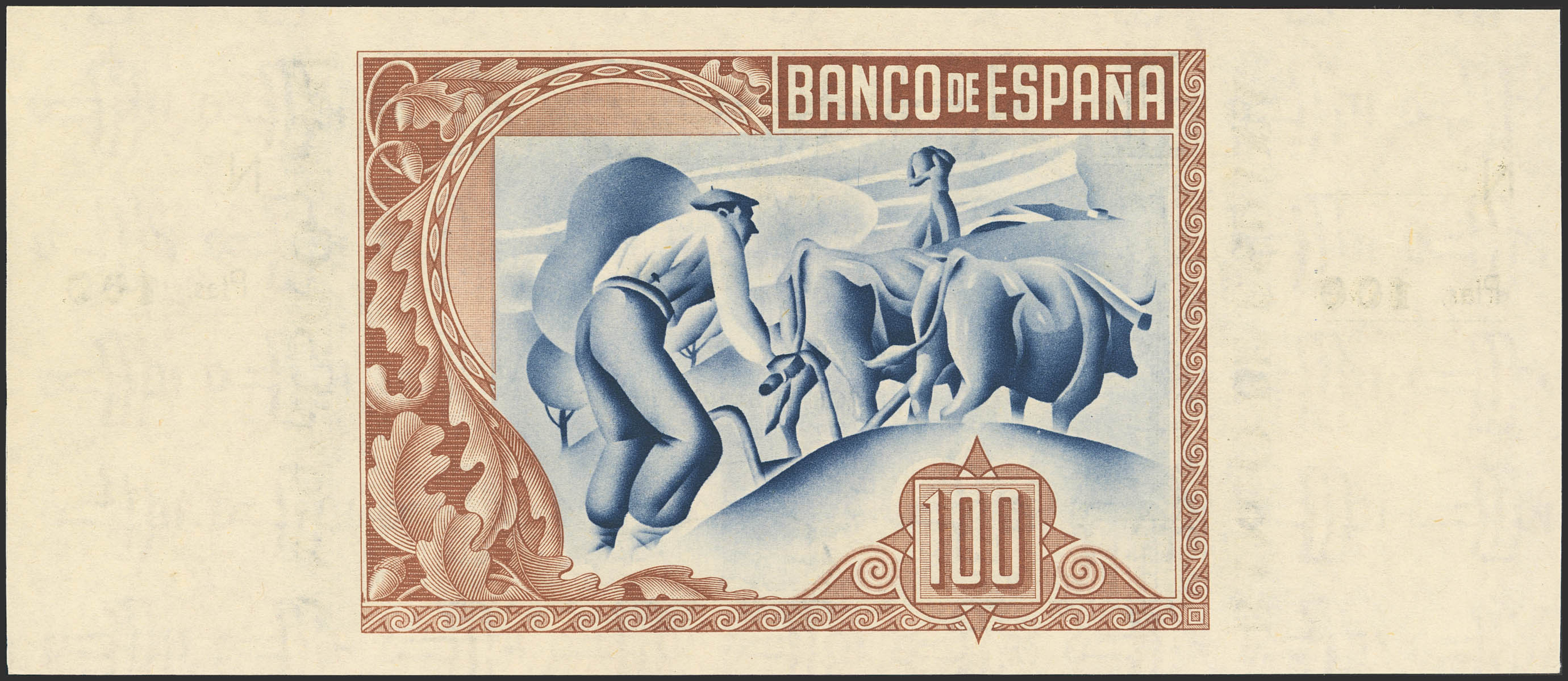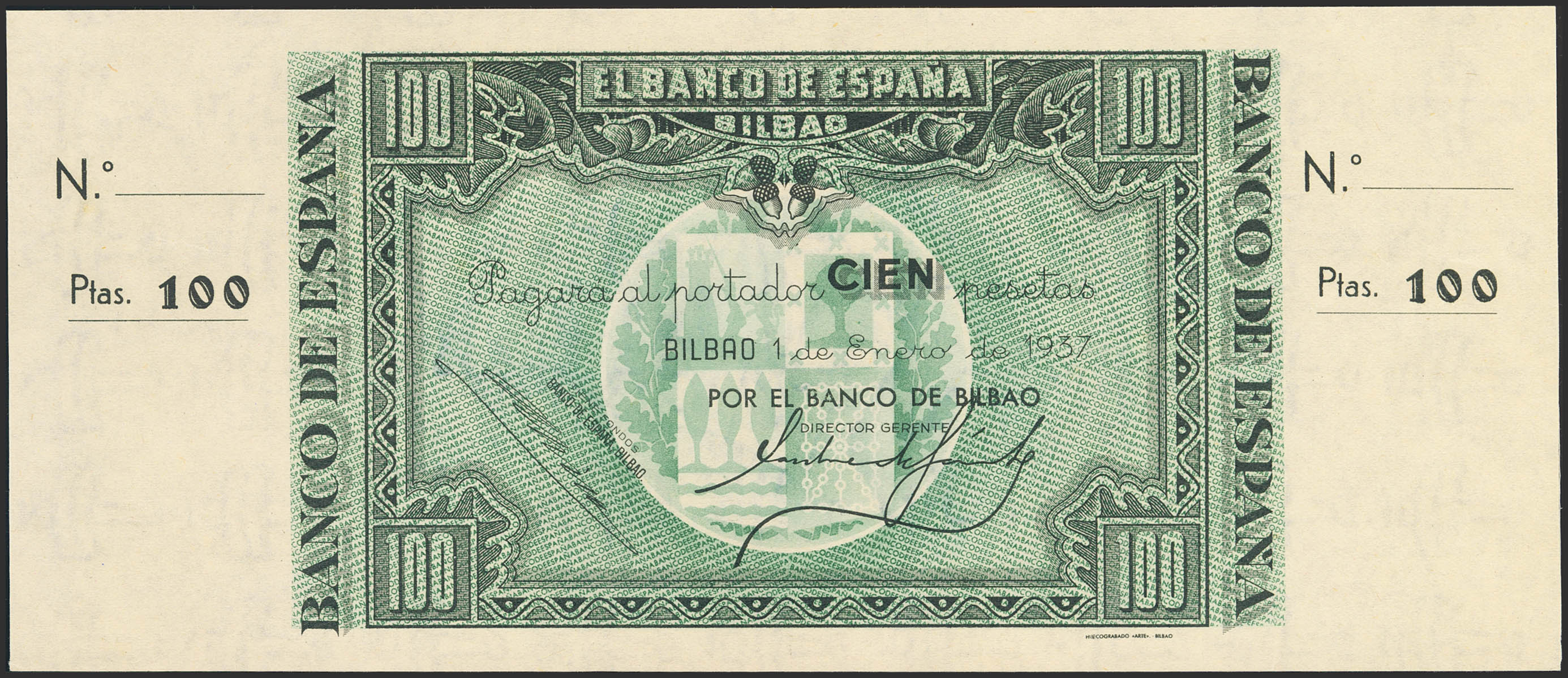 100 Pesetas. 1 de Enero de 1937. Sucursal de Bilbao, antefirma Banco de Bilbao. Sin serie y sin numeración, con ambas matrices. (Edifil 2023: 390a). Apresto original. SC