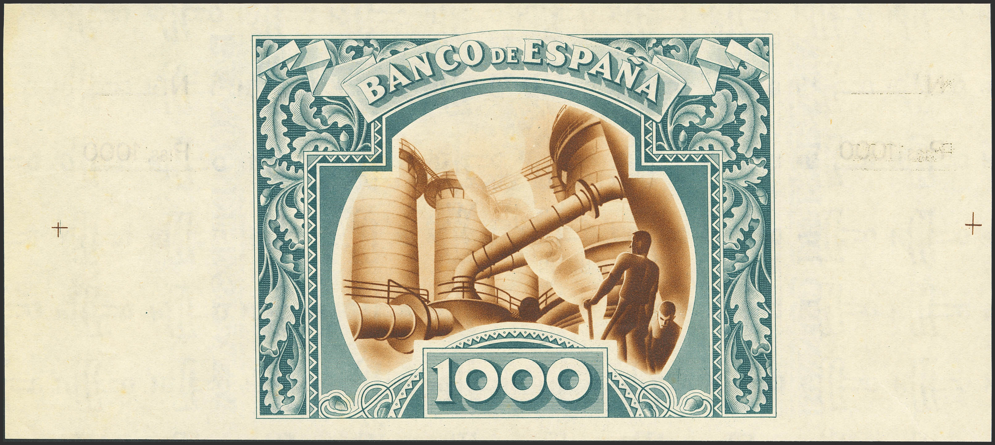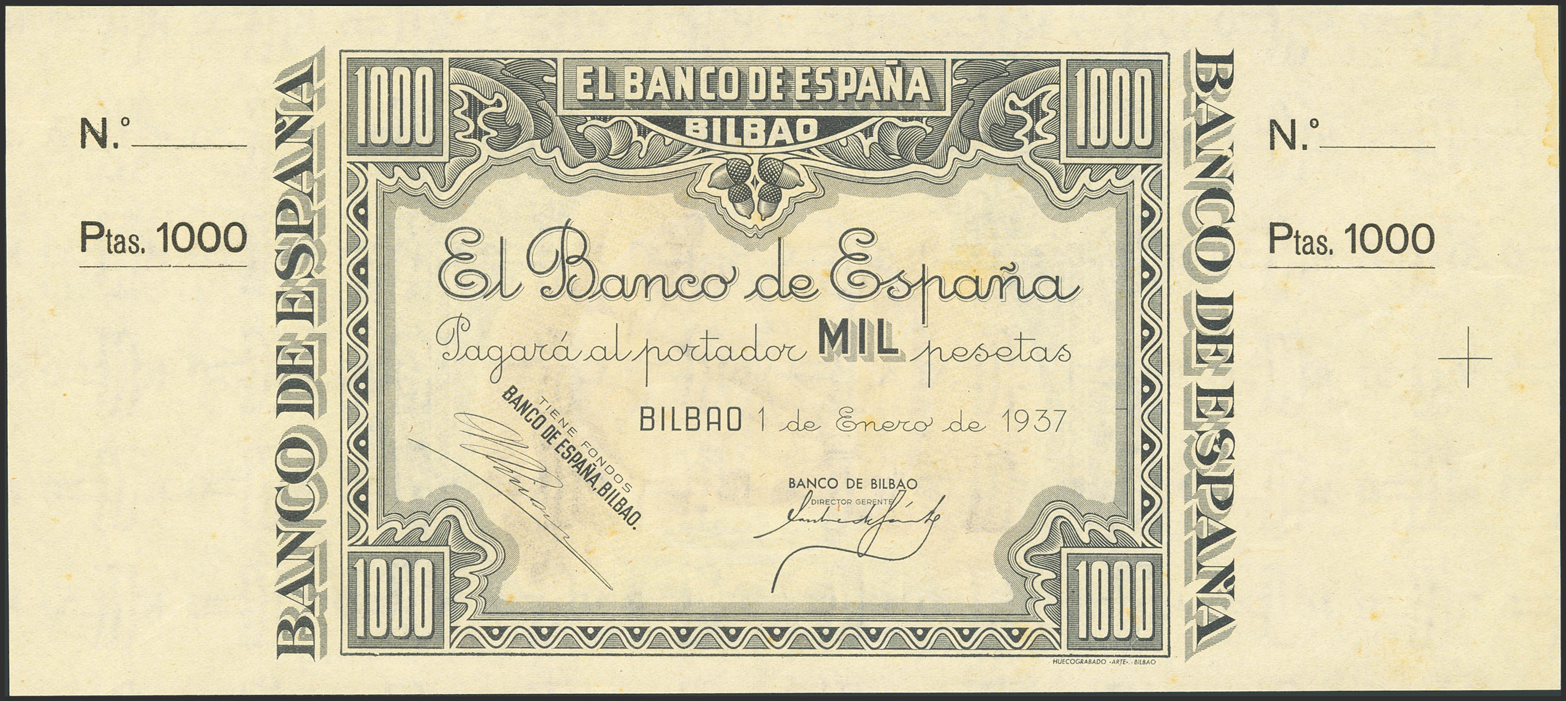 1000 Pesetas. 1 de Enero de 1937. Sucursal de Bilbao, antefirma Banco de Bilbao. No emitido, sin serie y sin numeración, con ambas matrices y a falta del color violeta del anverso. (Edifil 2023: NE27a). Apresto original, típicos puntitos del tiempo. SC--.