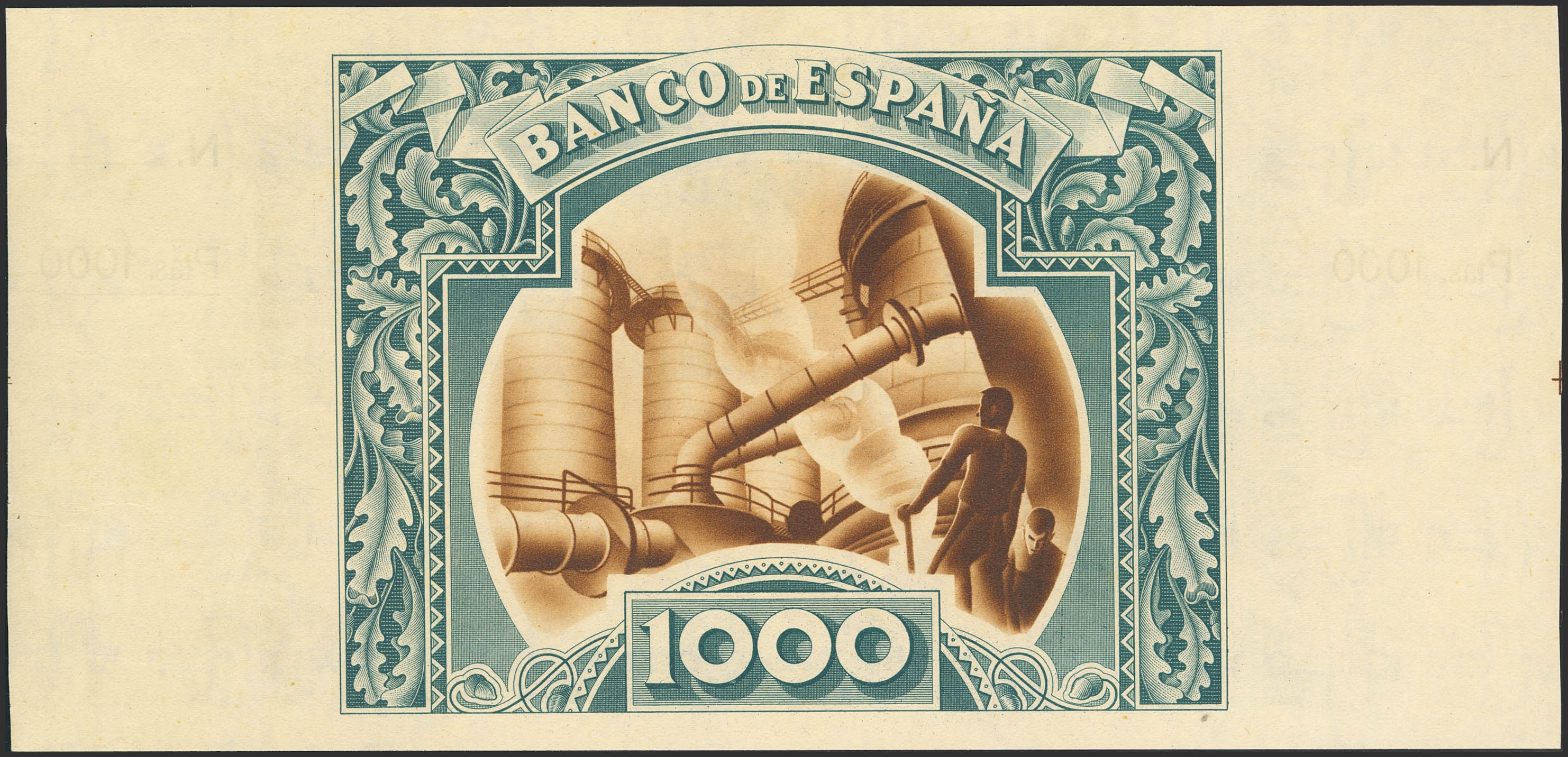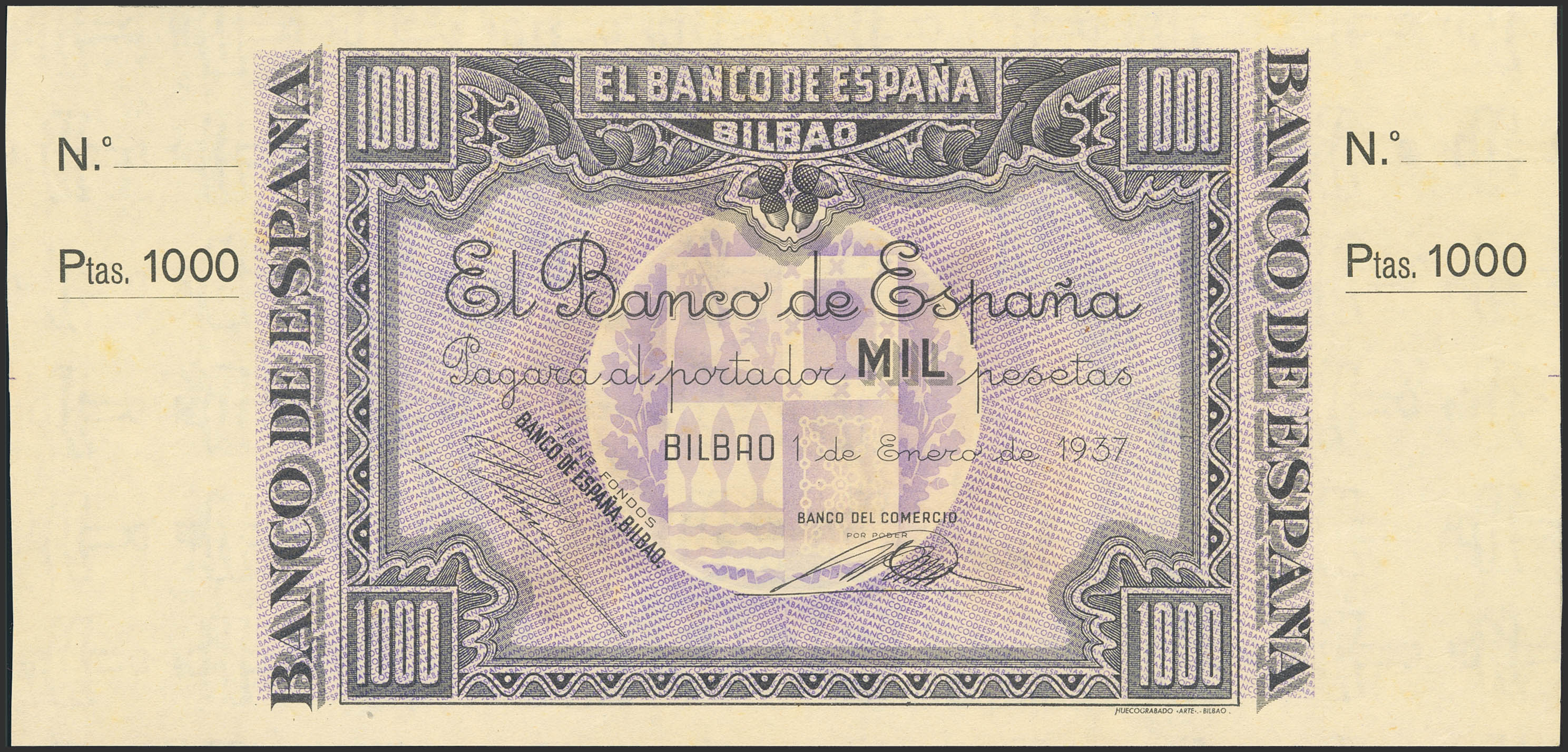 1000 Pesetas. 1 de Enero de 1937. Sucursal de Bilbao, antefirma Banco de Comercio. No emitido, sin serie y sin numeración, con ambas matrices. (Edifil 2023: NE27c). Apresto original, típicos puntitos del tiempo. SC.