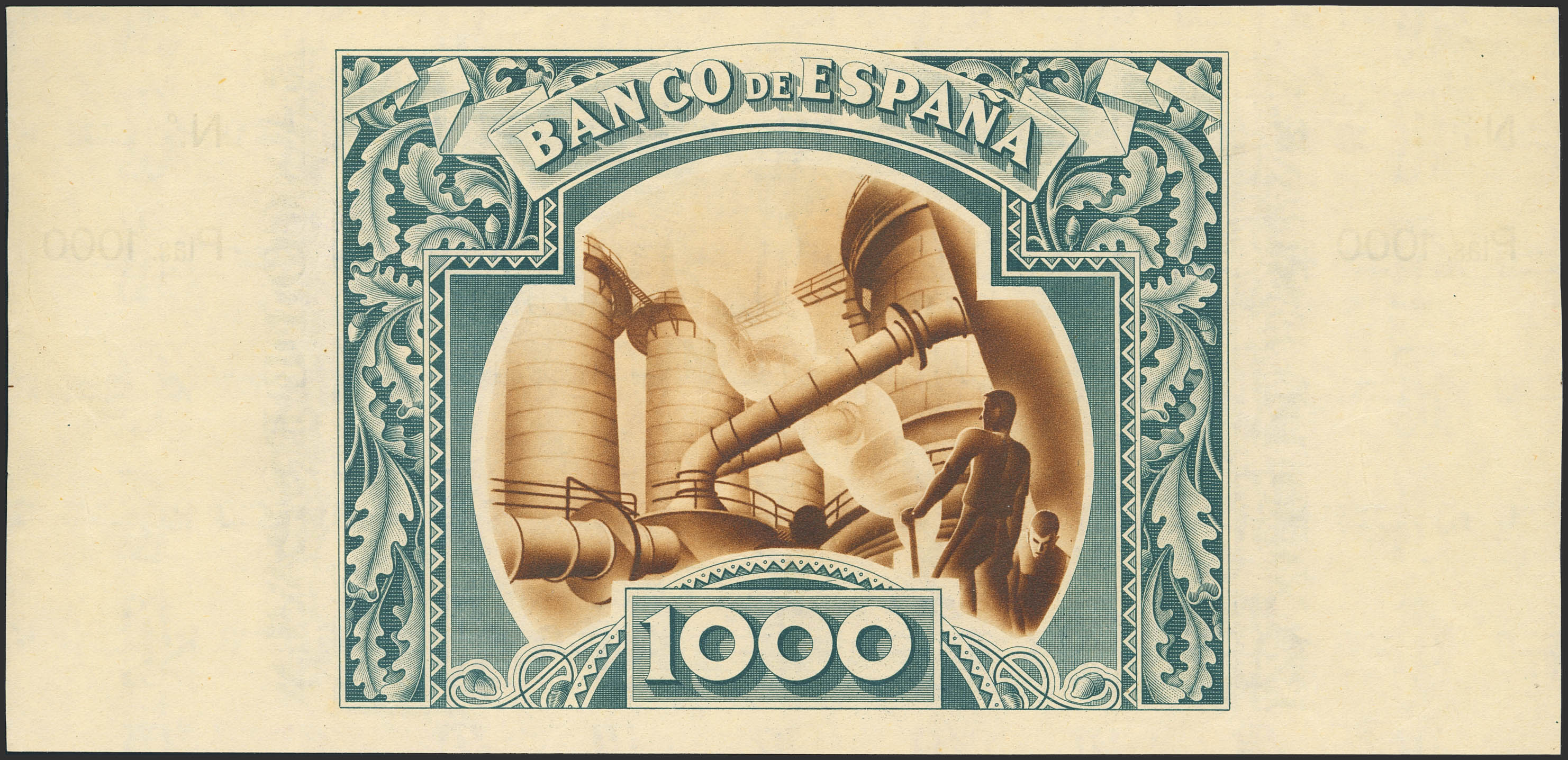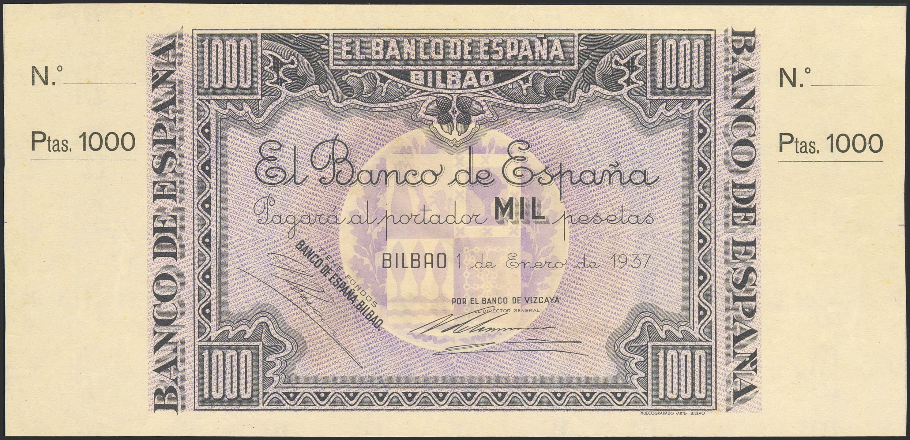 1000 Pesetas. 1 de Enero de 1937. Sucursal de Bilbao, antefirma Banco de Vizcaya. No emitido, sin serie y sin numeración, con ambas matrices. (Edifil 2021: NE27g). Apresto original. SC--.