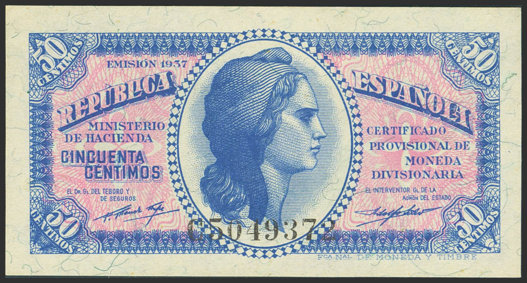 50 Céntimos. 1937. Ministerio de Hacienda. Serie C, última serie emitida. (Edifil 2023: 391a). Apresto original. SC.