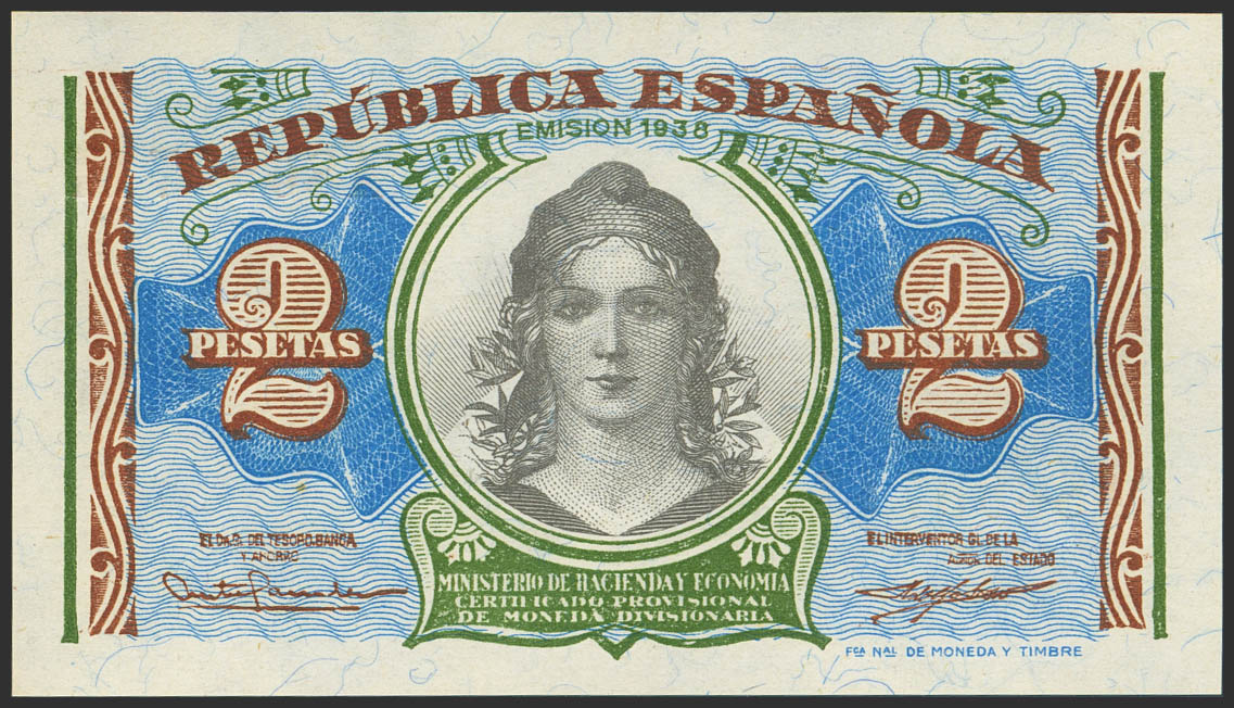 2 Pesetas. 1937. Ministerio de Hacienda. Serie A. (Edifil 2023: 393). Apresto original. SC.