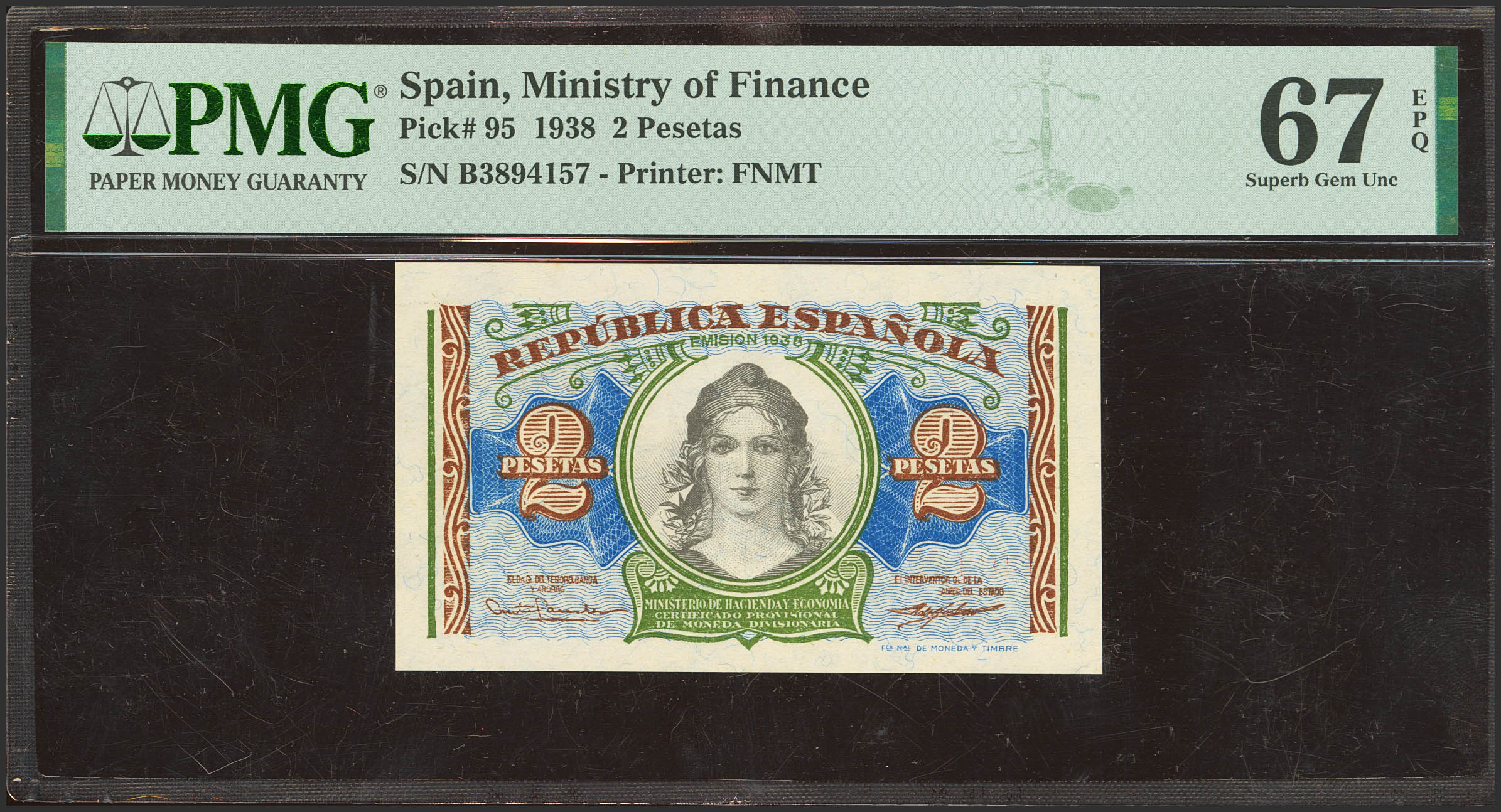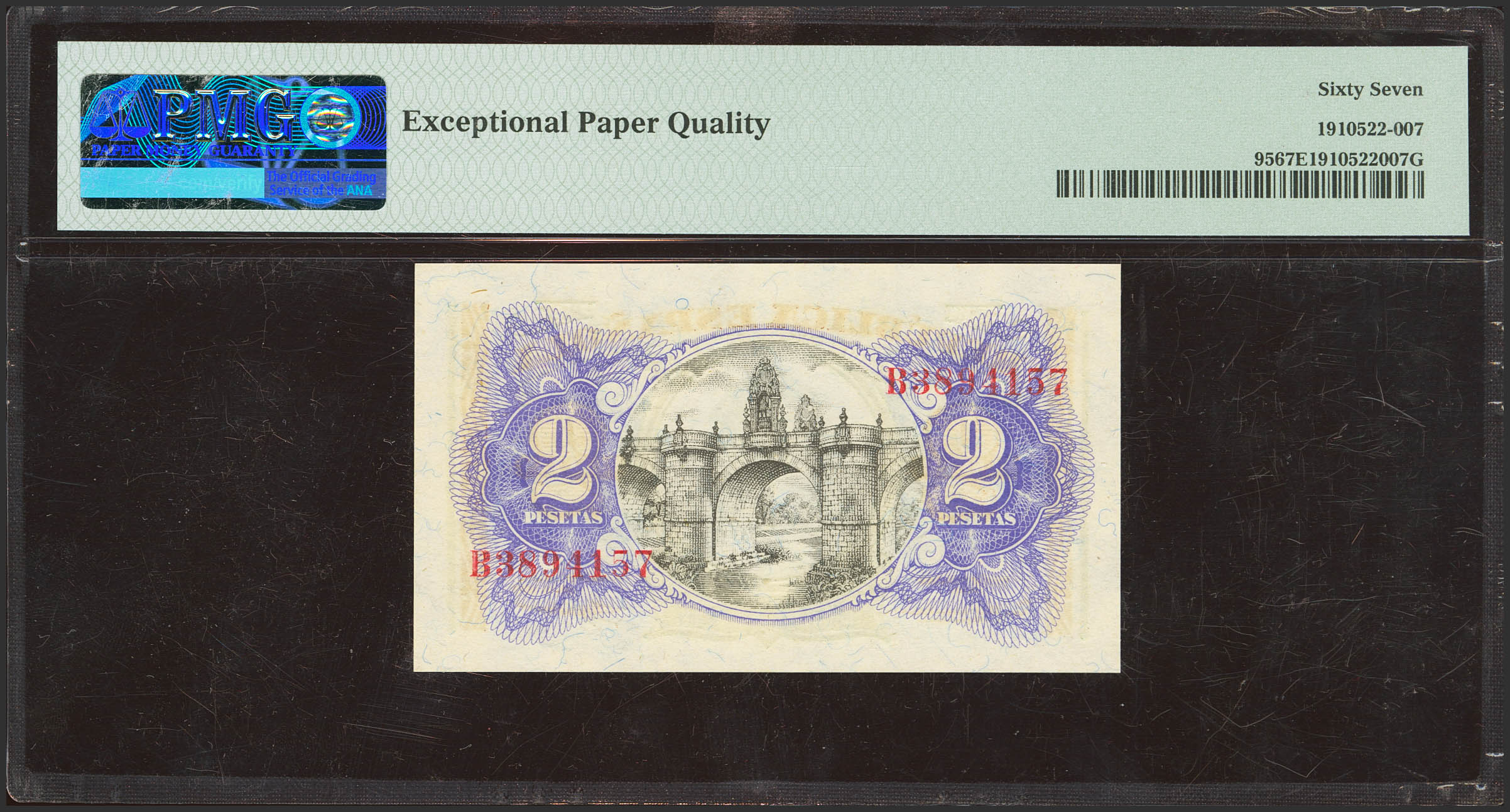 2 Pesetas. 1938. Ministerio de Hacienda. Serie B. (Edifil 2023: 393, Pick: 95). Apresto original. SC. Encapsulado PMG67EPQ.