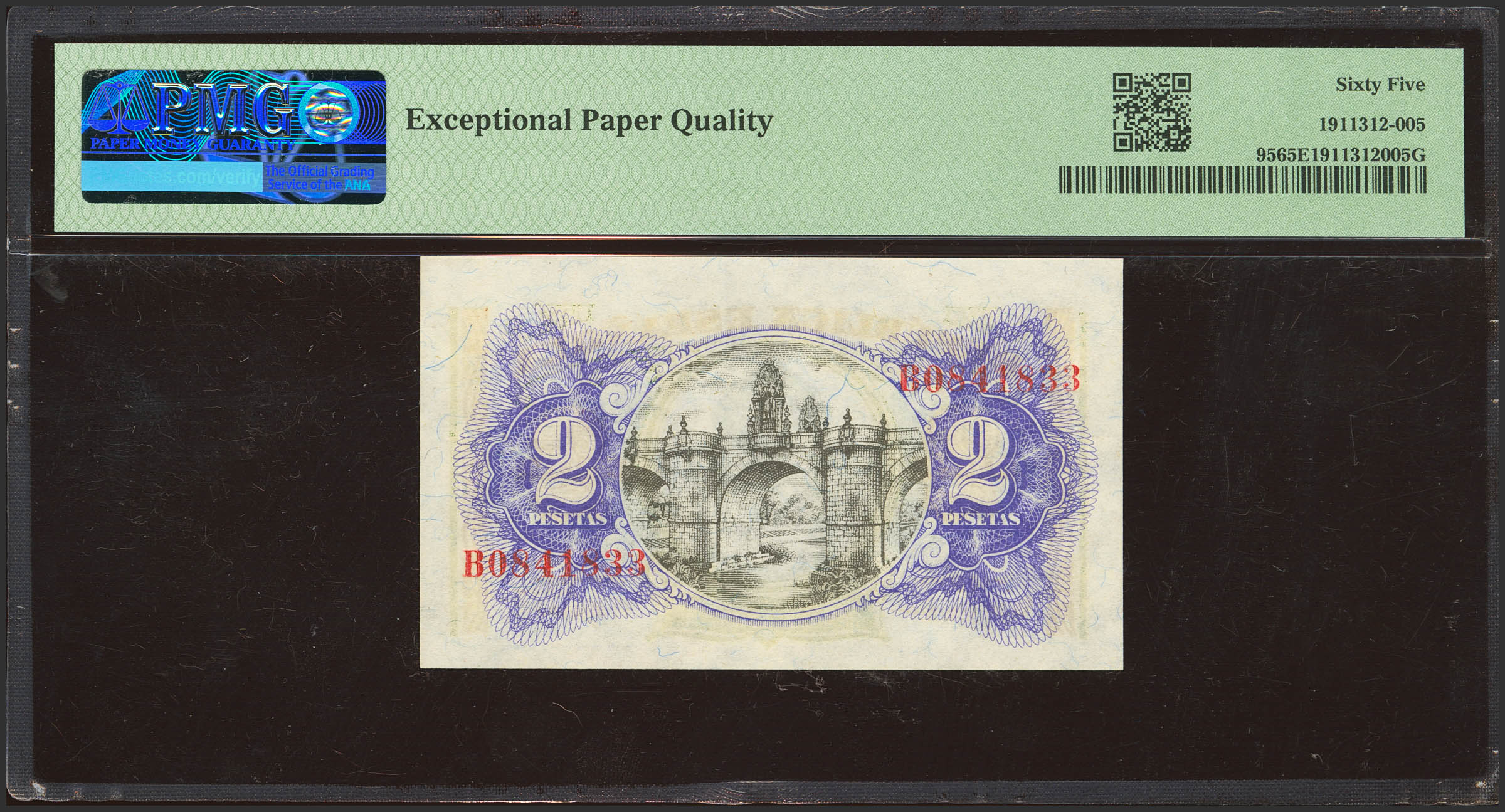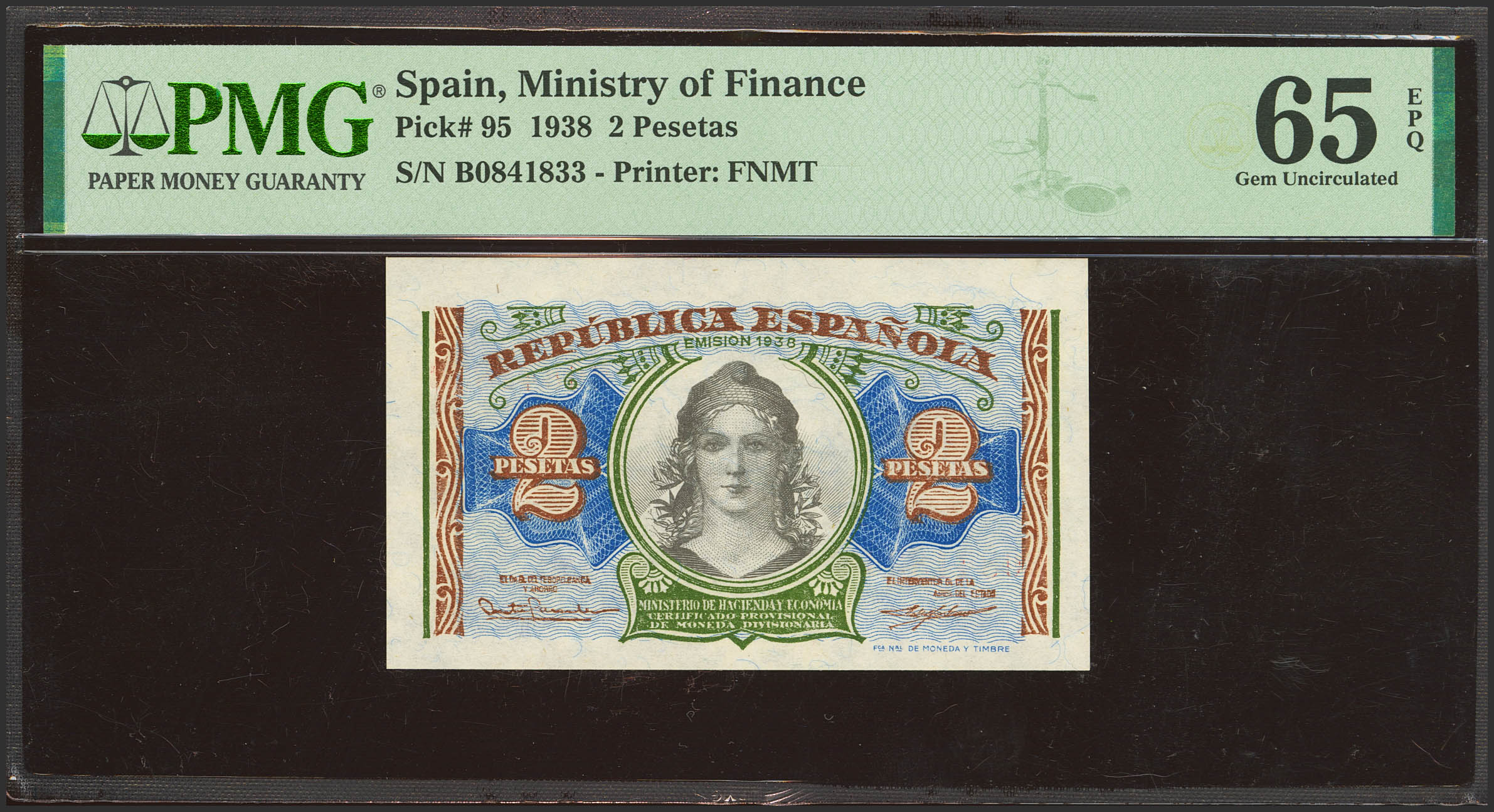 2 Pesetas. 1938. Ministerio de Hacienda. Serie B. (Edifil 2023: 393, Pick: 95). Apresto original. SC. Encapsulado PMG65EPQ.