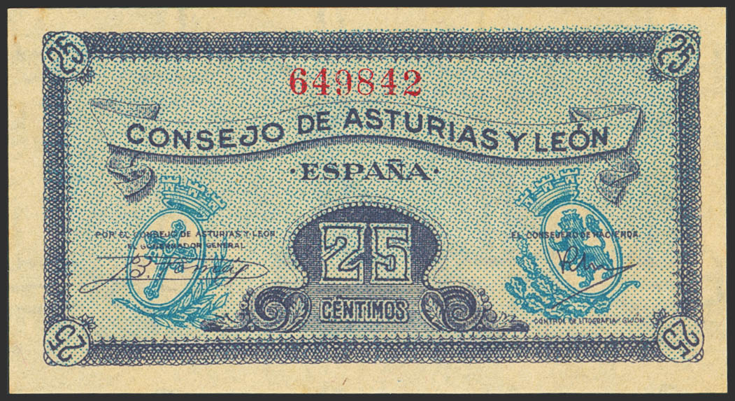 25 Céntimos. 1937. Asturias y León. Sin serie. (Edifil 2023: 394). Apresto original, manchitas del tiempo. SC-.