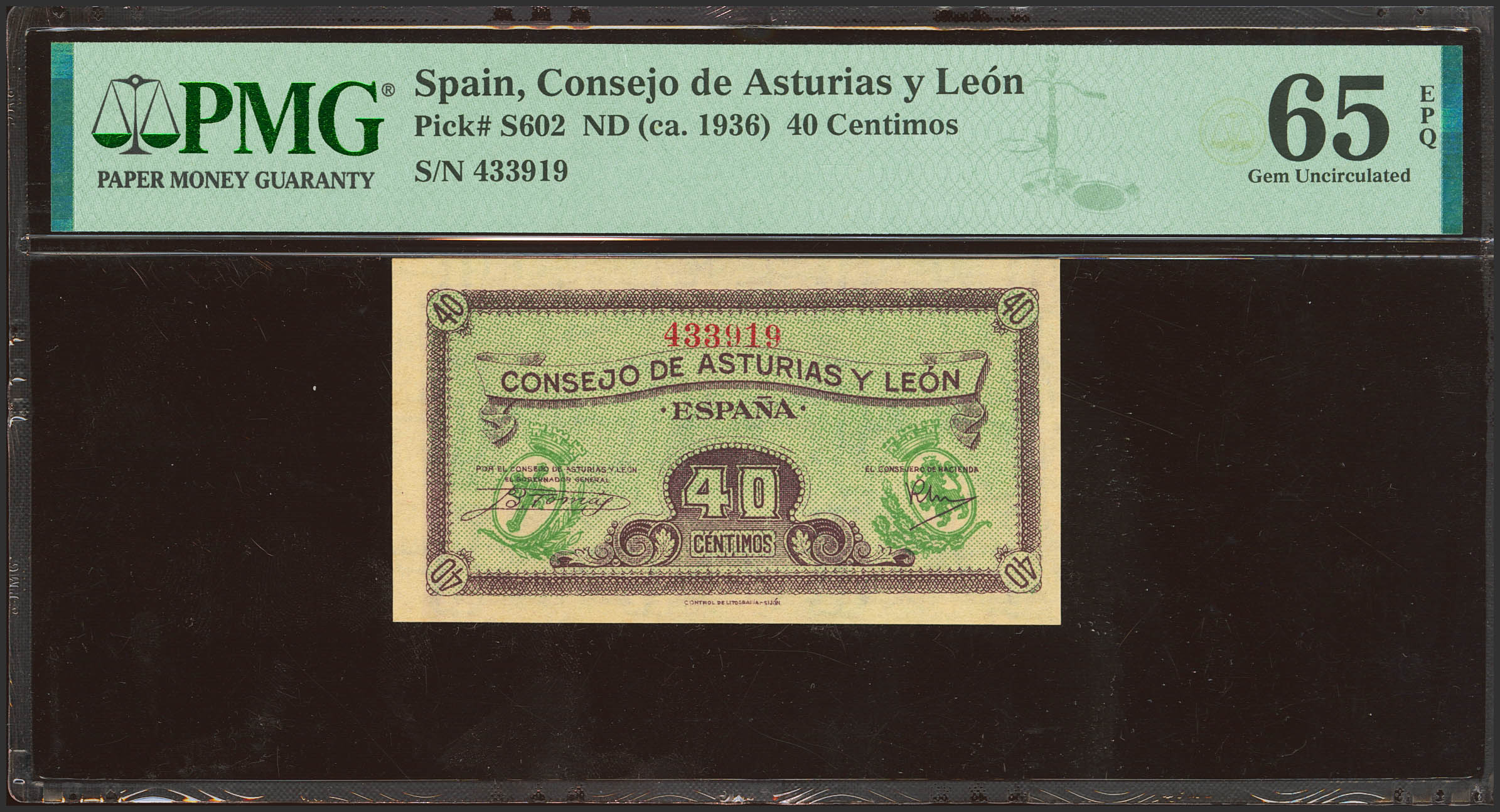 40 Céntimos. 1937. Asturias y León. Sin serie. (Edifil 2023: 395, Pick: S602). Apresto original. SC. Encapsulado PMG65EPQ.