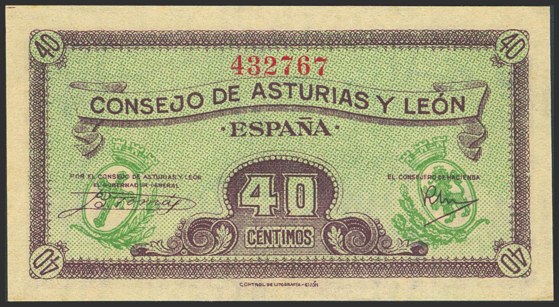 40 Céntimos. 1937. Asturias y León. Sin serie. (Edifil 2023: 395). Apresto original. SC.