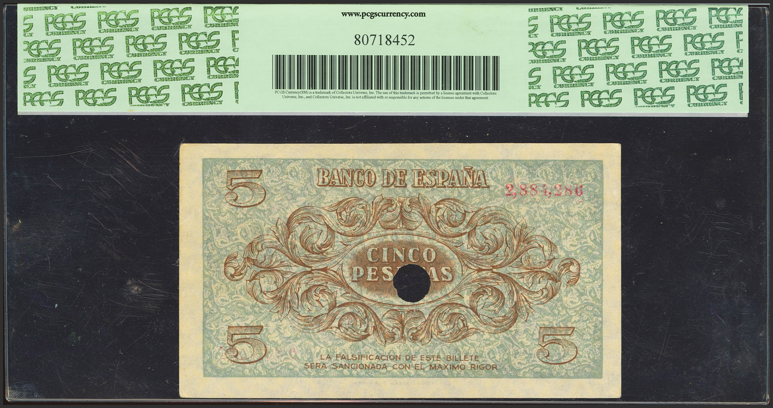 5 Pesetas. 21 de Noviembre de 1936. Sin serie y taladrado. (Edifil 2023: 417T, Pick: 97a). Inusual, puntitos de grapa siempre presentes en los billetes taladrados. EBC. Encapsulado PCGS53 (hole punch cancelled, two pinholes).
