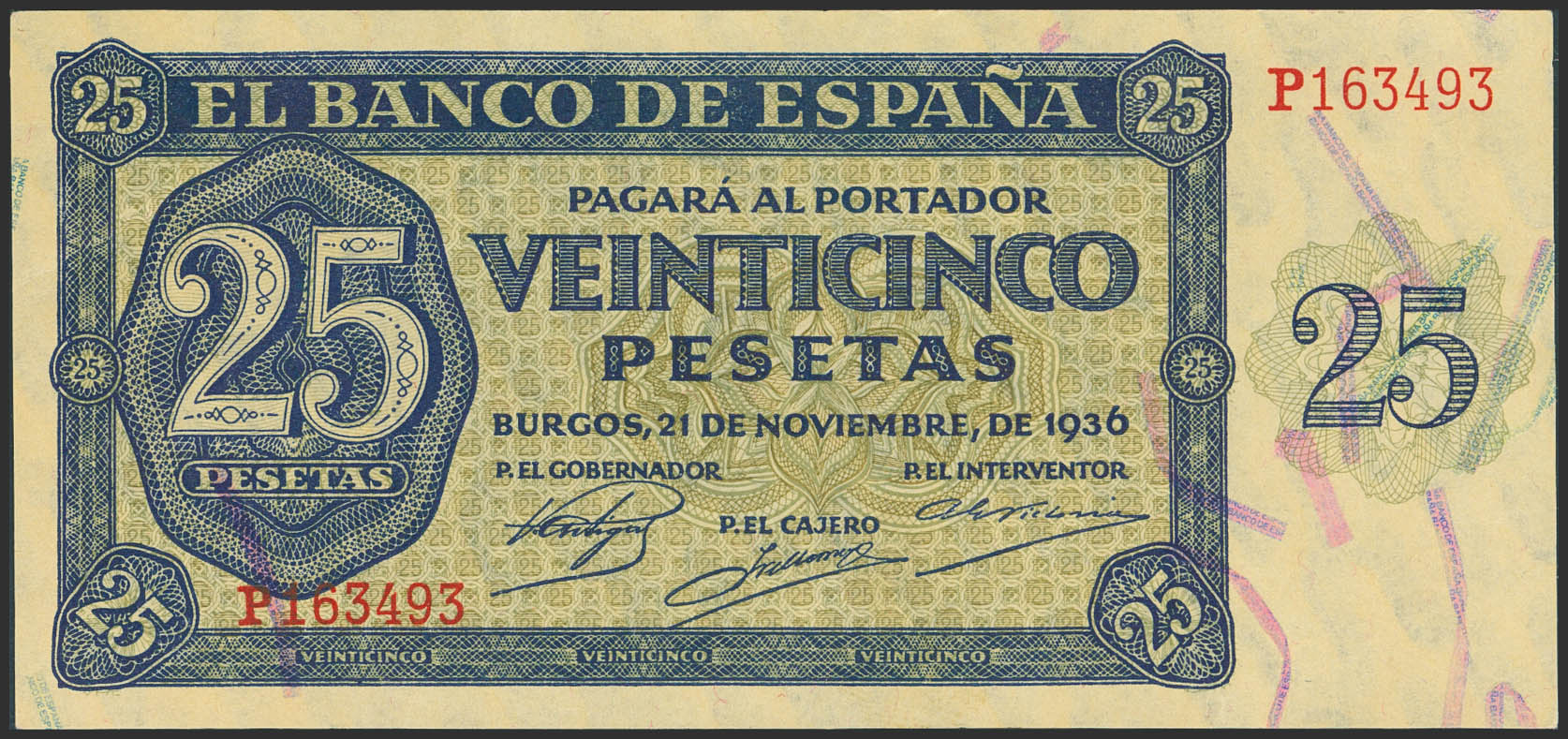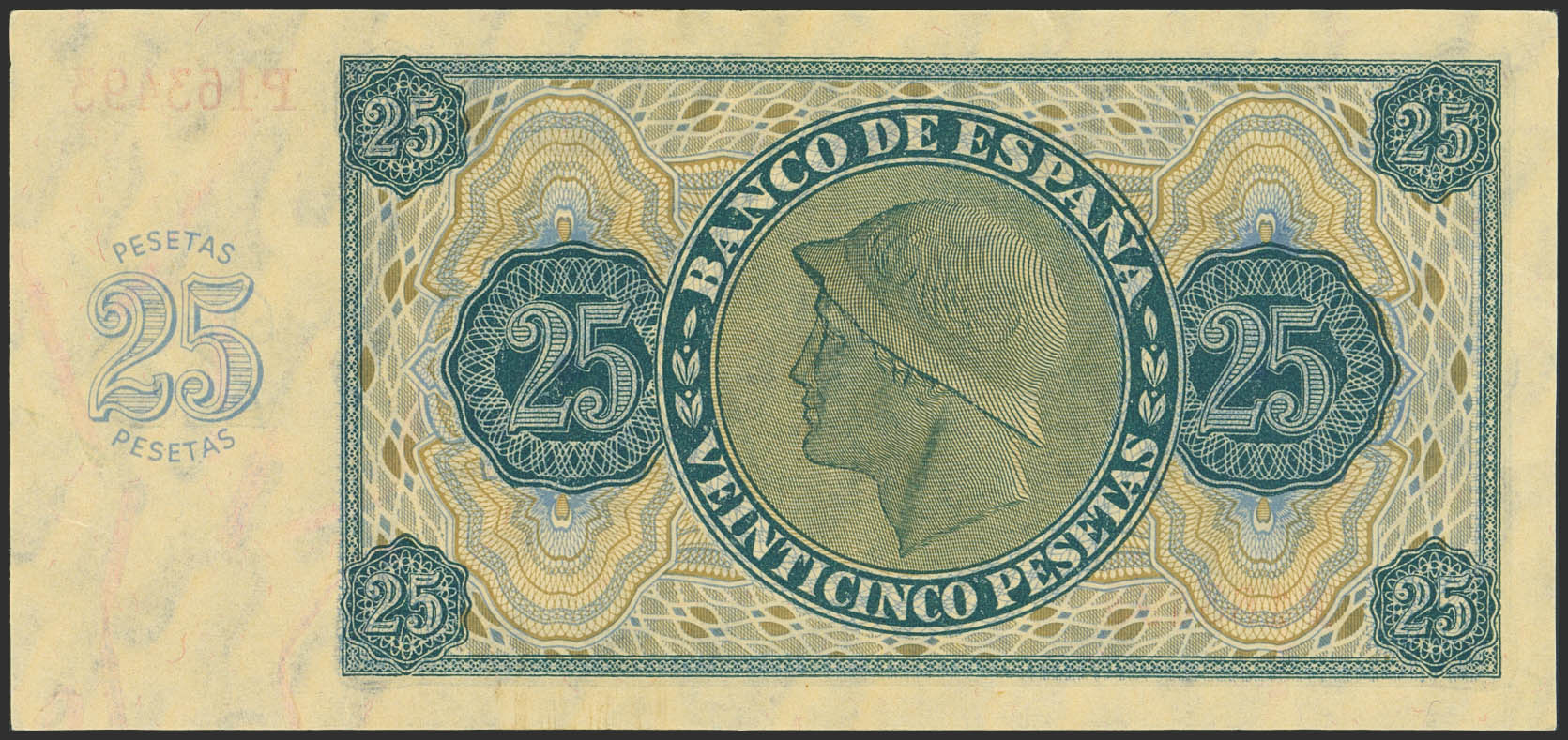 25 Pesetas. 21 de Noviembre de 1936. Serie P. (Edifil 2023: 419a). Conserva todo su apresto original. SC-.