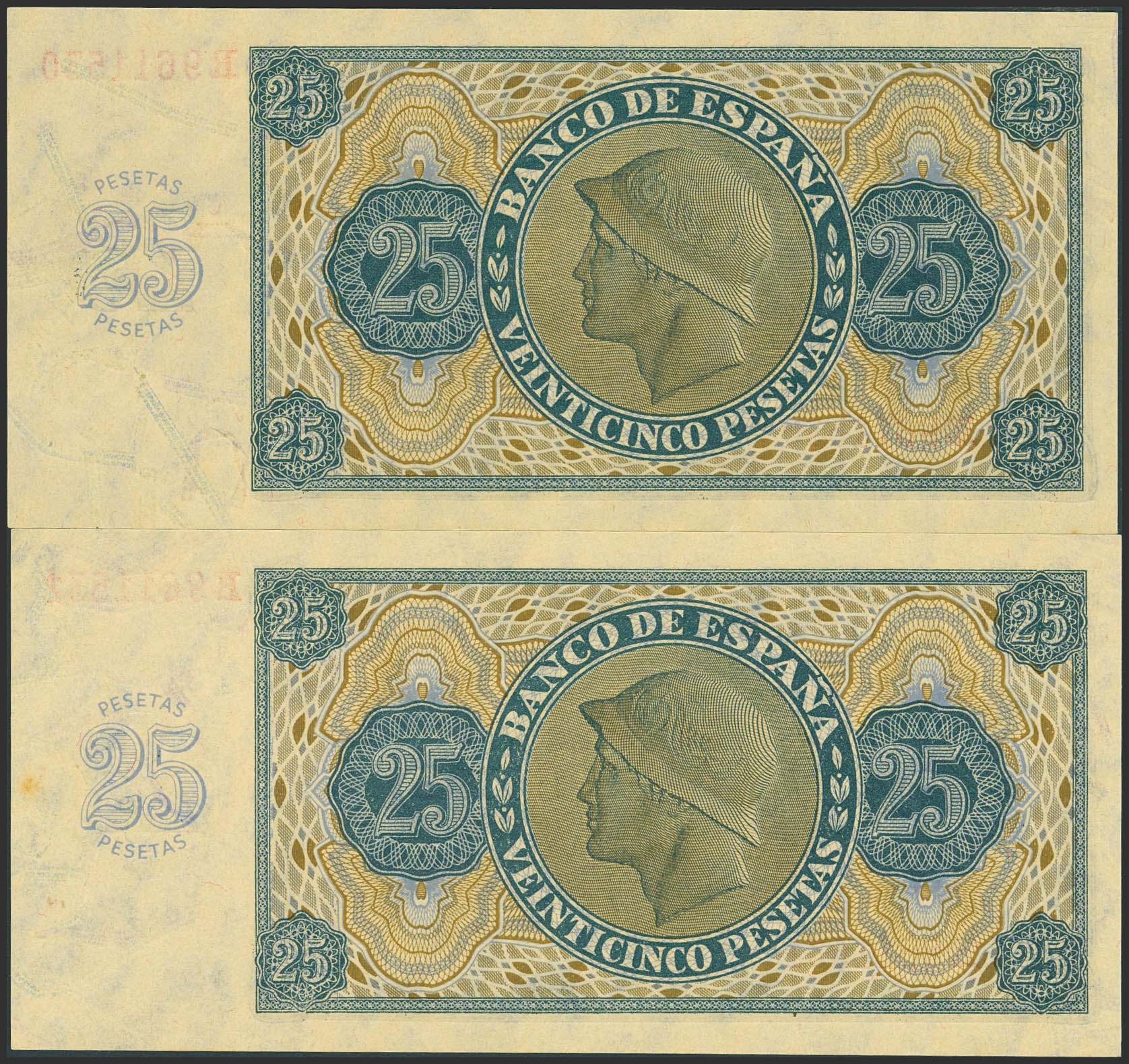25 Pesetas. 21 de Noviembre de 1936. Pareja correlativa. Serie R. (Edifil 2023: 419a). Apresto original. EBC++.