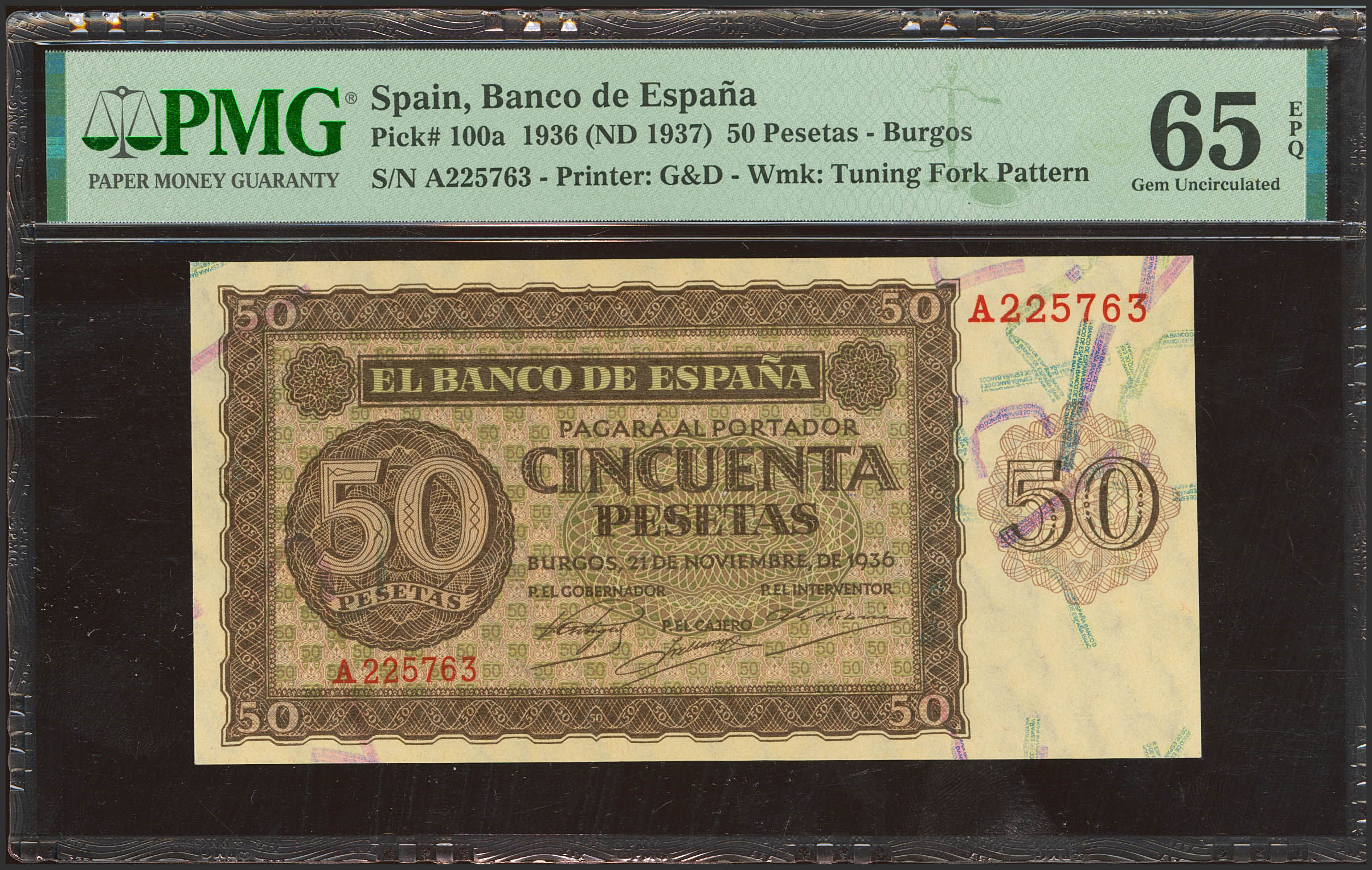 50 Pesetas. 21 de Noviembre de 1936. Serie A. (Edifil 2023: 420, Pick: 100a). Muy raro, especialmente en esta excepcional calidad, apresto original. SC. Encapsulado PMG65EPQ.