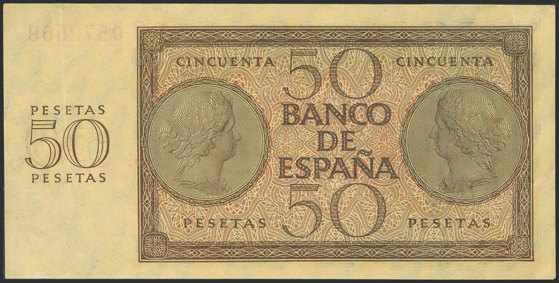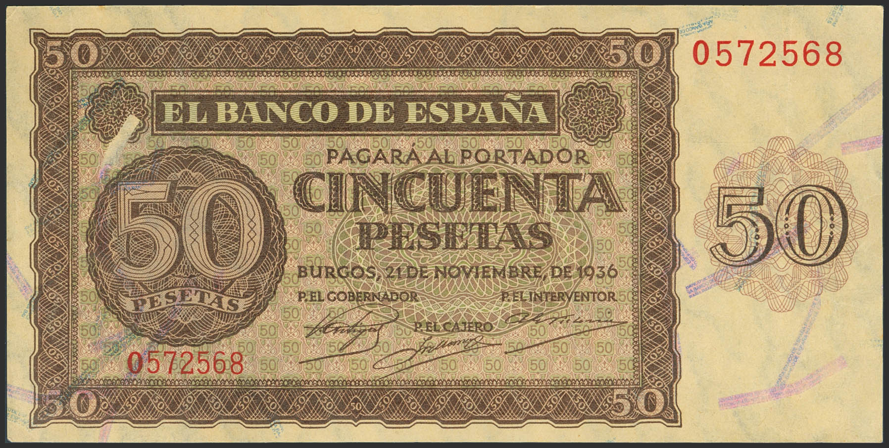 50 Pesetas. 21 de Noviembre de 1936. Serie O. (Edifil 2023: 420a). Conserva todo su apresto original. EBC++.