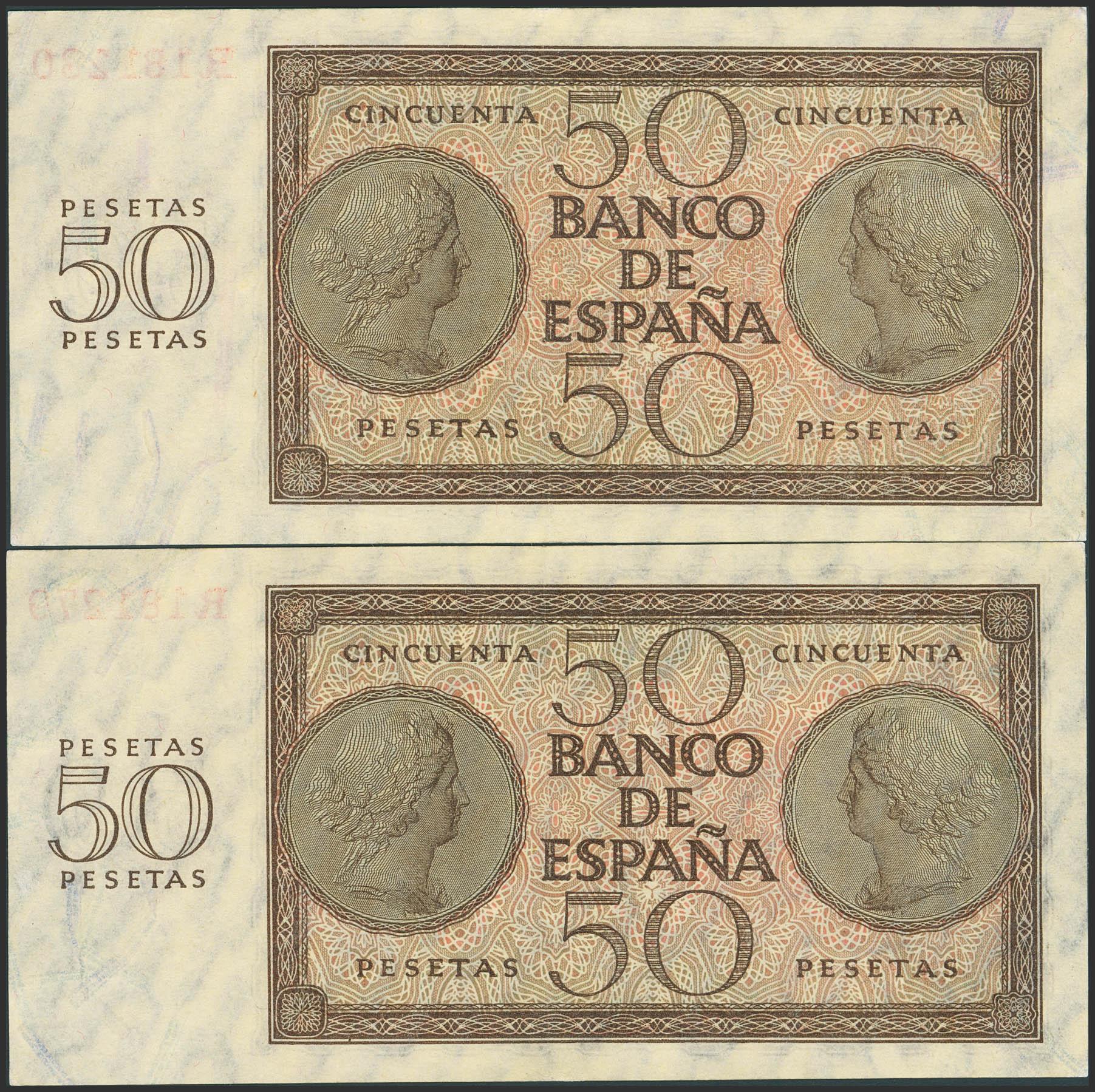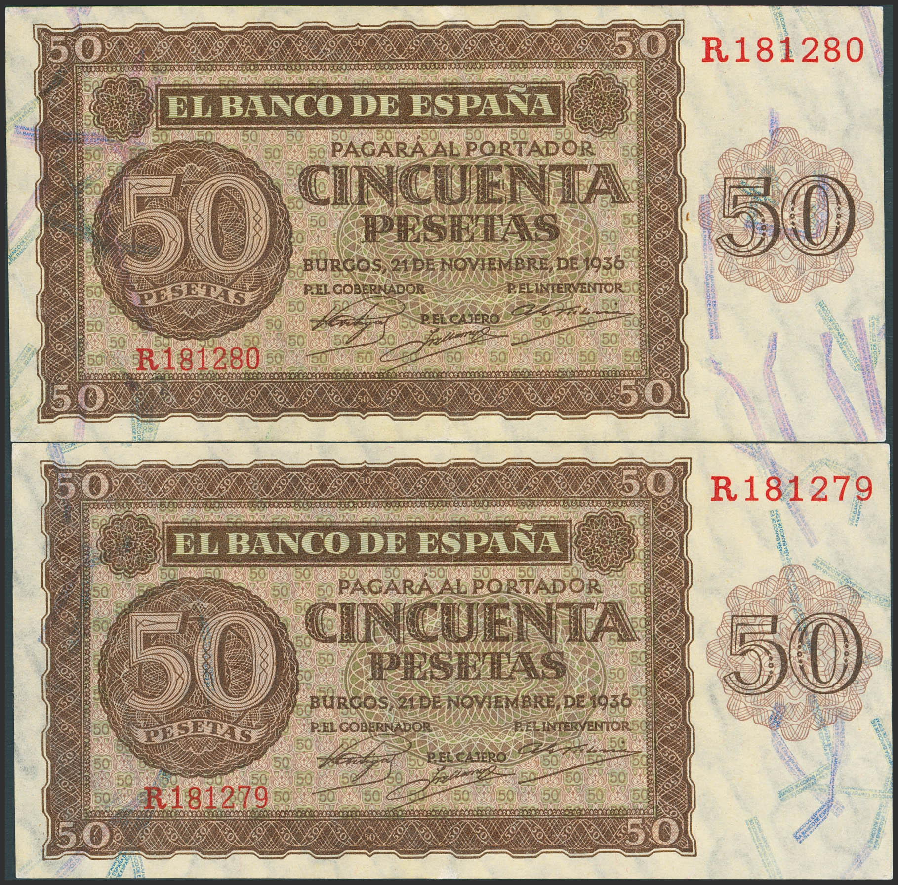 50 Pesetas. 21 de Noviembre de 1936. Pareja correlativa. Serie R. (Edifil 2023: 420a). Inusual. EBC-.