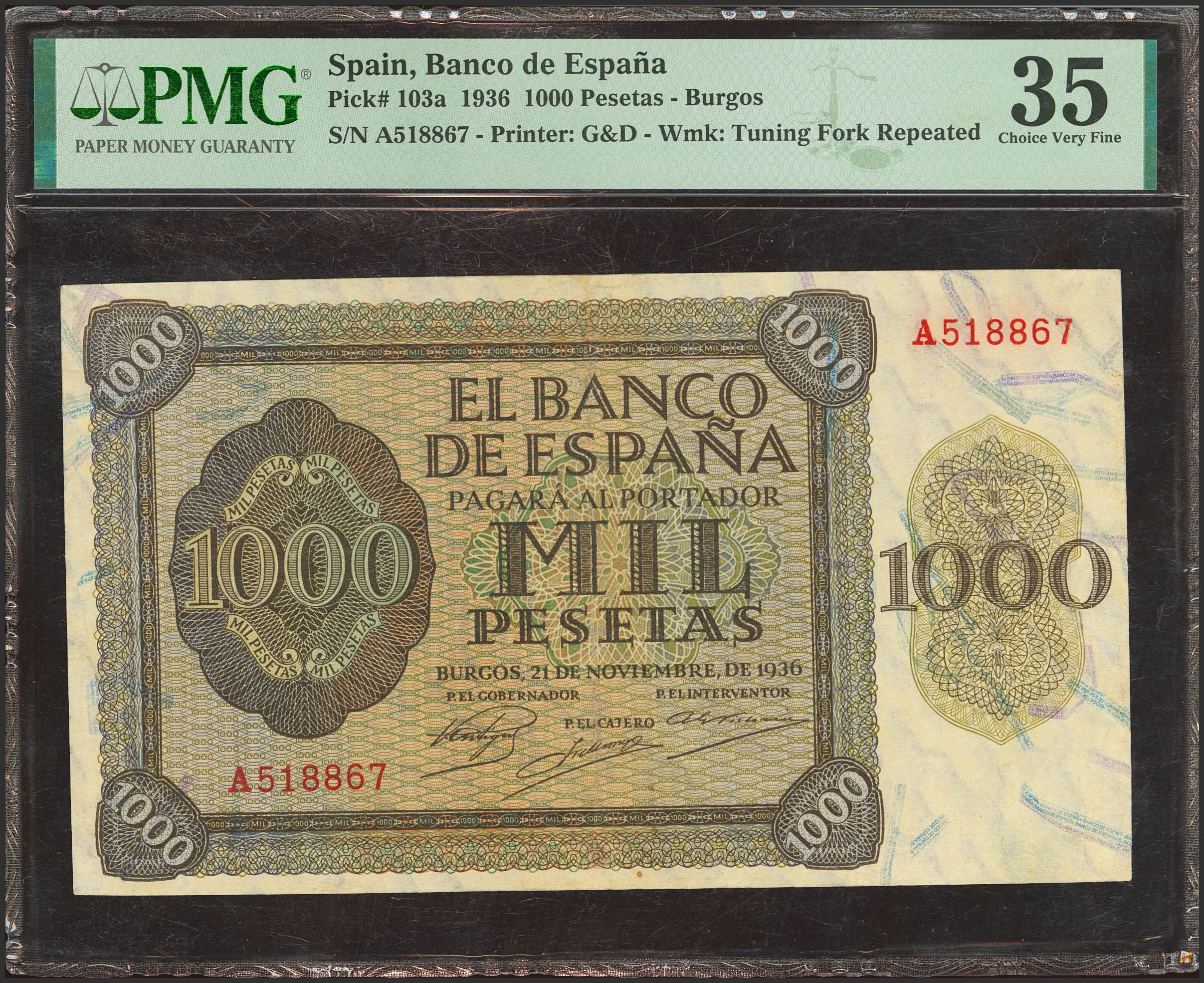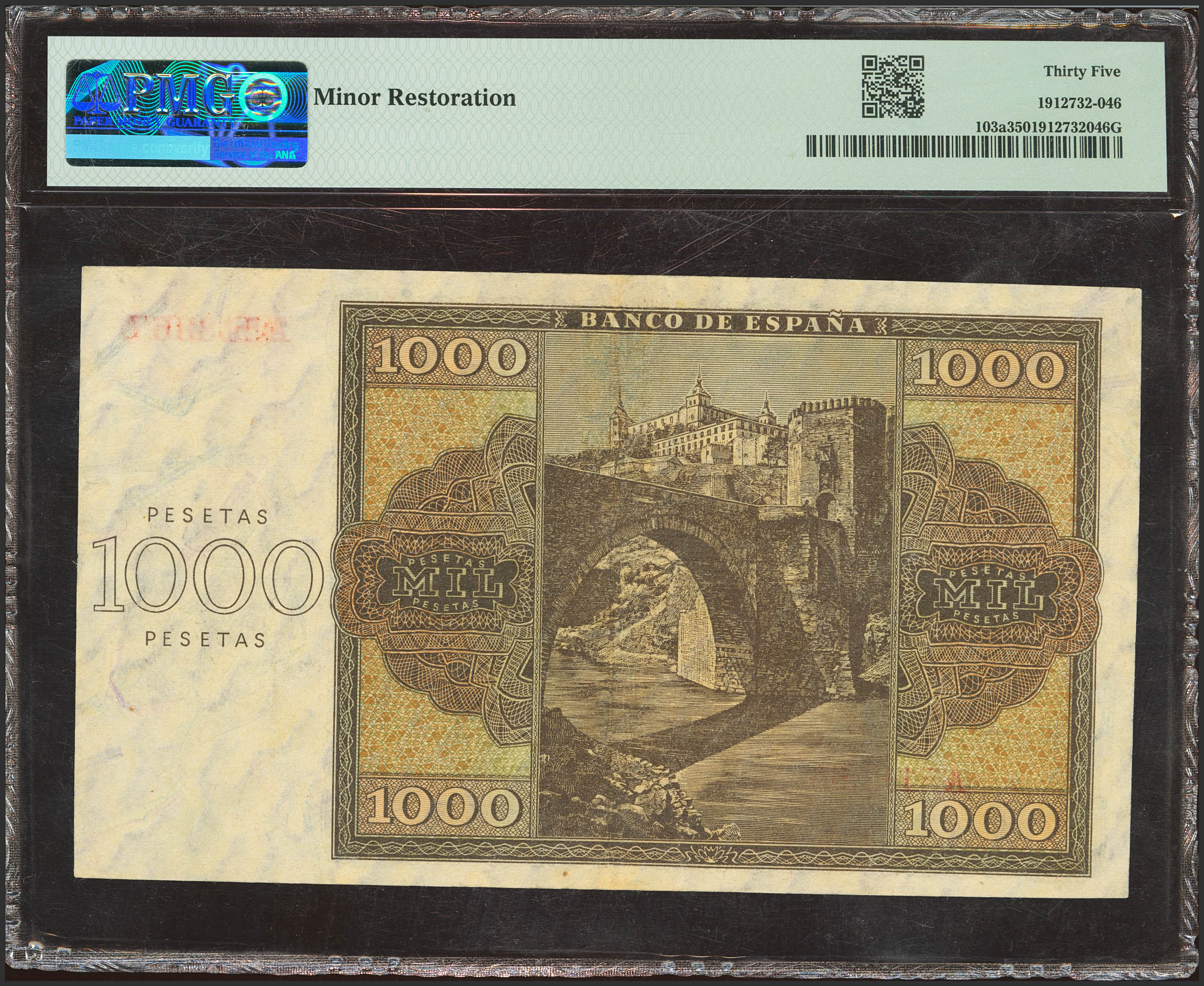 1000 Pesetas. 21 de Noviembre de 1936. Serie A. (Edifil 2023: 423, Pick: 103a). Inusual, mínimente reparado. EBC-. Encapsulado PMG35 (minor restoration).