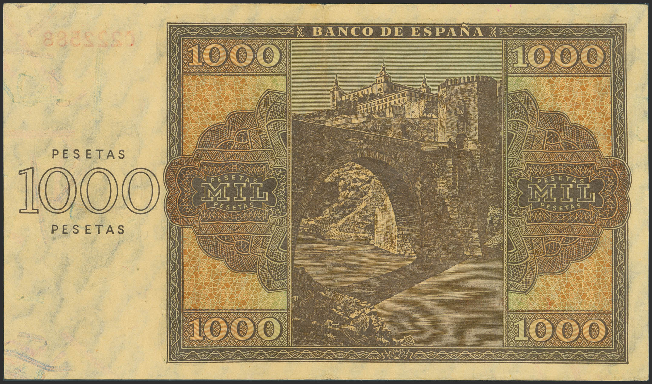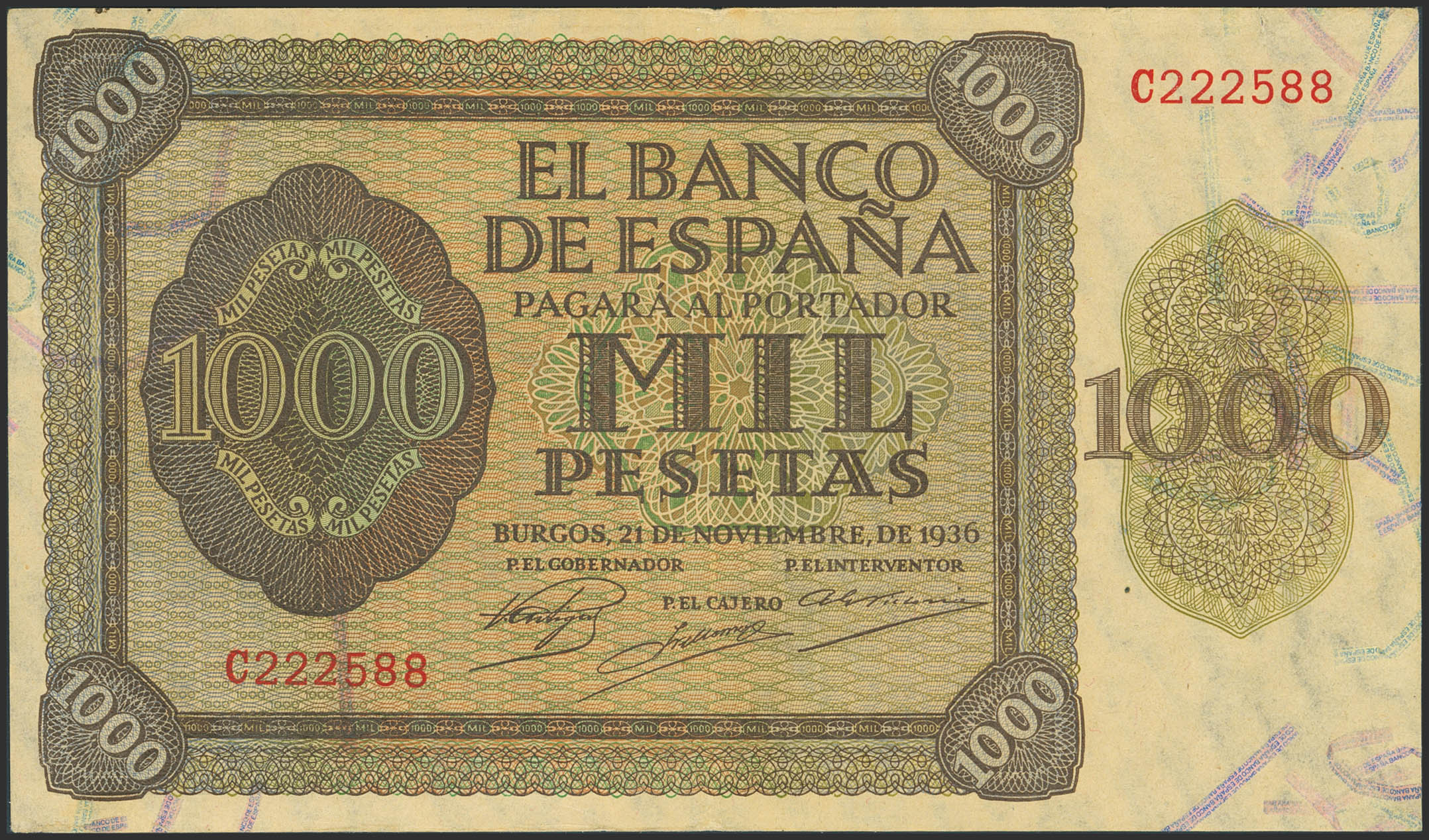 1000 Pesetas. 21 de Noviembre de 1936. Serie C, última serie emtida. (Edifil 2023: 423b, Pick: 103a). Muy raro en esta calidad, conservando parte de su apresto original. EBC+.