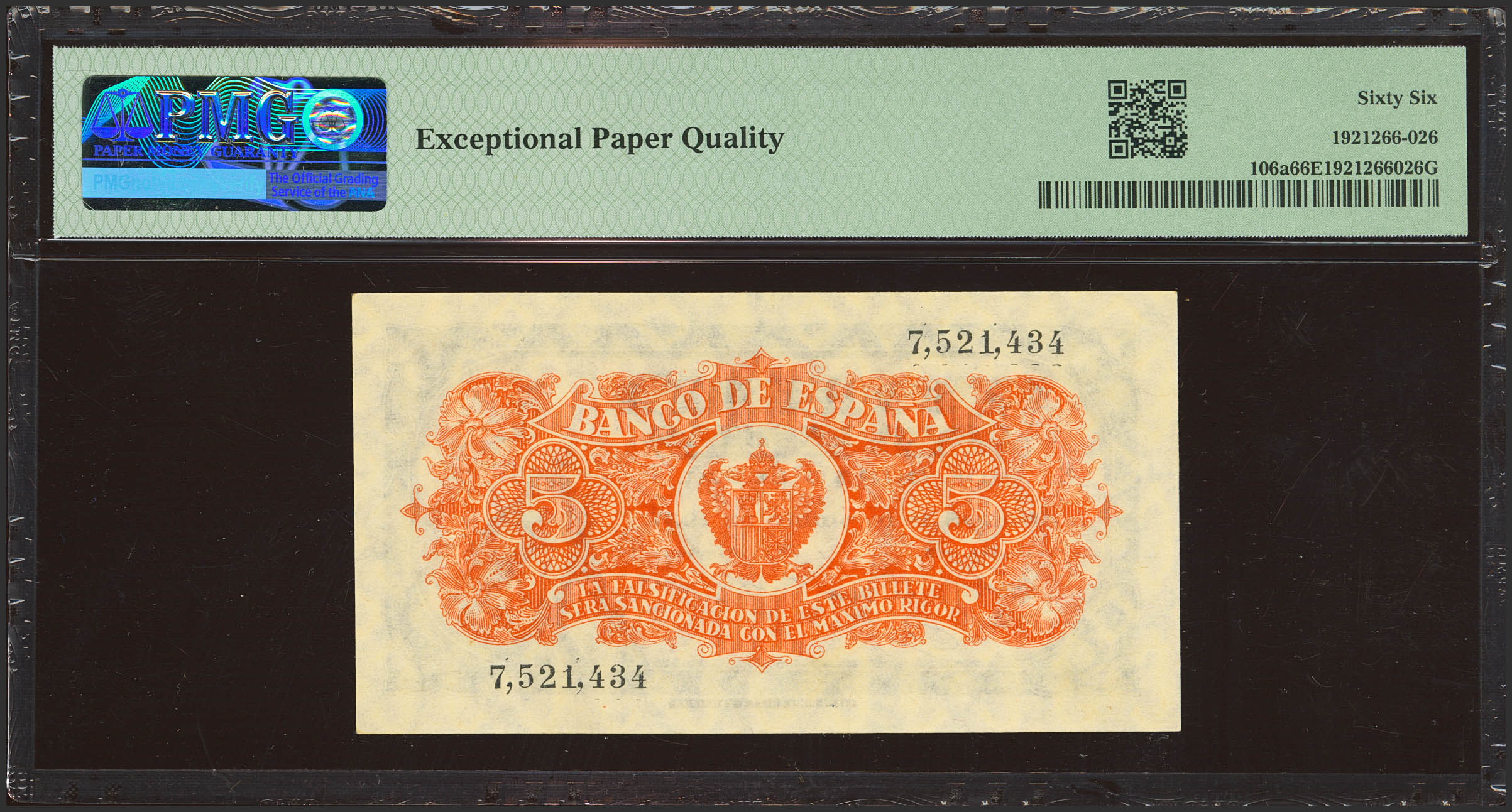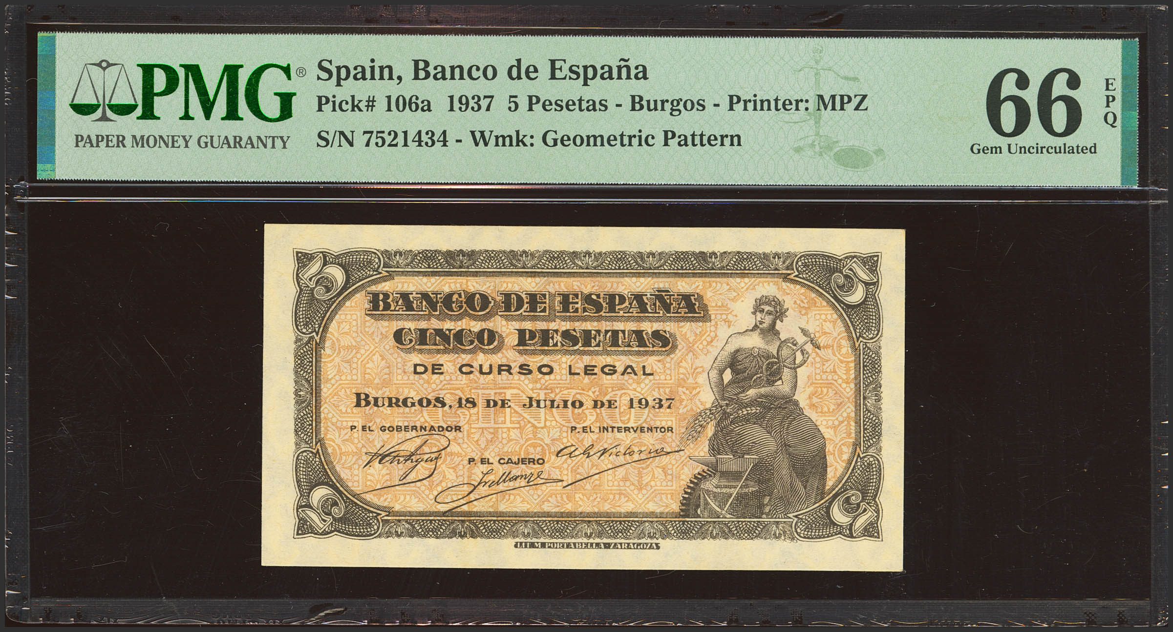 5 Pesetas. 18 de Julio de 1937. Sin serie. (Edifil 2023: 424, Pick: 106a). Muy raro en esta excepcional calidad, apresto original. SC. Encapsulado PMG66EPQ.