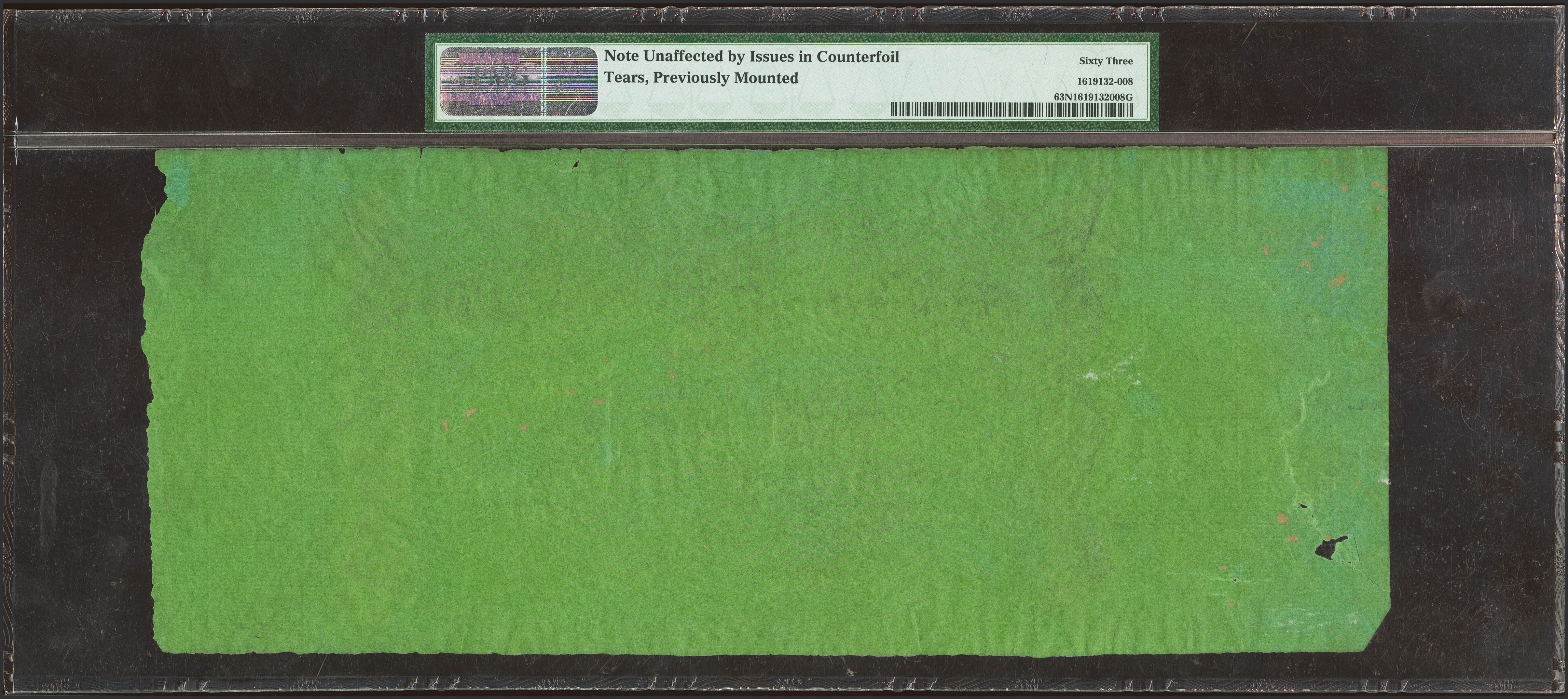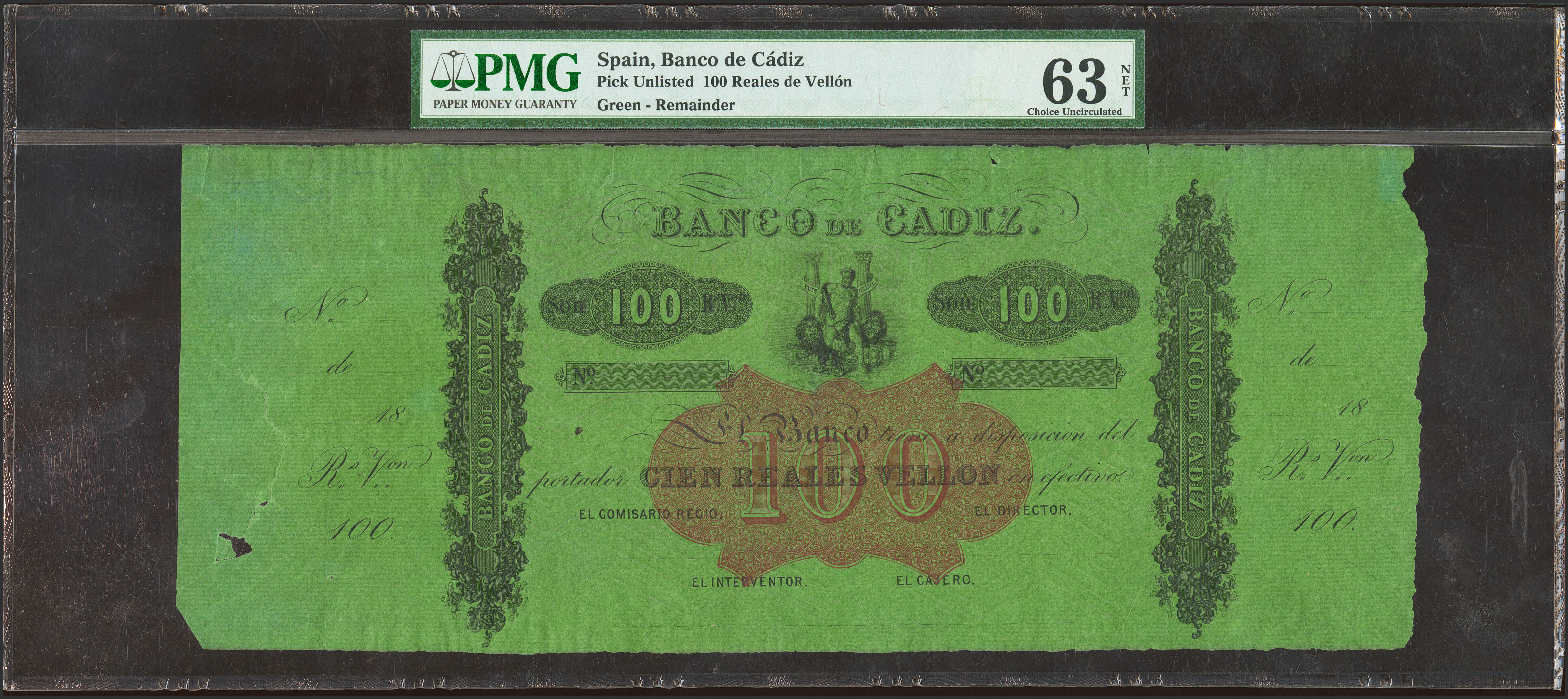 BANCO DE CADIZ. Emisión III. 100 Reales. Sin fechar, sin numeración, sin firmas y conservando las matrices. (Edifil 2023: 78, Pick: S291). Rarísimo, especialmente con las matrices (no catalogado sin matrices) y en esta excepcional calidad, previamente montado. SC. Encapsulado PMG63NET (tears, previously mounted).