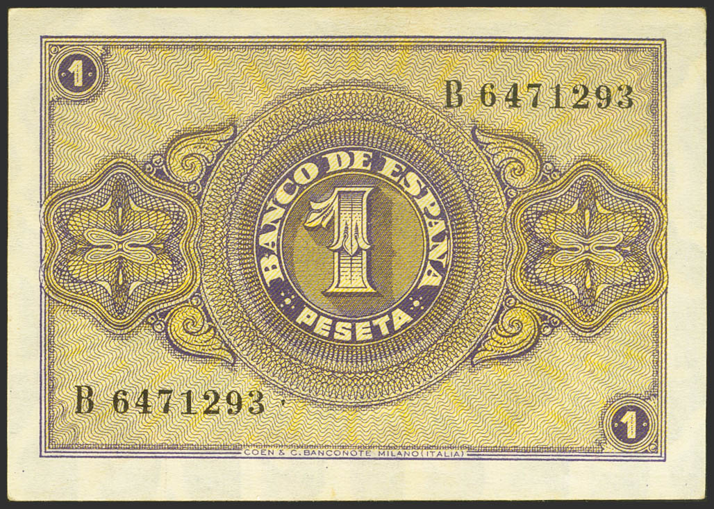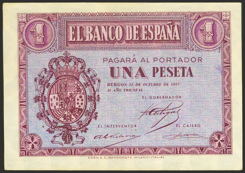 1 Peseta. 12 de Octubre de 1937. Serie B. (Edifil 2021: 425a). Conserva todo su apresto original. SC-.
