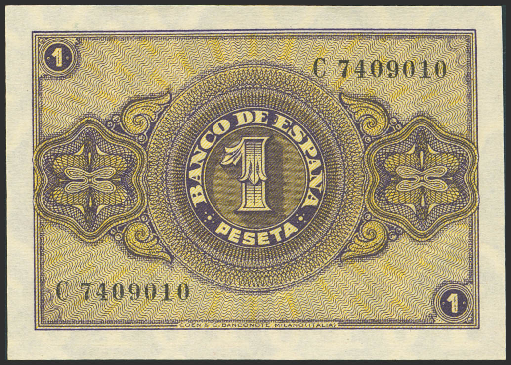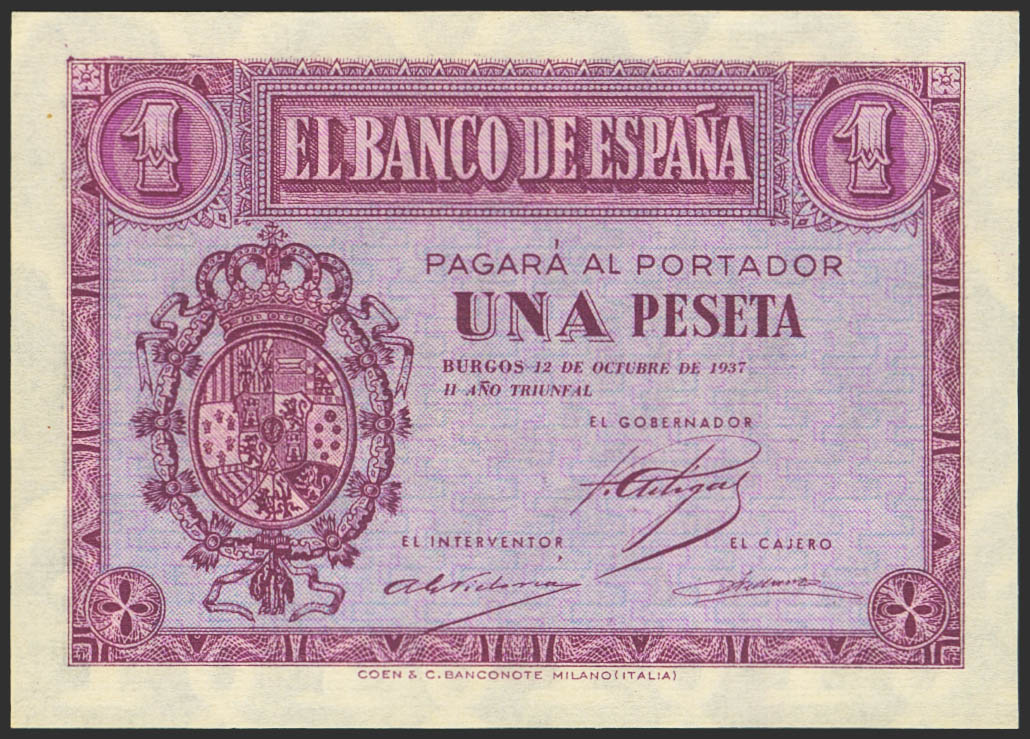 1 Peseta. 12 de Octubre de 1937. Serie C. (Edifil 2023: 425a). Conserva todo su apresto original. SC.