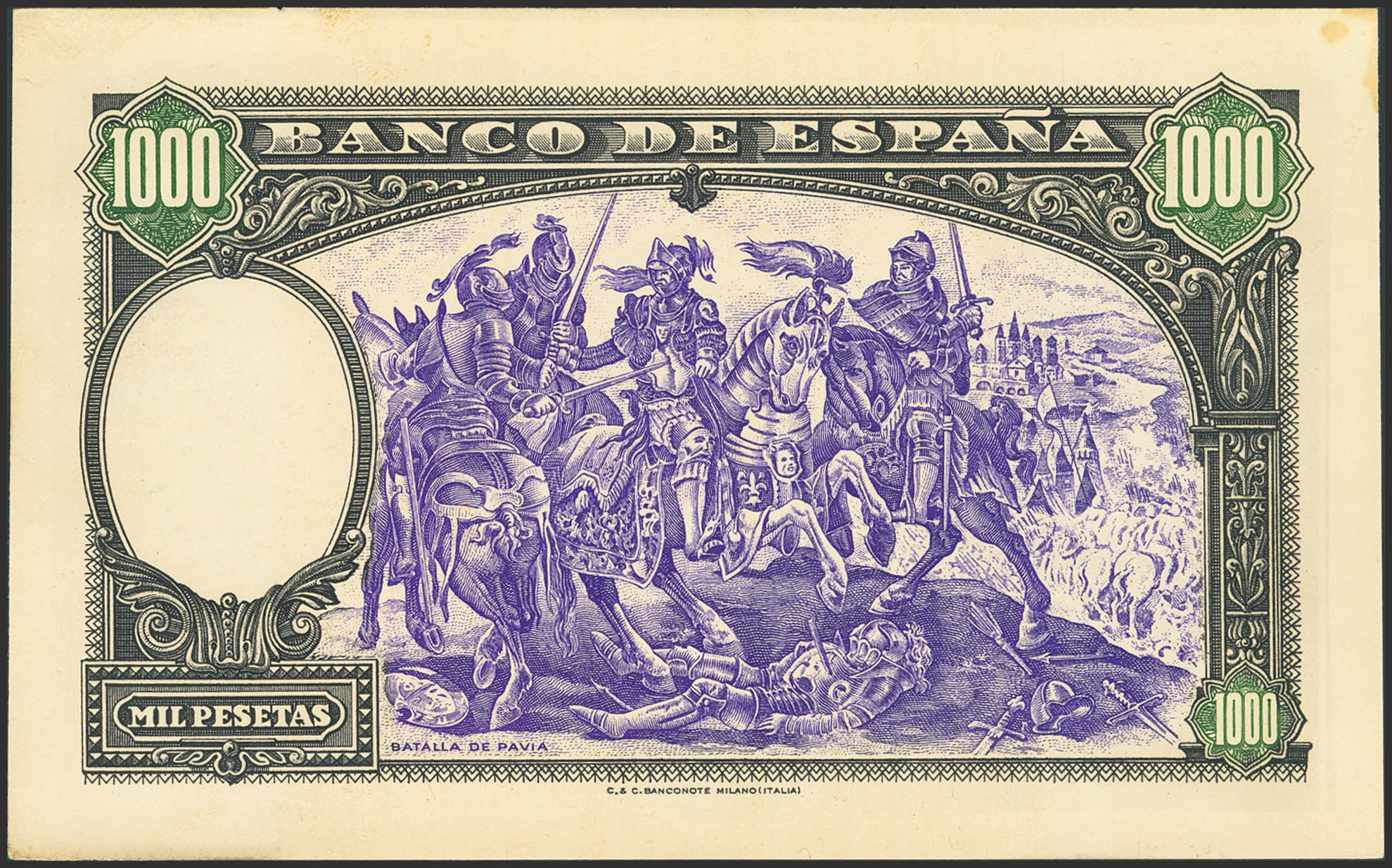 Prueba de anverso y reverso (Batalla de Pavia) de un billete no emitido de 1000 Pesetas, fechado el 18 de Julio de 1937. Sin numeración. (Edifil 2023: NE45P). Extraordinariamente rara. SC-.