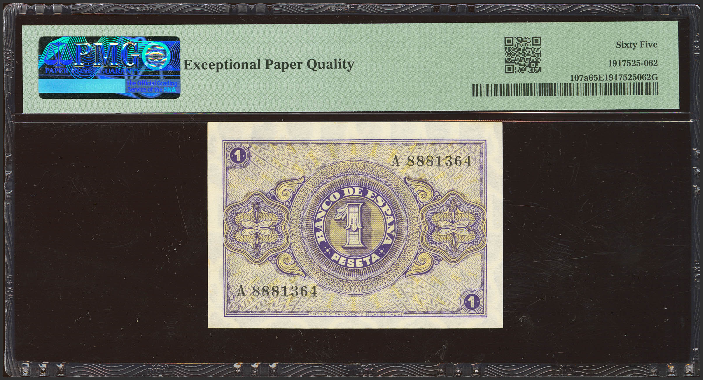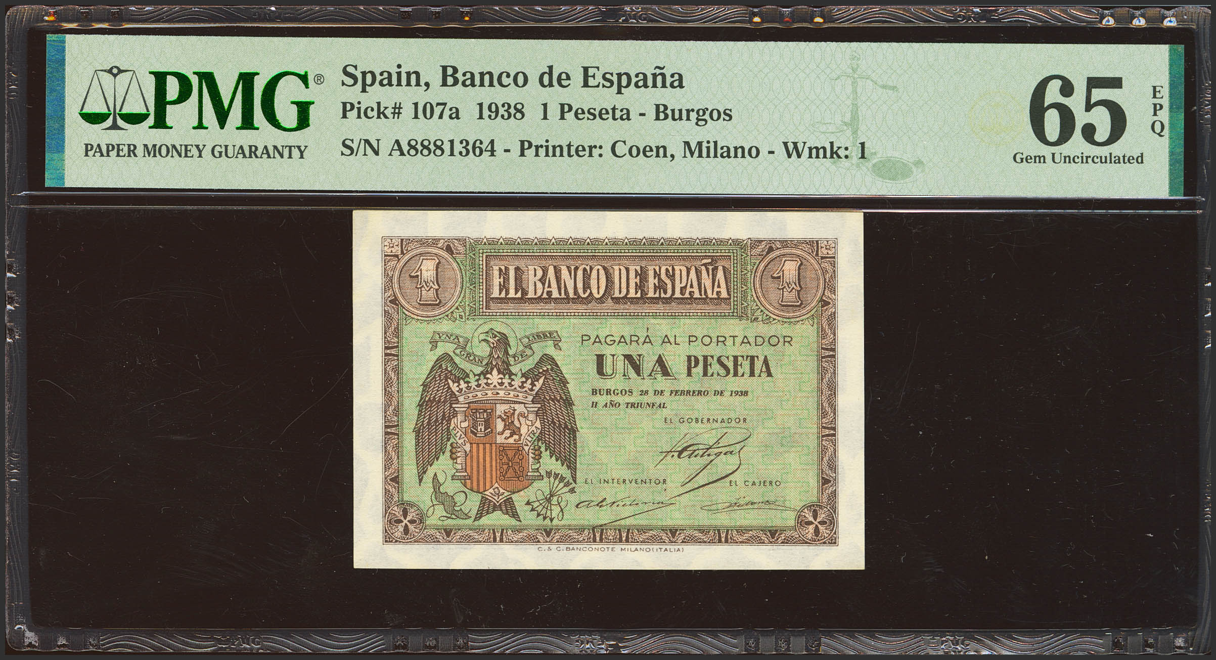 1 Pesetas. 28 de Febrero de 1938. Serie A. (Edifil 2023: 427, Pick: 107a). Apresto original. SC. Encapsulado PMG65EPQ.