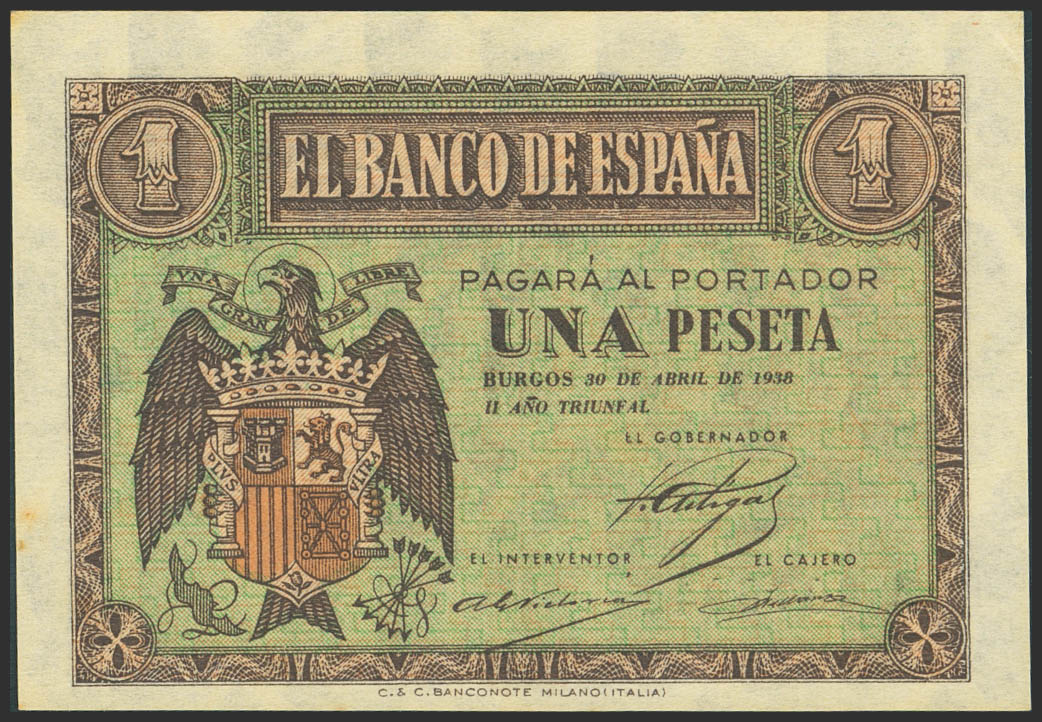 1 Pesetas. 30 de Abril de 1938. Serie A. (Edifil 2023: 428). Presenta gran parte de su apresto original, tonalizado. SC-.